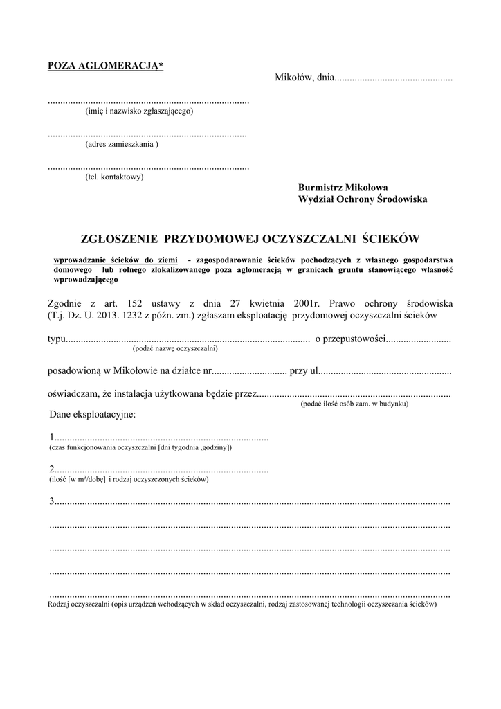 POZA AGLOMERACJĄ* Mikołów, dnia............................................... ................................................................................ (imię i nazwisko zgłaszającego) ............................................................................... (adres zamieszkania ) ................................................................................ (tel. kontaktowy) Burmistrz Mikołowa Wydział Ochrony Środowiska ZGŁOSZENIE PRZYDOMOWEJ OCZYSZCZALNI ŚCIEKÓW wprowadzanie ścieków do ziemi - zagospodarowanie ścieków pochodzących z własnego gospodarstwa domowego lub rolnego zlokalizowanego poza aglomeracją w granicach gruntu stanowiącego własność wprowadzającego Zgodnie z art. 152 ustawy z dnia 27 kwietnia 2001r. Prawo ochrony środowiska (T.j. Dz. U. 2013. 1232 z późn. zm.) zgłaszam eksploatację przydomowej oczyszczalni ścieków typu................................................................................................. o przepustowości.......................... (podać nazwę oczyszczalni) posadowioną w Mikołowie na działce nr.............................. przy ul..................................................... oświadczam, że instalacja użytkowana będzie przez............................................................................. (podać ilość osób zam. w budynku) Dane eksploatacyjne: 1..................................................................................... (czas funkcjonowania oczyszczalni [dni tygodnia ,godziny]) 2..................................................................................... (ilość [w m3/dobę] i rodzaj oczyszczonych ścieków) 3............................................................................................................................................................. ............................................................................................................................................................... ............................................................................................................................................................... ............................................................................................................................................................... ............................................................................................................................................................... Rodzaj oczyszczalni (opis urządzeń wchodzących w skład oczyszczalni, rodzaj zastosowanej technologii oczyszczania ścieków) 4.Informacja, czy stopień ograniczenia wielkości emisji jest zgodny z obowiązującymi przepisami: ........................................................................................................................................................... Minimalny procent redukcji zanieczyszczeń wskaźników ścieków wprowadzanych do indywidualnego systemu oczyszczania BZT5 – ........................................... % redukcji, zawiesiny ogólne - ...........................% redukcji 5. ............................................................................................................................................................ ............................................................................................................................................................... ............................................................................................................................................................... ............................................................................................................................................................... (warunki hydrogeologiczne gruntu: przepuszczalność gruntu, określić czy miejsce wprowadzania ścieków do ziemi jest oddzielone warstwą gruntu o miąższości co najmniej 1,5 m od najwyższego użytkowego poziomu wodonośnego wód podziemnych). 5. Podać na jakiej głębokości znajduje się dno urządzenia rozsączającego....................................... 6............................................................................................................................................................. ............................................................................................................................................................... (metody ograniczenia wielkości emisji) Niniejsze zgłoszenie przedkładam w terminie 30 dni przed rozpoczęciem eksploatacji. ........................................................... (podpis zgłaszającego) Załączniki: 1. opinia rozpoznania warunków gruntowo-wodnych na działce 2. mapa z zaznaczoną przydomową oczyszczalnią ścieków *Informację, czy dana działka znajduje się w aglomeracji, czy poza można sprawdzić na mapie w formie rastra na geoportalu gis.mikolow.eu moduł „Odpady oraz czystość i porządek”. W AGLOMERACJI * Mikołów, dnia............................................... ................................................................................ (imię i nazwisko zgłaszającego) ............................................................................... (adres zamieszkania ) ................................................................................ (tel. kontaktowy) Burmistrz Mikołowa Wydział Ochrony Środowiska ZGŁOSZENIE PRZYDOMOWEJ OCZYSZCZALNI ŚCIEKÓW wprowadzanie ścieków do ziemi - zagospodarowanie ścieków pochodzących z własnego gospodarstwa domowego lub rolnego zlokalizowanego w aglomeracji w granicach gruntu stanowiącego własność wprowadzającego Zgodnie z art. 152 ustawy z dnia 27 kwietnia 2001r. Prawo ochrony środowiska (T.j. Dz. U. 2013. 1232 z późn. zm.) zgłaszam eksploatację przydomowej oczyszczalni ścieków typu................................................................................................. o przepustowości.......................... (poda
