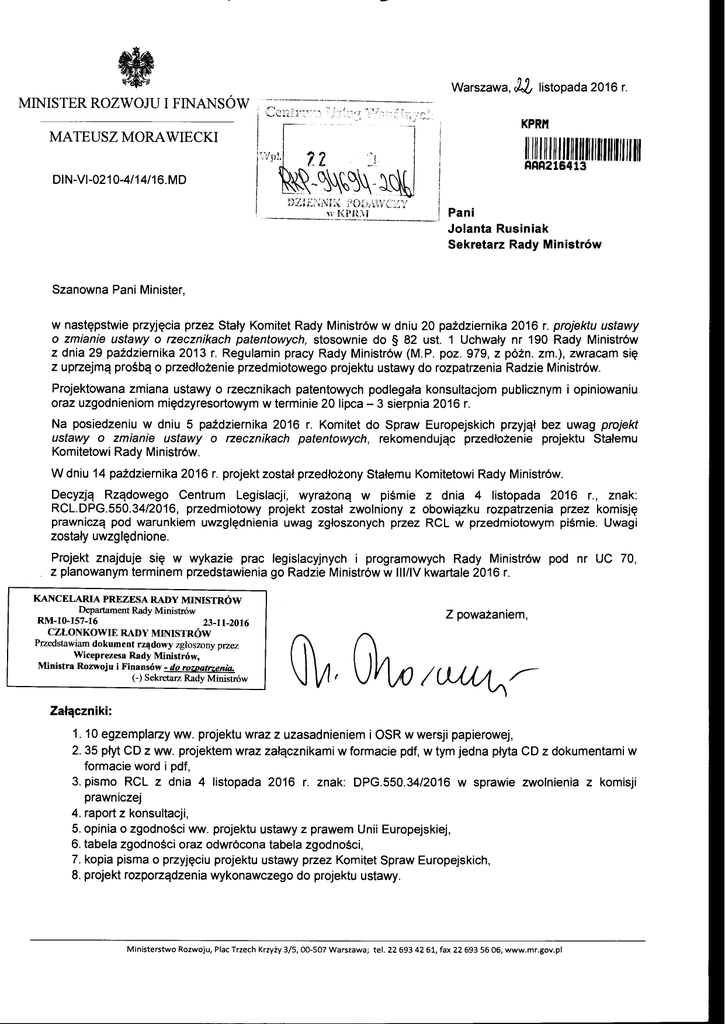 Warszawa, Jt listopada 2016 r. MINISTER ROZWOJU I FINANSÓW KPRM MATEUSZ MORA WIECKI 1111111111111111111111111111111111111 AAA216413 Dl N-VI-021 0-4/14/16. MD Pani Jolanta Rusiniak Sekretarz Rady Ministrów Szanowna Pani Minister, w następstwie przyjęcia przez Stały Komitet Rady Ministrów w dniu 20 października 2016 r. projektu ustawy o zmianie ustawy o rzecznikach patentowych, stosownie do § 82 ust. 1 Uchwały nr 190 Rady Ministrów z dnia 29 października 2013 r. Regulamin pracy Rady Ministrów (M.P. poz. 979, z późn. zm.), zwracam się z uprzejmą prośbą o przedłożenie przedmiotowego projektu ustawy do rozpatrzenia Radzie Ministrów. Projektowana zmiana ustawy o rzecznikach patentowych podlegała konsultacjom publicznym i opiniowaniu oraz uzgodnieniom międzyresortowym w terminie 20 lipca- 3 sierpnia 2016 r. Na posiedzeniu w dniu 5 października 2016 r. Komitet do Spraw Europejskich przyjął bez uwag projekt ustawy o zmianie ustawy o rzecznikach patentowych, rekomendując przedłożenie projektu Stałemu Komitetowi Rady Ministrów. W dniu 14 października 2016 r. projekt został przedłożony Stałemu Komitetowi Rady Ministrów. Decyzją Rządowego Centrum Legislacji, wyrażoną w piśmie z dnia 4 listopada 2016 r., znak: RCL.DPG.550.34/2016, przedmiotowy projekt został zwolniony z obowiązku rozpatrzenia przez komisję prawniczą pod warunkiem uwzględnienia uwag zgłoszonych przez RCL w przedmiotowym piśmie. Uwagi zostały uwzględnione. Projekt znajduje się w wykazie prac legislacyjnych i programowych Rady Ministrów pod nr UC 70, z planowanym terminem przedstawienia go Radzie Ministrów w III/IV kwartale 2016 r. KANCELARIA PREZESA RADY MINISTRÓW Departament Rady Ministrów RM-10-157-16 23-11-2016 CZŁONKOWIE RADY MINISTRÓW Przedstawiam dokument rządowy zgłoszony przez Wiceprezesa Rady Ministrów, Ministra Rozwoju i Finansów- do rozoatrzenia. (-) Sekretarz Rady Ministrów Z poważaniem, Załączniki: 1. 1Oegzemplarzy ww. projektu wraz z uzasadnieniem i OSR w wersji papierowej, 2. 35 płyt CD z ww. projektem wraz załącznikami w formacie pdf, w tym jedna płyta CD z dokumentami w formacie word i pdf, 3. pismo RCL z dnia 4 listopada 2016 r. znak: DPG.550.34/2016 w sprawie zwolnienia z komisji prawniczej 4. raport z konsultacji, 5. opinia o zgodności ww. projektu ustawy z prawem Unii Europejskiej, 6. tabela zgodności oraz odwrócona tabela zgodności, 7. kopia pisma o przyjęciu projektu ustawy przez Komitet Spraw Europejskich, 8. projekt rozporządzenia wykonawczego do projektu ustawy. Ministerstwo Rozwoju, Plac Trzech Krzyży 3/5, 00-507 Warszawa; te l. 22 693 42 61, fax 22 693 56 06, www.mr.gov.pl Projekt 20.10.2016 r. USTAW A z dnia .............. . ........ . ... ....... 20 16 r. o zmianie ustawy o rzecznikach patentowych Art. 1. W ustawie z dnia 11 kwietnia 200 1 r. o rzecznikach patentowych (Dz. U. z 2016 r. poz. 221 i 1579) wprowadza się l) nastę pujące zmiany: wart. 13: a) ust. 2 otrzymuje brzmienie: "2. Minister Sprawiedliwości, po zas ięgnięciu Krajowej Rady Rzeczników Patentowych, minimalne za czynności Urzędem sprzeciwu, stanowiące podstawę sąd Patentowym lub orzeczone przez spraw danego rodzaju oraz b) po ust. 2 dodaje "2a. Koszty zasą<Jzone się sąd wysokości wyższej w trybie do ustalenia kosztów Urząd Patentowy, m aj ąc lub orzeczone przez Urząd Patentowy, zawiłość nieprzekraczającej sześc io krotności sprawy oraz opłaty za niezbędny nakład czynności stosowanych przy wykonywanego przez rzecznika patentowego ust. 3; w art. 13a: a) uchyla się dodaje ust. 2, się rodzaj spraw, zawiłość mogą być ustalone w tej stawki, gdy przemawia za pracy rzecznika patentowego. W ust. 3-6 w brzmieniu: wysokości niższej niż w przepisach wykonawczych wydanych danego rodzaju, koszty są zasądzane przez Patentowy zgodnie z przedstawionym spisem kosztów.", się mogą być zasądzone mogą zostać rzeczni ka patentowego w czy nno śc iach uchyla spornego i w sprawie które względzie sprawiedliwości wykonywanego przez rzecznika patentowego, które na ppdstawie ust. 2, b) na stawki pracy rzecznika patentowego.", określ on ej 2) postępowania zastępstwa, okref lona na podstawie stawki minimalnej c) rozporządzenia, od stawki minimalnej , określonej w przepisach wykonawczych wydanych przyl adku ustalenia Urząd w drodze ust. 2a w brzmieni u: na podstawie ust. 2, lecz tym rodzaj i działając y m niezbędny nakład zastępstwa przez okre śl i, Patentowego oraz rzeczników patentowych przed organami wymiaru oraz przed przez Urzędu opinii Prezesa sąd zastępstwa lub orzekane przez - 2- "3. Skarb Państwa ponosi wyłączni e koszty nie opłaconej pomocy prawneJ udzielonej przez rzecznika patentowego ustanowionego z 4. W sprawie, w której kosztami korzystającej urzędu, urzędu. po stępowani a został obciążony przeciwnik strony z pomocy udzielonej przez rzecznika patentowego ustanowionego z koszty, o których mowa w ust. 3, sąd przyznaje po wykazaniu bezskuteczności ich egzekucji. 5. Koszty, o których mowa w ust. 3, obejm ują : l ) koszty zastępstwa postępowaniu w przed wysoko śc i sądami nie wyższej niż 150% stawek minimalnych w admi nistracyjnymi , określonych w przepisach wykonawczych wydanych na podstawie art. 13 ust. 2, oraz 2) niezbędne udokumentowane wydatki rzecznika patentowego. 6. Wniosek o przyznanie kosztów że koszty te nie zostały zapłacone ni eopłaconej w Art. 2. Ustawa wchodzi w życie po całości u pływi e pomocy prawnej zawiera lub w części. " . 30 dni od dnia ogłoszenia. oświadczenie ,