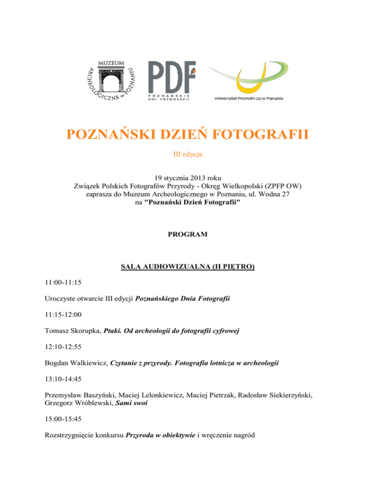 POZNAŃSKI DZIEŃ FOTOGRAFII III edycja 19 stycznia 2013 roku Związek Polskich Fotografów Przyrody - Okręg Wielkopolski (ZPFP OW) zaprasza do Muzeum Archeologicznego w Poznaniu, ul. Wodna 27 na "Poznański Dzień Fotografii" PROGRAM SALA AUDIOWIZUALNA (II PIĘTRO) 11:00-11:15 Uroczyste otwarcie III edycji Poznańskiego Dnia Fotografii 11:15-12:00 Tomasz Skorupka, Ptaki. Od archeologii do fotografii cyfrowej 12:10-12:55 Bogdan Walkiewicz, Czytanie z przyrody. Fotografia lotnicza w archeologii 13:10-14:45 Przemysław Baszyński, Maciej Lelonkiewicz, Maciej Pietrzak, Radosław Siekierzyński, Grzegorz Wróblewski, Sami swoi 15:00-15:45 Rozstrzygnięcie konkursu Przyroda w obiektywie i wręczenie nagród 16:00-16:45 Piotr Tryjanowski, Dlaczego samce ptaków (i nie tylko) są tak piękne? 17:00-17:45 Bartosz Stróżyński, Ekstremalna fotografia podwodna FOYER PRZY SALI AUDIOWIZUALNEJ (II PIĘTRO) 11:00-18:00 Wystawa prac nagrodzonych w konkursie Przyroda w obiektywie SALA DYDAKTYCZNA (PARTER) 11:00-13:00 Archeo-przygoda z przyrodą – edukacyjne warsztaty przyrodnicze dla dzieci Po co archeologowi znajomość przyrody? Czy widok z lotu ptaka jest lepszy niż ten z perspektywy żaby? Jak w przeszłości człowiek radził sobie z naturą? Jeśli chcesz poznać odpowiedzi na te pytania i dowiedzieć się, jak archeologowie korzystają z przyrody i nauk przyrodniczych, by odkryć przeszłość naszych przodków, wstąp do Muzeum Archeologicznego w Poznaniu 19.01.2013 roku o godz. 11:00 na warsztaty dla dzieci. Wiek uczestników: 5-10 lat Wstęp na warsztaty: 4 zł od osoby Zapisy w kasie muzealnej od 16 do 18 stycznia 2013 roku w godz. 10:00-15:00. SALA WYSTAW CZASOWYCH (PARTER) 11:00-18:00 Prezentacje sprzętu fotograficznego i wydawnictw o tematyce przyrodniczej. SONY SIGMA PRO-CENTRUM RAYSFOTO PRZYRODNICZE.PL OGAMI Polskie Towarzystwo Ochrony Przyrody „Salamandra” Zespół Parków Krajobrazowych Województwa Wielkopolskiego Regionalna Dyrekcja Lasów Państwowych w Poznaniu, Nadleśnictwo Łopuchówko IMPREZY TOWARZYSZĄCE Wystawy zdjęć członków Okręgu Wielkopolskiego ZPFP Wydział Leśny Uniwersytetu Przyrodniczego w Poznaniu, ul. Wojska Polskiego 28 8.01-15.02.2013 r., godz. 8:00-19:00 Galeria Handlowa Pestka, Poznań, Al. Solidarności 47 8.01-8.02.2013 r., godz. 8:00-21:00 Wstęp wolny.