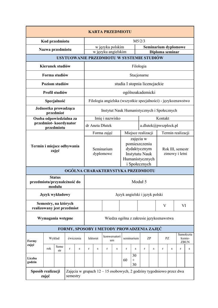 KARTA PRZEDMIOTU Kod przedmiotu w języku polskim w języku angielskim Nazwa przedmiotu M5/2/3 Seminarium dyplomowe Diploma seminar USYTUOWANIE PRZEDMIOTU W SYSTEMIE STUDIÓW Kierunek studiów Filologia Forma studiów Stacjonarne Poziom studiów studia I stopnia licencjackie Profil studiów ogólnoakademicki Specjalność Filologia angielska (wszystkie specjalności) - językoznawstwo Jednostka prowadząca przedmiot Osoba odpowiedzialna za przedmiot- koordynator przedmiotu Instytut Nauk Humanistycznych i Społecznych Imię i nazwisko Kontakt dr Aneta Dłutek Termin i miejsce odbywania zajęć [email protected] Forma zajęć Miejsce realizacji Termin realizacji Seminarium dyplomowe zajęcia w pomieszczeniu dydaktycznym Instytutu Nauk Humanistycznych i Społecznych Rok III, semestr zimowy i letni OGÓLNA CHARAKTERYSTYKA PRZEDMIOTU Status przedmiotu/przynależność do modułu Moduł 5 Język wykładowy Język angielski i język polski Semestry, na których realizowany jest przedmiot V VI Wiedza ogólna z zakresie językoznawstwa Wymagania wstępne FORMY, SPOSOBY I METODY PROWADZENIA ZAJĘĆ Formy zajęć Wykład rok Seme str Liczba godzin Sposób realizacji zajęć ćwiczenia r s lektorat r s konwersatori seminarium um r s r s 60 30 + 30 ZP r Samokszta łcenieZBUN PZ s r s r Zajęcia w grupach 12 – 15 osobowych, 2 godziny tygodniowo przez dwa semestry s Sposób zaliczenia zajęć Zaliczenie na ocenę Metody dydaktyczne Słowne i praktyczne Przedmioty powiązane/moduł Moduł 5 Aronoff, M. [et al.]. 2003. The handbook of linguistics. Blackwell. Wray, A, A. Bloomer. 2006. Projects in Linguistics : A Practical Guide to Researching Language. 2006 London: Hodder Arnold. Bassnett S. (2002) Translation Studies, Routledge Taylor & Francis Group, London and New York Biber, D., S. Johansson, G. Leech, S. Conrad and E. Finegan. 1999. Longman Grammar of Spoken and Written English. London: Longman. Krzeszowski, T. 1990. Contrasting Languages: The Scope of Contrastive Linguistics. Berlin: Mouton de Gruyter. Lakoff, George & Mark Johnson. 1980. Metaphors We Live By. Chicago: The University of Chicago. Podstawowa Lewandowska-Tomaszczyk B. [red.]. 2005. Podstawy językoznawstwa korpusoweg. Łódź: Wydawnictwo Uniwersytetu Łódzkiego. Lewandowska-Tomaszczyk B. [red.]. 2012. New ways to language. Łódź: Wydawnictwo Uniwersytetu Łódzkiego Wykaz literatury Pieńkos, J. 2003. Podstawy przekładoznawstwa. Od teorii do praktyki. Kraków: Kantor Wydawniczy Zakamycze. Pilch, T. 1998. Zasady badań pedagogicznych. Warszawa: Wydawnictwo Akademickie „Żak”. Quirk, R., S. Greenbaum, G. Leech and J. Svartvik. 2003. A Comprehensive Grammar of the English Language. London: Longman. Tabakowska, E. 2001. Językoznawstwo kognitywne a poetyka przekładu. Kraków: Towarzystwo Autorów i Wydawców Prac Naukowych Universitas. Baker M. 1998. Routledge Encyclopedia of Translation Studies, Routledge Taylor & Francis Group, London and New York. Brzeziński, J. 1984. Elementy metodologii badań psychologicznych. Warszawa Uzupełni Lewandowska-Tomaszczyk, B. (ed). 2008. Corpus Linguistics, Computer Tools, and Applications - State of the Art: PALC 2007. Peter Lang. ająca Mańczak-Wohlfeld, E. 1994. Angielskie elementy leksykalne w języku polskim. Kraków: Universitas. Tabakowska, E. (red.). 2001. Kognitywne podstawy języka i językoznawstwa. Kraków: Towarzystwo Autorów i Wydawców Prac Naukowych Universitas. Tomaszkiewicz, T. (przekład i adaptacja). 2006. Terminologia tłumaczenia, Poznań: Wydawnictwo Naukowe UAM. Willim, E. and E. Mańczak-Wohlfeld. 1997. A Contrastive Approach to Problems with English. Warszawa: PWN. Wojciechowski T. 1999. Jak pisać prace dyplomowe, licencjackie i magisterskie. Warszawa: Wydawnictwo Wyższej Szkoły Zarządzania i Marketingu. Wojtasiewicz, O. 2005. Wydawnictwo TEPIS. Wstęp do teorii tłumaczenia. Warszawa: Wojcik K. 2012. Piszę akademicką pracę promocyjną – licencjacką, magisterską, doktorską. Warszawa: Wydawnictwo Wolters Kluwer Polska, Sp. z o.o. CELE, TREŚCI I EFEKTY KSZTAŁCENIA Cele przedmiotu (ogólne, szczegółowe) C1- zapoznanie studentów z podstawami badań w zakresie pisania poszczególnych rozdziałów pracy licencjackiej z uwzględnieniem części teoretycznej i badawczej C2- opracowanie koncepcji badań własnych C3 – prezentacja najnowszych osiągnięć w zakresie przedmiotu zainteresowań badawczych C4 – kształcenie umiejętności analizy przyczyn, przebiegu i następstw oraz poszukiwania optymalnych rozwiązań C5 – nabycie umiejętności redagowania pracy dyplomowej Treści programowe Efekty Forma kształcenia zajęć Temat Liczba godzin W01, W02, W03, W04, Podstawowe zasady U01, U02, Seminarium pisania pracy 2 U03, U04, licencjackiej. U05, K01, K02 W01, W02, W03, W04, U01, U02, Przegląd literatury Seminarium 2 przedmiotu. U03, U04, U05, K01, K02 W01, W02, W03, W04, Badania jakościowe i U01, U02, Seminarium ilościowe, porównawcze 4 U03, U04, i przeglądowe. U05, K01, K02 Suma liczby godzin 2 2 4 W01, W02, W03, W04, U01, U02, U03, U04, U05, K01, K02 W01, W02, W03, W04, U01, U02, U03, U04, U05, K01, K02 W01, W02, W03, W04, U01, U02, U03, U04, U05, K01, K02 W01, W02, W03, W04, U01, U02, U03, U04, U05, K01, K02 W01, W02, W03, W04, U01, U02, U03, U04, U05, K01, K02 W01, W02, W03, W04, U01, U02, U03, U04, U05, K01, K02 W01, W02, W03, W04, U01, U02, U03, U04, U05, K01, K02 W01, W02, W03, W04, U01, U02, U03, U04, U05, K01, K02 W01, W02, W03, W04, U01, U02, U03, U04, Metodologia badań Seminarium naukowych – podstawy teoretyczne. 2 2 Schemat i organizacja Seminarium badań własnych. Cel i przedmiot badań. 4 4 Seminarium Procedury prowadzenia badań. 2 2 Seminarium Metody danych. 2 2 Etapy badania Seminarium naukowego, problemy i hipotezy robocze. 4 4 Sformułowanie problemów i Seminarium badawczych. zmiennych wskaźników. hipotez Dobór i 10 10 Omówienie i dobór właściwych metod, Seminarium technik i narzędzi badawczych. 8 8 4 4 2 2 zbier