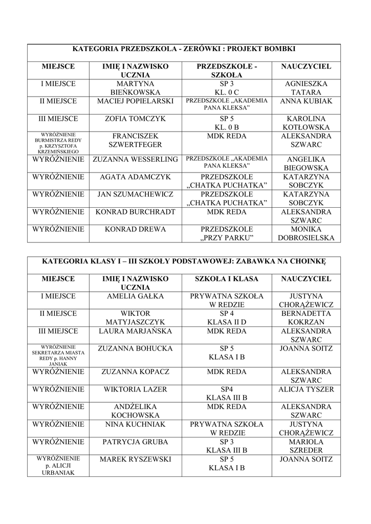 KATEGORIA PRZEDSZKOLA - ZERÓWKI : PROJEKT BOMBKI II MIEJSCE IMIĘ I NAZWISKO UCZNIA MARTYNA BIEŃKOWSKA MACIEJ POPIELARSKI III MIEJSCE ZOFIA TOMCZYK WYRÓŻNIENIE BURMISTRZA REDY p. KRZYSZTOFA KRZEMIŃSKIEGO FRANCISZEK SZWERTFEGER WYRÓŻNIENIE MIEJSCE I MIEJSCE PRZEDSZKOLE SZKOŁA SP 3 KL. 0 C PRZEDSZKOLE „AKADEMIA PANA KLEKSA” NAUCZYCIEL AGNIESZKA TATARA ANNA KUBIAK SP 5 KL. 0 B MDK REDA KAROLINA KOTŁOWSKA ALEKSANDRA SZWARC ZUZANNA WESSERLING PRZEDSZKOLE „AKADEMIA PANA KLEKSA” WYRÓŻNIENIE AGATA ADAMCZYK WYRÓŻNIENIE JAN SZUMACHEWICZ WYRÓŻNIENIE KONRAD BURCHRADT PRZEDSZKOLE „CHATKA PUCHATKA” PRZEDSZKOLE „CHATKA PUCHATKA” MDK REDA WYRÓŻNIENIE KONRAD DREWA ANGELIKA BIEGOWSKA KATARZYNA SOBCZYK KATARZYNA SOBCZYK ALEKSANDRA SZWARC MONIKA DOBROSIELSKA PRZEDSZKOLE „PRZY PARKU” KATEGORIA KLASY I – III SZKOŁY PODSTAWOWEJ: ZABAWKA NA CHOINKĘ MIEJSCE I MIEJSCE II MIEJSCE III MIEJSCE IMIĘ I NAZWISKO UCZNIA AMELIA GAŁKA WIKTOR MATYJASZCZYK LAURA MARJAŃSKA SZKOŁA I KLASA NAUCZYCIEL PRYWATNA SZKOŁA W REDZIE SP 4 KLASA II D MDK REDA JUSTYNA CHORĄŻEWICZ BERNADETTA KOKRZAN ALEKSANDRA SZWARC JOANNA SOITZ WYRÓŻNIENIE SEKRETARZA MIASTA REDY p. HANNY JANIAK ZUZANNA BOHUCKA SP 5 KLASA I B WYRÓŻNIENIE ZUZANNA KOPACZ MDK REDA WYRÓŻNIENIE WIKTORIA LAZER WYRÓŻNIENIE WYRÓŻNIENIE ANDŻELIKA KOCHOWSKA NINA KUCHNIAK SP4 KLASA III B MDK REDA WYRÓŻNIENIE PATRYCJA GRUBA WYRÓŻNIENIE p. ALICJI URBANIAK MAREK RYSZEWSKI PRYWATNA SZKOŁA W REDZIE SP 3 KLASA III B SP 5 KLASA I B ALEKSANDRA SZWARC ALICJA TYSZER ALEKSANDRA SZWARC JUSTYNA CHORĄŻEWICZ MARIOLA SZREDER JOANNA SOITZ KATEGORIA KLASY IV – VI SZKOŁY PODSTAWOWEJ: PUDEŁKO NA PREZENT I MIEJSCE IMIĘ I NAZWISKO UCZNIA WIKTORIA MASIEWICZ II MIEJSCE PIOTR SAWICKI III MIEJSCE MARTYNA LEYK WYRÓŻNIENIE WICE – BURMISTRZA p. HALINY GRZESZCZUK ALEKSANDRA KUCHNOWSKA WYRÓŻNIENIE AGATA RÓŻANKIEWICZ WYRÓŻNIENIE MAJA MATUSIAK WYRÓŻNIENIE WERONIKA GLOCK WYRÓŻNIENIE JULIA CZURYŃSKA WYRÓŻNIENIE AGATA DREWA MIEJSCE SZKOŁA I KLASA NAUCZYCIEL SP 5 KLASA VI SP 3 KLASA V C SP 6 KLASA VI SP 3 KLASA VI A AGNIESZKA BRZEZIŃSKA AGNIESZKA BRZEZIŃSKA GRAŻYNA TAMAS AGNIESZKA BRZEZIŃSKA SP 6 KLASA VI MDK REDA GRAŻYNA TAMAS ALEKSANDRA SZWARC JUSTYNA CHORĄŻEWICZ ALEKSANDRA SZWARC AGNIESZKA BRZEZIŃSKA PRYWATNA SZKOŁA W REDZIE MDK REDA SP 5 KLASA IV KATEGORIA KLASY I – III GIMNAZJUM: ŚWIĘTA RODZINA - WITRAŻ I MIEJSCE IMIĘ I NAZWISKO UCZNIA KAROLINA WALCZYK II MIEJSCE EDYTA PALECZNY III MIEJSCE NATALIA KLÓSKOWSKA MICHAŁ NIERADKO MIEJSCE WYRÓŻNIENIE RADY MIASTA p. JANA LICY WYRÓŻNIENIE WIKTORIA WENTA WYRÓŻNIENIE MARTA KURACZYK WYRÓŻNIENIE GABRIELA CHMIEL WYRÓŻNIENIE ALEKSANDRA HINC WYRÓŻNIENIE PAWEŁ SAWICKI SZKOŁA I KLASA NAUCZYCIEL GIMN. 2 KLASA II C GIMN. 1 KLASA II G GIMN. 2 KLASA II C GIMN. 2 KLASA II C AGNIESZKA BRZEZIŃSKA JOLANTA ROMAN GIMN. 2 KLASA III C GIMN. 2 KLASA II B GIMN. 1 KLASA II B GIMN. 2 KLASA II B GIMN. 2 KLASA II C AGNIESZKA BRZEZIŃSKA AGNIESZKA BRZEZIŃSKA JOLANTA ROMAN AGNIESZKA BRZEZIŃSKA AGNIESZKA BRZEZIŃSKA AGNIESZKA BRZEZIŃSKA AGNIESZKA BRZEZIŃSKA KATEGORIA – SZOPKA RODZINNA MIEJSCE NAZWISKO SZKOŁA I MIEJSCE AGNIESZKA I DOMINIKA DOPPKE ŚWIETLICA OPIEKUŃCZO WYCHOWAWCZA p. SAWICCY SP 4 II MIEJSCE III MIEJSCE WYRÓŻNIENIE p. TERESY KANI WYRÓŻNIENIE WYRÓŻNIENIE SP 5 Op. LIDIA GROENWALD ZS nr 2 FILIP KLECHA SP 3 KLASA II B ALEKSANDRA KUCHNOWSKA SP 3 KLASA VI A DZIECI Z NIEPUBLICZNEGO PRZEDSZKOLA „OMNIBUSEK” WYRÓŻNIENIE Rodzina BISTRAM WYRÓŻNIENIE ANGELIKA BROWARCZYK WYRÓŻNIENIE KONRAD WASIUTA WYRÓŻNIENIE p. BRYGIDY ŚNIATECKIEJ p. KLARECCY (JOANNA, ADRIAN, IGOR) ZS 2 SP 3 Op. ELŻBIETA OLEJNIK Wręczenie nagród nastąpi dn. 21 grudnia o godz. 13.00 po jasełkach na sali gimnastycznej gimnazjum w Zespole Szkół nr 2 w Redzie przy ulicy Brzozowej 30. Serdecznie zapraszamy