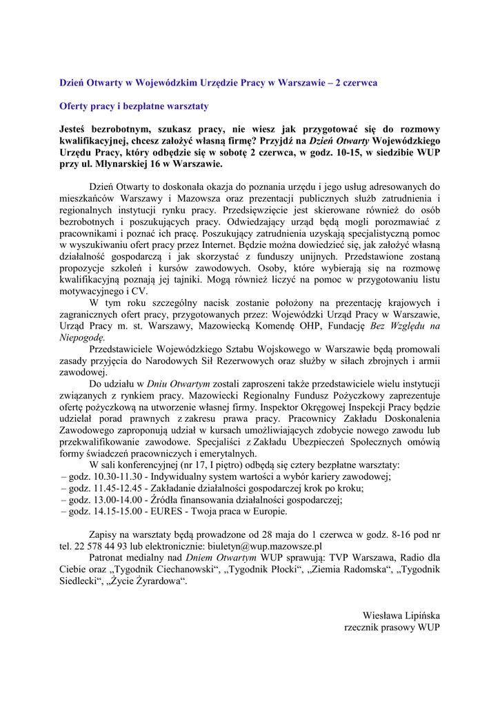 Dzień Otwarty w Wojewódzkim Urzędzie Pracy w Warszawie – 2 czerwca Oferty pracy i bezpłatne warsztaty Jesteś bezrobotnym, szukasz pracy, nie wiesz jak przygotować się do rozmowy kwalifikacyjnej, chcesz założyć własną firmę? Przyjdź na Dzień Otwarty Wojewódzkiego Urzędu Pracy, który odbędzie się w sobotę 2 czerwca, w godz. 10-15, w siedzibie WUP przy ul. Młynarskiej 16 w Warszawie. Dzień Otwarty to doskonała okazja do poznania urzędu i jego usług adresowanych do mieszkańców Warszawy i Mazowsza oraz prezentacji publicznych służb zatrudnienia i regionalnych instytucji rynku pracy. Przedsięwzięcie jest skierowane również do osób bezrobotnych i poszukujących pracy. Odwiedzający urząd będą mogli porozmawiać z pracownikami i poznać ich pracę. Poszukujący zatrudnienia uzyskają specjalistyczną pomoc w wyszukiwaniu ofert pracy przez Internet. Będzie można dowiedzieć się, jak założyć własną działalność gospodarczą i jak skorzystać z funduszy unijnych. Przedstawione zostaną propozycje szkoleń i kursów zawodowych. Osoby, które wybierają się na rozmowę kwalifikacyjną poznają jej tajniki. Mogą również liczyć na pomoc w przygotowaniu listu motywacyjnego i CV. W tym roku szczególny nacisk zostanie położony na prezentację krajowych i zagranicznych ofert pracy, przygotowanych przez: Wojewódzki Urząd Pracy w Warszawie, Urząd Pracy m. st. Warszawy, Mazowiecką Komendę OHP, Fundację Bez Względu na Niepogodę. Przedstawiciele Wojewódzkiego Sztabu Wojskowego w Warszawie będą promowali zasady przyjęcia do Narodowych Sił Rezerwowych oraz służby w siłach zbrojnych i armii zawodowej. Do udziału w Dniu Otwartym zostali zaproszeni także przedstawiciele wielu instytucji związanych z rynkiem pracy. Mazowiecki Regionalny Fundusz Pożyczkowy zaprezentuje ofertę pożyczkową na utworzenie własnej firmy. Inspektor Okręgowej Inspekcji Pracy będzie udzielał porad prawnych z zakresu prawa pracy. Pracownicy Zakładu Doskonalenia Zawodowego zaproponują udział w kursach umożliwiających zdobycie nowego zawodu lub przekwalifikowanie zawodowe. Specjaliści z Zakładu Ubezpieczeń Społecznych omówią formy świadczeń pracowniczych i emerytalnych. W sali konferencyjnej (nr 17, I piętro) odbędą się cztery bezpłatne warsztaty: – godz. 10.30-11.30 - Indywidualny system wartości a wybór kariery zawodowej; – godz. 11.45-12.45 - Zakładanie działalności gospodarczej krok po kroku; – godz. 13.00-14.00 - Źródła finansowania działalności gospodarczej; – godz. 14.15-15.00 - EURES - Twoja praca w Europie. Zapisy na warsztaty będą prowadzone od 28 maja do 1 czerwca w godz. 8-16 pod nr tel. 22 578 44 93 lub elektronicznie: [email protected] Patronat medialny nad Dniem Otwartym WUP sprawują: TVP Warszawa, Radio dla Ciebie oraz „Tygodnik Ciechanowski“, „Tygodnik Płocki“, „Ziemia Radomska“, „Tygodnik Siedlecki“, „Życie Żyrardowa“. Wiesława Lipińska rzecznik prasowy WUP