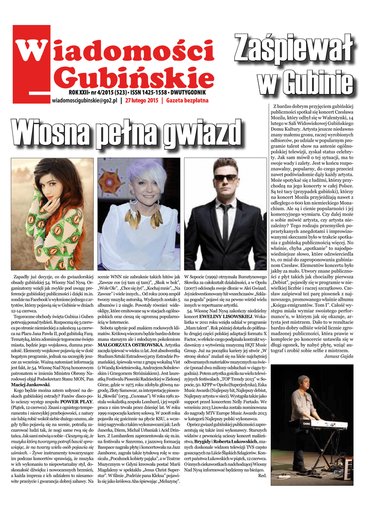W iadomości _ Gubińskie . . Zaśpiewał . ROK XXII nr 4/2015 (523) ISSN 1425-1558 DWUTYGODNIK [email protected] | 27 lutego 2015 | Gazeta bezpłatna w Gubinie Wiosna pełna gwiazd Zapadły już decyzje, co do gwiazdorskiej obsady gubińskiej 54. Wiosny Nad Nysą. Organizatorzy wzięli jak zwykle pod uwagę preferencje gubińskiej publiczności i dzięki m.in. sondzie na Facebook’u wyłoniono jednego z artystów, którzy pojawią się w Gubinie w dniach 12-14 czerwca. Tegoroczne obchody święta Gubina i Guben potrwają ponad tydzień. Rozpoczną się 5 czerwca po stronie niemieckiej a zakończą 14 czerwca na Placu Jana Pawła II, pod gubińską Farą. Tematyką, która zdominuje tegoroczne święto miasta, będzie jego wojskowa, dumna przeszłość. Elementy wojskowe pojawią się w dość bogatym programie, jednak na szczegóły jeszcze za wcześnie. Ważną natomiast informacją jest fakt, że 54. Wiosnę Nad Nysą honorowym patronatem w imieniu Ministra Obrony Narodowej objął Podsekretarz Stanu MON, Pan Maciej Jankowski. Kogo będzie można zatem usłyszeć na deskach gubińskiej estrady? Fanów disco-polo ucieszy występ zespołu POWER PLAY. (Piątek, 12 czerwca). Znani z ognistego temperamentu i niezwykłej przebojowości, z natury nie lubią robić wokół siebie dużego szumu, ale gdy tylko pojawią się na scenie, potrafią zaczarować ludzi tak, że nogi same rwą się do tańca. Jak sami mówią o sobie - Cieszymy się, że muzyka którą tworzymy potrafi bawić sprawiając, że na twarzy wielu osób pojawia się uśmiech. - Żywe instrumenty towarzyszące im podczas koncertów sprawiają, że muzyka w ich wykonaniu to niepowtarzalny styl, doskonałość dźwięku i nowoczesnych brzmień, a każda impreza z ich udziałem to niesamowite przeżycie i gwarancja dobrej zabawy. Na scenie WNN nie zabraknie takich hitów jak „Zawsze cos (oj tam oj tam)”, „Skok w bok”, „Wole Ole”, „Chce się żyć”, „Kochaj mnie”, „Na Zawsze” i wiele innych... Od roku 2009 zespół tworzy muzykę autorską. Wydanych zostało 5 albumów i 2 single. Powstały również wideoklipy, które emitowane są w stacjach ogólnopolskich oraz cieszą się ogromną popularnością w Internecie. Sobota upłynie pod znakiem rockowych klimatów. Królową wieczoru będzie bardzo dobrze znana starszym ale i młodszym pokoleniom MAŁGORZATA OSTROWSKA. Artystka zaczęła śpiewać w wieku 11 lat. Jest absolwentką Studium Sztuki Estradowej przy Estradzie Poznańskiej, śpiewała wraz z grupą wokalną Vist (z Wandą Kwietniewską, Andrzejem Sobolewskim i Grzegorzem Stróżniakiem). Jest laureatką Festiwalu Piosenki Radzieckiej w Zielonej Górze, gdzie w 1975 roku zdobyła główną nagrodę, Złoty Samowar, za interpretację piosenki „Słowiki” (oryg. „Соловьи”). W roku 1981 została wokalistką zespołu Lombard, i jej współpraca z nim trwała przez dziesięć lat. W roku 1999 rozpoczęła karierę solową. W 2008 roku pojawiła się gościnnie na płycie KSU, a wcześniej nagrywała z takim wykonawcami jak: Lech Janerka, Dżem, Michał Urbaniak i Acid Drinkers. Z Lombardem zaprezentowała się m.in. na festiwalu w Sanremo, z jazzową formacją Basspace nagrała płytę i koncertowała na Jazz Jamboree, zagrała także tytułową rolę w musicalu „Pocałunek kobiety pająka”, a w Teatrze Muzycznym w Gdyni kreowała postać Marii Magdaleny w spektaklu „Jesus Christ Superstar”. W filmie „Podróże pana Kleksa” pojawiła się jako królowa Aba śpiewając „Meluzynę”. W Sopocie (1999) otrzymała Bursztynowego Słowika za całokształt działalności, a w Opolu (2007) odcisnęła swoje dłonie w Alei Gwiazd. Jej niekwestionowany hit wszechczasów „Szklana pogoda” pojawi się na pewno wśród wielu innych w repertuarze artystki. 54. Wiosnę Nad Nysą zakończy niedzielny koncert EWELINY LISOWSKIEJ. Wokalistka w 2011 roku wzięła udział w programie „Mam talent”. Rok później dotarła do półfinału drugiej części polskiej adaptacji formatu X Factor, w efekcie czego podpisała kontrakt wydawniczy z wytwórnią muzyczną HQT Music Group. Już na początku kariery jej utwór „W stronę słońca” znalazł się na liście najchętniej odtwarzanych materiałów muzycznych na świecie (ponad dwa miliony odsłuchań w ciągu tygodnia). Potem artystka gościła na wielu telewizyjnych festiwalach „TOP Trendy 2013” w Sopocie, 50. KFPP w Opolu (Superjedynka), Eska Music Awards (Najlepszy hit, Najlepszy debiut, Najlepszy artysta w sieci). Wystąpiła także jako support przed koncertem Nelly Furtado. We wrześniu 2013 Lisowska została nominowana do nagrody MTV Europe Music Awards 2013 w kategorii Najlepszy polski wykonawca. Oprócz gwiazd gubińskiej publiczności zaprezentują się także inni wykonawcy. Starszych widzów z pewnością ucieszy koncert małżeństwa, Brygidy i Roberta Łukowskich, znanych doskonale widzom telewizji TVS często goszczących na Liście Śląskich Szlagierów. Koncert państwa Łukowskich w piątek, 12 czerwca. O innych ciekawostkach nadchodzącej Wiosny Nad Nysą informować będziemy na bieżąco. Red. Z bardzo dobrym przyjęciem gubińskiej publiczności spotkał się koncert Czesława Mozila, który odbył się w Walentynki, 14 lutego w Sali Widowiskowej Gubińskiego Domu Kultury. Artysta jeszcze niedawno znany małemu gronu, raczej wyrobionych odbiorców, po udziale w popularnym programie talent show na antenie ogólnopolskiej telewizji, zyskał status celebryty. Jak sam mówił o tej sytuacji, ma to swoje wady i zalety. Jest w końcu rozpoznawalny, popularny, do czego przecież nawet podświadomie dąży każdy artysta. Może spotykać się z ludźmi, którzy przychodzą na jego koncerty w całej Polsce. Są też tacy (przypadek gubiński), którzy na koncert Mozila przyjeżdżają nawet z odległego o 600 km niemieckiego Monachium. Ale są i cienie popularności i jej komercyjnego wymiaru. Czy dalej może o sobie m