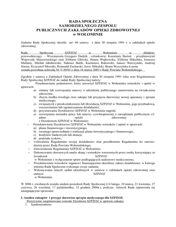 RADA SPOŁECZNA SAMODZIELNEGO ZESPOŁU PUBLICZNYCH ZAKŁADÓW OPIEKI ZDROWOTNEJ w WOŁOMINIE Zadania Rady Społecznej określa art. 46 ustawy z dnia 30 sierpnia 1991 r. o zakładach opieki zdrowotnej. Rada Społeczna SZPZOZ w Wołominie w składzie: przewodniczący - Wicestarosta Grzegorz Dudzik , członkowie: Konstanty Bartoń - przedstawiciel Wojewody Mazowieckiego oraz Elżbieta Główka, Hanna Wujkowska, Elżbieta Mikulska, Ireneusz Maślany, Michał Jakubowski, Tadeusz Bulik, Kazimierz Rakowski, Janusz Werczyński, Andrzej Siarna, Krzysztof Sikorski, Romuald Zacharski, Jerzy Mikulski, Beata Wyszyńska-Lasota została powołana uchwałą Nr V-30/03 z dnia 18 marca 2003 r Rady Powiatu Wołomińskiego. Zgodnie z ustawą o Zakładach Opieki Zdrowotnej z dnia 30 sierpnia 1991 roku oraz Regulaminem Rady Społecznej SZPZOZ do zadań Rady Społecznej należy: Przedstawianie podmiotowi, który utworzył SZPZOZ w Wołominie wniosków i opinii w sprawach: a) zmiany lub rozwiązania umowy o udzielenie publicznego zamówienia na świadczenia zdrowotne, b) zbycia środka trwałego oraz zakupu lub przyjęcia darowizny nowej aparatury i sprzętu medycznego, c) związanych z przekształceniem lub likwidacją SZPZOZ w Wołominie, jego przebudową, rozszerzeniem lub ograniczeniem działalności, d) przyznawania Dyrektorowi SZPZOZ w Wołominie nagród, e) rozwiązania stosunku pracy lub umowy cywilnoprawnej o zarządzanie publicznym z2adem opieki zdrowotnej z Dyrektorem SZPZOZ w Wołominie; Przedstawienie Dyrektorowi SZPZOZ w Wołominie wniosków i opinii w sprawach: a) planu finansowego i inwestycyjnego, b) rocznego sprawozdania z realizacji planu inwestycyjnego i finansowego, c) kredytów bankowych lub dotacji, d) podziału zysków; - Uchwalenie Regulaminu swojej działalności oraz przedłożenie Regulaminu do zatwierdzenia przez Radę Powiatu Wołomińskiego; - Zatwierdzenie Regulaminu SZPZOZ w Wołominie; - Dokonywanie okresowych analiz skarg i wniosków wnoszonych przez osoby korzystające ze świadczeń SZPZOZ w Wołominie z wyłączeniem spraw podlegających nadzorowi medycznemu; - Przedstawienie wniosków organowi finansującemu określony zakres działalności, w którego imieniu Rada Społeczna wykonuje swoje zadania; - Wykonywanie innych zadań określonych w ustawie o zakładach opieki zdrowotnej oraz statucie SZPZOZ w Wołominie. W 2006 r. zwołanych zostało siedem posiedzeń Rady Społecznej (14 lutego, 10 marca, 21 kwietnia, 27 czerwca, 26 września, 17 października, 12 grudnia 2006r.), podczas których Rada zajmowała się następującymi sprawami: I. Analiza zakupów i przyjęć darowizn sprzętu medycznego dla SZPZOZ. Pozytywnie zaopiniowano wnioski Dyrektora SZPZOZ w sprawie zakupu: 1. kardiomonitora 2. 3. 4. 5. 6. 7. 8. 9. 10. 11. 12. 13. 14. 15. 16. 17. 18. 19. 20. 21. 22. 23. 24. defibrylatora analizatora parametrów krytycznych aparatu EKG narzędzi do laparotonii trepanu gastroskopu lampy do fototerapii noworodków systemu wspomagania noworodków aparatu kardiochirurgicznego dla zabiegów dermatologicznych rejestratora dawek promieniowania jonizującego do aparatu OEC 7700 wywoływarki automatycznej zdjęć rentgenowskich foteli ginekologicznych oftalmoskopu pocket Dopplera oscylometru neurotipsu (do badania bólu) dermatoskopu peloty TOCO do aparatu KTG kardiomonitora do pomiaru ciśnienia metodą krwawą i ciśnienia wewnątrz czaszkowego fotela okulistyczno – laryngologiczny pacjenta wolnostojący głowicy ultradźwiękowa do aparatu Quito zestawu do reanimacji (laryngoskop, resuscytator dla dzieci, ssak) aparatu kriochirurgicznego dla okulistów II. Podjęto uchwałę w sprawie wyrażenia opinii na temat przyjęcia darowizny od Wielkiej Orkiestry Świątecznej Pomocy dla potrzeb SZPZOZ w Wołominie. III. Dokonywano analizy wykorzystania mienia SZPZOZ ze szczególnym uwzględnieniem wyrażenia zgody na jego wynajem, wydzierżawienie lub zbycie. Pozytywnie zaopiniowano wnioski Dyrektora SZPZOZ w sprawie: 1. Wydzierżawienia powierzchni gruntu na terenie SZPZOZ w Wołominie na pawilon handlowy. 2. Wynajmu pomieszczeń Poradni Medycyny Pracy SZPZOZ w Wołominie. 3. Wydzierżawienia części gruntu na terenie SZPZOZ w Wołominie na prowadzenie działalności handlowej. 4. Wydzierżawienia gruntu na terenie SZPZOZ w Wołominie. 5. Wydzierżawienia powierzchni gruntu na terenie SZPZOZ w Wołominie na prowadzenie działalności gastronomicznej. 6. Użyczenia pomieszczeń Poradni Medycyny Pracy SZPZOZ w Wołominie. 7. Użyczenia powierzchni w budynkach SZPZOZ w Wołominie na zainstalowanie retransmitera telemetrycznego. 8. Nieodpłatnego przekazania sprzętu dla potrzeb Schroniska Don Orione w Czarnej. 9. Nieodpłatnego przekazania sprzętu dla Zespołu Szkół Specjalnych w Wołominie. IV. Dokonywano analizy finansowej w zakresie planu i sprawozdania finansowego. Pozytywnie zaopiniowano: 1. sprawozdanie rzeczowo-finansowe SZPZOZ w Wołominie za 2005 rok. 2. korektę planu rzeczowo-finansowego SZPZOZ w Wołominie na 2006 r. 3. zaciągnięcie pożyczki przez SZPZOZ w Wołominie. 4. plan rzeczowo-finansowy SZPZOZ w Wołominie na rok 2007. V. Dokonywano analizy wykonania kontraktu oraz przedstawiano sytuację finansową SZPZOZ w Wołominie za rok 2006. VI. Dokonano analizy w zakresie spraw związanych ze Stacją Dializ w SZPZOZ w Wołominie. Wyrażono opinię na temat udzielenia świadczenia zdrowotnego w zakresie dializoterapii na potrzeby pacjentów objętych leczeniem w Stacji Dializ SZPZOZ w Wołominie podmiotowi zewnętrznemu w trybie określonym w art.35 i 35a ustawy z dnia 30.08.1991r. o z2adach opieki zdrowotnej. Opiniowano w sprawie wynajmu pomieszczeń Stacji Dializ SZPZOZ w Wołominie podmiotowi zewnętrznemu, wydzierżawienia majątku Stacji Dializ SZPZOZ w Wołominie podmiotowi zewnętrznemu oraz wydzierżawienia powierzchni gruntu na terenie SZPZOZ w Wołominie podmiotowi zewnętrznemu w celu wybudowania i wyposażenia Stacji Dializ. VII. Inspirowano działania mając