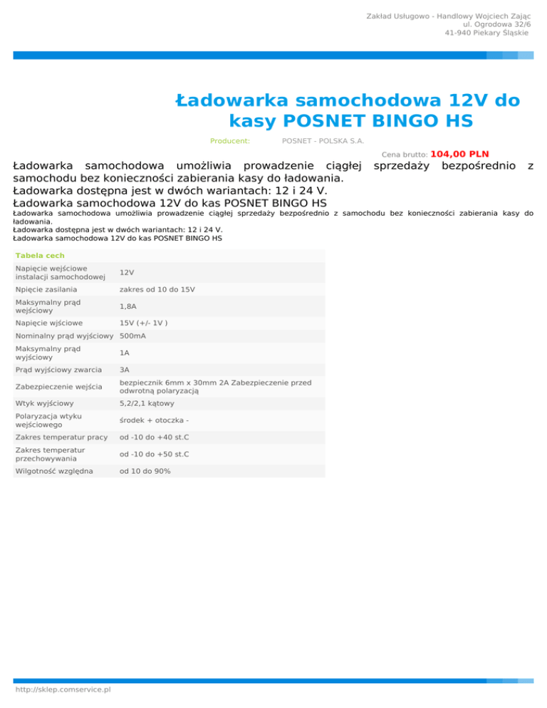 Zakład Usługowo - Handlowy Wojciech Zając ul. Ogrodowa 32/6 41-940 Piekary Śląskie Ładowarka samochodowa 12V do kasy POSNET BINGO HS Producent: POSNET - POLSKA S.A. Cena brutto: Ładowarka samochodowa umożliwia prowadzenie ciągłej samochodu bez konieczności zabierania kasy do ładowania. Ładowarka dostępna jest w dwóch wariantach: 12 i 24 V. Ładowarka samochodowa 12V do kas POSNET BINGO HS sprzedaży 104,00 PLN bezpośrednio z Ładowarka samochodowa umożliwia prowadzenie ciągłej sprzedaży bezpośrednio z samochodu bez konieczności zabierania kasy do ładowania. Ładowarka dostępna jest w dwóch wariantach: 12 i 24 V. Ładowarka samochodowa 12V do kas POSNET BINGO HS Tabela cech Napięcie wejściowe instalacji samochodowej 12V Npięcie zasilania zakres od 10 do 15V Maksymalny prąd wejściowy 1,8A Napięcie wjściowe 15V (+/- 1V ) Nominalny prąd wyjściowy 500mA Maksymalny prąd wyjściowy 1A Prąd wyjściowy zwarcia 3A Zabezpieczenie wejścia bezpiecznik 6mm x 30mm 2A Zabezpieczenie przed odwrotną polaryzacją Wtyk wyjściowy 5,2/2,1 kątowy Polaryzacja wtyku wejściowego środek + otoczka - Zakres temperatur pracy od -10 do +40 st.C Zakres temperatur przechowywania od -10 do +50 st.C Wilgotność względna od 10 do 90% http://sklep.comservice.pl