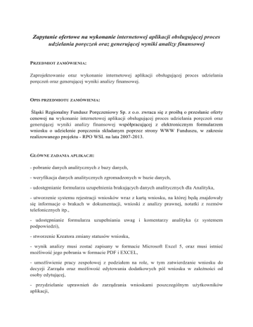 Zapytanie ofertowe na wykonanie internetowej aplikacji obsługującej proces udzielania poręczeń oraz generującej wyniki analizy finansowej PRZEDMIOT ZAMÓWIENIA: Zaprojektowanie oraz wykonanie internetowej aplikacji obsługującej proces udzielania poręczeń oraz generującej wyniki analizy finansowej. OPIS PRZEDMIOTU ZAMÓWIENIA: Śląski Regionalny Fundusz Poręczeniowy Sp. z o.o. zwraca się z prośbą o przesłanie oferty cenowej na wykonanie internetowej aplikacji obsługującej proces udzielania poręczeń oraz generującej wyniki analizy finansowej współpracującej z elektronicznym formularzem wniosku o udzielenie poręczenia składanym poprzez strony WWW Funduszu, w zakresie realizowanego projektu - RPO WSL na lata 2007-2013. GŁÓWNE ZADANIA APLIKACJI: - pobranie danych analitycznych z bazy danych, - weryfikacja danych analitycznych zgromadzonych w bazie danych, - udostępnianie formularza uzupełnienia brakujących danych analitycznych dla Analityka, - utworzenie systemu rejestracji wniosków wraz z kartą wniosku, na której będą znajdowały się informacje o brakach w dokumentacji, wnioski z analizy prawnej, notatki z rozmów telefonicznych itp., - udostępnianie formularza uzupełniania uwag i komentarzy analityka (z systemem podpowiedzi), - stworzenie Kreatora zmiany statusów wniosku, - wynik analizy musi zostać zapisany w formacie Microsoft Excel 5, oraz musi istnieć możliwość jego pobrania w formacie PDF i EXCEL, - umożliwienie pracy zespołowej z podziałem na role, w tym zatwierdzanie wniosku do decyzji Zarządu oraz możliwość edytowania dodatkowych pól wniosku w zależności od osoby edytującej, - przydzielanie uprawnień do zarządzania wnioskami poszczególnym użytkowników aplikacji, - rejestracja wszystkich akcji wykonywanych przez użytkowników z uwzględnieniem czasu ich wykonywania, nazwy użytkownika oraz z możliwością podglądu dla poszczególnych użytkowników, - pobieranie danych osobowych podmiotu aplikującego oraz zapisywanie ich z możliwością pobrania w formacie PDF i EXCEL, - przygotowywanie umów o udzielenie poręczenia, oświadczeń poręczyciela, weksli lub/i innych dokumentów – z możliwością późniejszej edycji, - przygotowywanie umów o udzielenie poręczenia, oświadczeń poręczyciela, weksli lub/i innych dokumentów po edycji do druku, - archiwizowanie wniosków, danych, wyników analiz, sporządzonych dokumentów oraz załączników, - ustanowienie łączności z systemem OSWUP Banku Gospodarstwa Krajowego w zakresie przekazywania informacji statystycznych oraz rejestrów udzielonych poręczeń w sposób i metodą jaka będzie przekazana przez Bank Gospodarstwa Krajowego lub innego dysponenta systemu OSWUP. Wynikiem działania aplikacji muszą być następujące analizy oraz wykresy, uwzględniające podział na księgowość pełną oraz uproszczoną: - Struktura bilansu, - Dynamika bilansu, - Dynamika RZiS, - Cash flow, - Wykresy, - Wskaźniki płynności, - Cykl rotacji zapasów, - Wynik brutto sprzedaży, - Wskaźnik zadłużenia, - Rentowność, - Przychody koszty i zysk, - Struktura aktywów, - Struktura pasywów, - Porównanie wskaźników, - Płynność bieżąca, - Płynność szybka, - Rotacja zapasów ogółem, - Wynik brutto na sprzedaży, - Wskaźnik zadłużenia firmy, - Reguła bilansowa I stopnia, - Reguła bilansowa II stopnia, - Rotacja należności, - Rotacja zobowiązań, - Wskaźnik pokrycia i obsługi zadłużenia, - Wskaźnik pokrycia odsetek, - Wskaźnik kapitał obrotowy, - Cykl rozliczeniowy należności, - Cykl rozliczeniowy zobowiązań, - Rotacja zapasów ogółem, - Wskaźnik rentowności sprzedaży, - Pokrycie majątku trwałego kapitałem stałym, - Wskaźnik zadłużenia aktywów, - Wskaźnik rentowności aktywów, - Wskaźnik rentowności kapitału własnego, - Wskaźniki inwestycyjne (wg modelu Altmana), - Wskaźnik bieżącej wartości netto, - Wskaźnik wewnętrznej stopy zwrotu, - Wskaźnik okresu zwrotu nakładów, - Wskaźnik rentowności inwestycji , - Arkusze oceny, - Ocena finansowa (punktowa oraz procentowa), - Ocena jakościowa (punktowa oraz procentowa), - Regulowanie zobowiązań wobec instytucji finansujących, - Arkusz oceny zabezpieczeń. DODATKOWE ZAŁOŻENIA: Aplikacja powinna działać następujące oprogramowanie: na serwerze internetowym ŚRFP, zawierającym - system operacyjny Linux, - serwer WWW przynajmniej Apache 2.2, - język skryptowy przynajmniej PHP 5.3, - serwer bazy danych przynajmniej MySQL 5.1, Aplikacja ponadto musi: umożliwiać pracę z bezpieczną transmisją SSL, umożliwiać współpracę z systemem przyjmowania elektronicznych wniosków IC Form, umożliwiać bezproblemową pracę za pomocą najnowszych (na dzień składania oferty) wersji popularnych przeglądarek internetowych, takich jak: Internet Explorer 9.x, Google Chrome 21.x, Mozilla Firefox 13.x. OFERENT PO WYKONANIU OPROGRAMOWANIA BĘDZIE ZOBOWIĄZANY DO: 1. Przekazania na ŚRFP prawa do: - odsprzedaży programu, - dystrybucji programu, - dokonywania zmian w programie, - udzielania sublicencji programu. 2. Przez okres 6 miesięcy od daty protokołu odbioru dokonywania poprawek i przeróbek na życzenie ŚRFP, w łącznym wymiarze nie przekraczającym 80 godzin roboczych. 3. Udzielenia gwarancji technicznej na okres 18 miesięcy od daty protokołu odbioru. 4. Przygotowania instrukcji obsługi dla użytkowania w formie papierowej. Przy składaniu oferty prosimy o wpisanie do niej powyższych zobowiązań, w przeciwnym wypadku oferta będzie uważana za nieważną. MIEJSCE I TERMIN SKŁADANIA OFERT Ofertę należy przesłać listownie lub złożyć osobiście (w zamkniętej kopercie) w siedzibie ŚRFP Sp. z o.o., ul. Astrów 10, 40-045 Katowice lub przesłać mailem na adres [email protected] w terminie do dnia 24 października 2012r. do godziny 16.00 z dopiskiem: „Oferta na wykonanie aplikacji obsługującej proces udzielania poręczeń oraz generującej wyniki analizy finans
