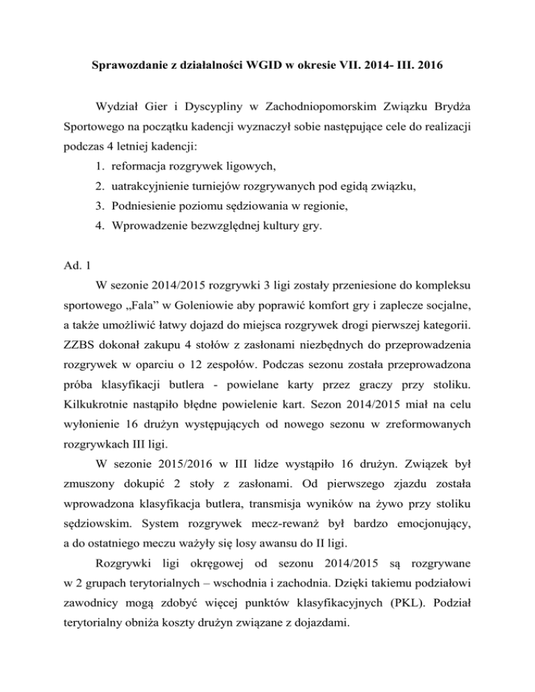 Sprawozdanie z działalności WGID w okresie VII. 2014- III. 2016 Wydział Gier i Dyscypliny w Zachodniopomorskim Związku Brydża Sportowego na początku kadencji wyznaczył sobie następujące cele do realizacji podczas 4 letniej kadencji: 1. reformacja rozgrywek ligowych, 2. uatrakcyjnienie turniejów rozgrywanych pod egidą związku, 3. Podniesienie poziomu sędziowania w regionie, 4. Wprowadzenie bezwzględnej kultury gry. Ad. 1 W sezonie 2014/2015 rozgrywki 3 ligi zostały przeniesione do kompleksu sportowego „Fala” w Goleniowie aby poprawić komfort gry i zaplecze socjalne, a także umożliwić łatwy dojazd do miejsca rozgrywek drogi pierwszej kategorii. ZZBS dokonał zakupu 4 stołów z zasłonami niezbędnych do przeprowadzenia rozgrywek w oparciu o 12 zespołów. Podczas sezonu została przeprowadzona próba klasyfikacji butlera - powielane karty przez graczy przy stoliku. Kilkukrotnie nastąpiło błędne powielenie kart. Sezon 2014/2015 miał na celu wyłonienie 16 drużyn występujących od nowego sezonu w zreformowanych rozgrywkach III ligi. W sezonie 2015/2016 w III lidze wystąpiło 16 drużyn. Związek był zmuszony dokupić 2 stoły z zasłonami. Od pierwszego zjazdu została wprowadzona klasyfikacja butlera, transmisja wyników na żywo przy stoliku sędziowskim. System rozgrywek mecz-rewanż był bardzo emocjonujący, a do ostatniego meczu ważyły się losy awansu do II ligi. Rozgrywki ligi okręgowej od sezonu 2014/2015 są rozgrywane w 2 grupach terytorialnych – wschodnia i zachodnia. Dzięki takiemu podziałowi zawodnicy mogą zdobyć więcej punktów klasyfikacyjnych (PKL). Podział terytorialny obniża koszty drużyn związane z dojazdami. Ad 2. ZZBS odpowiada ze cykl Grand Prix Pomorza Zachodniego oraz Korespondencyjne Mistrzostwa Okręgu, Mistrzostwa Województwa Zachodniopomorskiego. Turnieje z cyklu GPPZ cieszą się dużym zainteresowaniem ze strony organizatorów. Prestiż cyklu GPPZ wymagał wprowadzenia przez ZZBS obostrzeń regulaminowych związanych z organizacją turniejów. Ośrodki, które im nie sprostają w kolejnym roku zostaną zastąpione przez innych organizatorów. Z każdym rokiem fundusz nagród w finale wzrasta. Turnieje Korespondencyjnych Mistrzostw Okręgu zostały zreformowane w roku 2015 przez co po raz pierwszy były rentowne, a nagrody za klasyfikację generalną były kilkukrotnie większe jak w latach poprzednich. Aby uatrakcyjnić rywalizację w roku 2016 ilość wymaganych do rozegrania turniejów została obniżona z 10 do 9 na 12 możliwych. Ad 3. W ZZBS mamy zarejestrowanych 44 członków posiadających uprawnienia sędziowskie. Z grona tego tylko 12 osób czynnie sędziuje turnieje, pozostali grają w turniejach. Sędziów uprawnionych do prowadzenia najważniejszych imprez w regionie jest tylko 4. Co roku organizowane są przez PZBS kursokonferencje sędziowskie, mające na celu podniesienie kwalifikacji. Niestety żaden z sędziów nie okazuje chęci wyjazdu na konferencję, a także późniejszego czynnego udziału w sędziowaniu turniejów. WGiD jest otwarty na wszystkie osoby, które chcą w podnosić swoje umiejętności, a następnie sędziować imprezy w województwie Zachodniopomorskim. Ad 4. W latach 2014-2016 do ZZBS trafiło kilka pism dotyczących zachowania poszczególnych zawodników. WGiD zobowiązany był do przeprowadzenia postępowań dyscyplinarnych, w wyniku których zawodnicy ponieśli kary w zależności od popełnionych wykroczeń począwszy od naganny, po przez grzywny finansowe, a skończywszy na czasowej dyskwalifikacji. Większość problemów wynikała z koleżeńskiego podejścia sędziów do środowiska brydżowego podczas turniejów, którzy nie korzystali ze swoich praw i nie karali zawodników podczas turniejów. WGiD w najbliższym czasie nałoży nacisk, aby środowisko sędziowskie podniosło swoje kwalifikacje i stosowało się do prawa brydżowego, a przede wszystkim egzekwowała je natychmiastowo podczas rozgrywek. Z poważaniem, Ćwirko Damian Przewodniczący WGiD