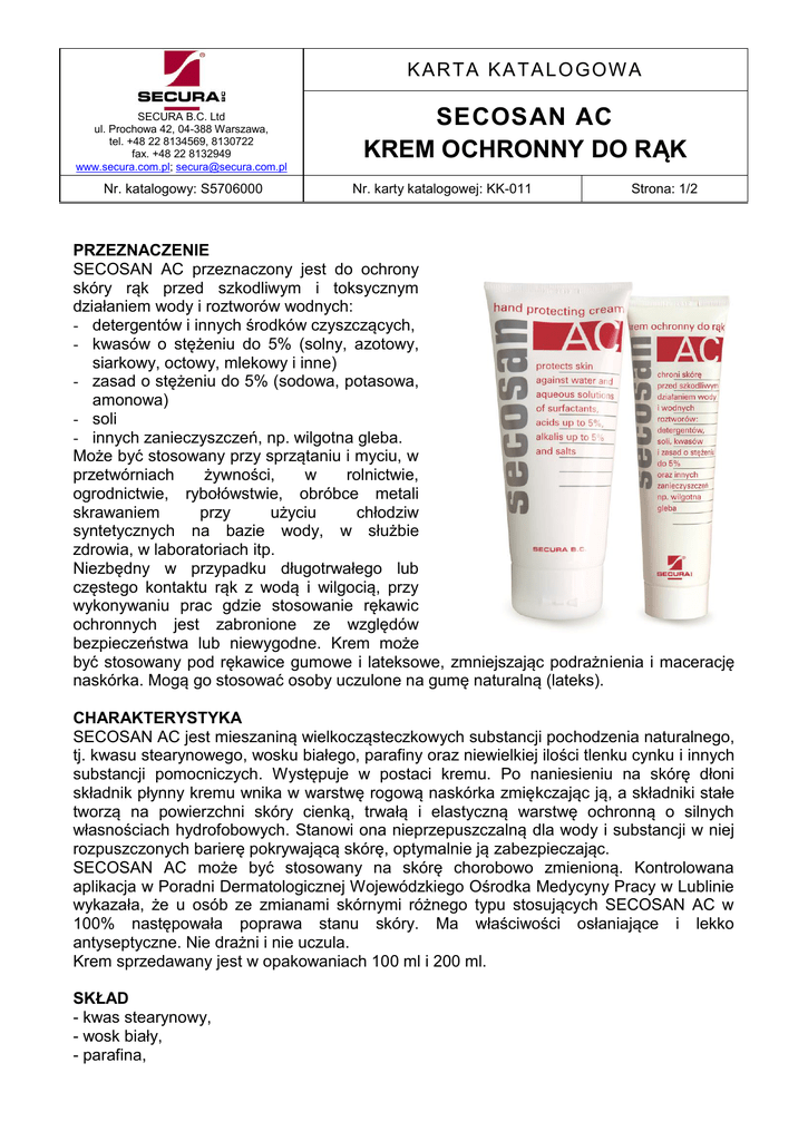 K A R T A K A TA L O G OW A SECURA B.C. Ltd ul. Prochowa 42, 04-388 Warszawa, tel. +48 22 8134569, 8130722 fax. +48 22 8132949 www.secura.com.pl; [email protected] Nr. katalogowy: S5706000 SECOSAN AC KREM OCHRONNY DO RĄK Nr. karty katalogowej: KK-011 Strona: 1/2 PRZEZNACZENIE SECOSAN AC przeznaczony jest do ochrony skóry rąk przed szkodliwym i toksycznym działaniem wody i roztworów wodnych: - detergentów i innych środków czyszczących, - kwasów o stężeniu do 5% (solny, azotowy, siarkowy, octowy, mlekowy i inne) - zasad o stężeniu do 5% (sodowa, potasowa, amonowa) - soli - innych zanieczyszczeń, np. wilgotna gleba. Może być stosowany przy sprzątaniu i myciu, w przetwórniach żywności, w rolnictwie, ogrodnictwie, rybołówstwie, obróbce metali skrawaniem przy użyciu chłodziw syntetycznych na bazie wody, w służbie zdrowia, w laboratoriach itp. Niezbędny w przypadku długotrwałego lub częstego kontaktu rąk z wodą i wilgocią, przy wykonywaniu prac gdzie stosowanie rękawic ochronnych jest zabronione ze względów bezpieczeństwa lub niewygodne. Krem może być stosowany pod rękawice gumowe i lateksowe, zmniejszając podrażnienia i macerację naskórka. Mogą go stosować osoby uczulone na gumę naturalną (lateks). CHARAKTERYSTYKA SECOSAN AC jest mieszaniną wielkocząsteczkowych substancji pochodzenia naturalnego, tj. kwasu stearynowego, wosku białego, parafiny oraz niewielkiej ilości tlenku cynku i innych substancji pomocniczych. Występuje w postaci kremu. Po naniesieniu na skórę dłoni składnik płynny kremu wnika w warstwę rogową naskórka zmiękczając ją, a składniki stałe tworzą na powierzchni skóry cienką, trwałą i elastyczną warstwę ochronną o silnych własnościach hydrofobowych. Stanowi ona nieprzepuszczalną dla wody i substancji w niej rozpuszczonych barierę pokrywającą skórę, optymalnie ją zabezpieczając. SECOSAN AC może być stosowany na skórę chorobowo zmienioną. Kontrolowana aplikacja w Poradni Dermatologicznej Wojewódzkiego Ośrodka Medycyny Pracy w Lublinie wykazała, że u osób ze zmianami skórnymi różnego typu stosujących SECOSAN AC w 100% następowała poprawa stanu skóry. Ma właściwości osłaniające i lekko antyseptyczne. Nie drażni i nie uczula. Krem sprzedawany jest w opakowaniach 100 ml i 200 ml. SKŁAD - kwas stearynowy, - wosk biały, - parafina, K A R T A K A TA L O G OW A SECURA B.C. Ltd ul. Prochowa 42, 04-388 Warszawa, tel. +48 22 8134569, 8130722 fax. +48 22 8132949 www.secura.com.pl; [email protected] Nr. katalogowy: S5706000 SECOSAN AC KREM OCHRONNY DO RĄK Nr. karty katalogowej: KK-011 Strona: 2/2 - tlenek cynku - substancje pomocnicze DOPUSZCZENIA SECOSAN AC jest produkowany zgodnie z procedurą technologiczną przekazaną w formie załącznika do umowy licencyjnej Nr 12/2003/W z dn. 30 grudnia 2003 r. zawartej pomiędzy Firmą SECURA B.C., a CENTRALNYM INSTYTUTEM OCHRONY PRACY – PAŃSTWOWY INSTYTUT BADAWCZY, ul. Czerniakowska 16, 00-701 Warszawa, dotyczącej produkcji kremu hydrofobowego przeznaczonego do ochrony rąk przed wodą i roztworami kwasów, zasad, soli, detergentów itp. Pozytywnie oceniany przez dermatologów. OGRANICZENIA W STOSOWANIU Brak SPOSÓB UŻYCIA Na czystą, suchą skórę rąk nanieść niewielką ilość kremu i dokładnie rozprowadzić zwłaszcza po obszarach, gdzie skóra jest cienka i słabo chroniona – grzbiet dłoni, wewnętrzne strony palców, nadgarstki. Chwilę odczekać (ok. 2 min.), aż składnik zmiękczający wchłonie się w warstwę rogową naskórka. Ewentualny nadmiar kremu należy usunąć, np. papierowym ręcznikiem. Po zakończonej pracy umyć ręce wodą z mydłem. Po umyciu pozostałości kremu nie należy usuwać, gdyż zapewnia on ciągłe działanie ochronne i pielęgnacyjne. PRZECHOWYWANIE I TRWAŁOŚĆ Przechowywać w temperaturze pokojowej. Krem w obniżonej temperaturze może ulec zgęstnieniu. Wówczas należy go zmiękczyć, ugniatając tubę w dłoniach. Trwałość 3 lata od daty produkcji.