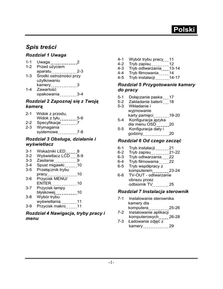 Polski Spis treści Rozdział 1 Uwaga 1-1 1-2 1-3 1-4 4-1 4-2 4-3 4-4 4-5 Uwaga 2 Przed użyciem 2-3 aparatu Środki ostrożności przy użytkowaniu kamery 3 Zawartość 3-4 opakowania 2-2 2-3 Widok z przodu, Widok z tyłu Specyfikacje Wymagania systemowe 5-1 5-2 5-3 5-6 7 5-4 5-5 7-8 Rozdział 3 Obsługa, działanie i wyświetlacz 3-1 3-2 3-3 3-4 3-5 3-6 3-7 3-8 3-9 Wskaźniki LED Wyświetlacz LCD Zasilanie Spust migawki Przełącznik trybu pracy Przycisk MENU/ ENTER Przycisk lampy błyskowej Wybór trybu wyświetlania Przycisk makro 11 12 13-14 14 14-17 Rozdział 5 Przygotowanie kamery do pracy Rozdział 2 Zapoznaj się z Twoją kamerą 2-1 Wybór trybu pracy Tryb zapisu Tryb odtwarzania Tryb filmowania Tryb instalacji Dołączanie paska Zakładanie baterii Wkładanie i wyjmowanie karty pamięci Konfiguracja języka dla menu OSD Konfiguracja daty i godziny 17 18 19-20 20 20 Rozdział 6 Od czego zacząć 8 8-9 9 10 6-1 6-2 6-3 6-4 6-5 10 Tryb instalacji 21 21-22 Tryb zapisu 22 Tryb odtwarzania 22 Tryb filmowania Tryb współpracy z komputerem 23-24 TV-OUT - odtwarzanie obrazu przez 25 odbiornik TV 10 6-6 10 Rozdział 7 Instalacja sterownik 7-1 11 11 7-2 Rozdział 4 Nawigacja, tryby pracy i menu 7-3 -1- Instalowanie sterownika kamery dla 25-26 komputera Instalowanie aplikacji komputerowych 26-28 Ładowanie zdjęć z 29 kamery Polski Rozdział 1 Uwaga Przed przystąpieniem do użytkowania aparatu prosimy uważnie przeczytać tę instrukcję obsługi i postępować zgodnie ze wskazówkami w niej zawartymi, w celu uniknięcia jakichkolwiek zniszczeń, które mogłyby zostać spowodowane przez niewłaściwe manipulowanie aparatem. 1-1 Uwaga Oprogramowanie na płycie CD-ROM dołączone do aparatu jest przeznaczone wyłącznie do użytku przy pomocy komputerów PC. Próby odtwarzania tej płyty CD-ROM za pomocą odtwarzacza stereo lub odtwarzacza płyt kompaktowych mogą spowodować zniszczenie sprzętu. Ten aparat jest precyzyjnym urządzeniem elektronicznym. Nie należy próbować samodzielnego przeprowadzania napraw, ponieważ otwieranie czy też zdejmowanie pokrywy może narazić użytkownika na porażenie prądem lub inne niebezpieczeństwa. Nie wystawiać aparatu na bezpośrednie działanie promieni słonecznych, aby nie spowodować pożaru. 1-2 Przed użyciem aparatu Przed przystąpieniem do właściwej rejestracji obrazu należy zrobić kilka próbnych zdjęć. Wskazane jest przeprowadzenie próby aparatu z wyprzedzeniem, zanim zacznie się robić zdjęcia przy jakiejś ważnej okazji (takiej jak ceremonia ślubu czy urlop), w celu upewnienia się, że działa on prawidłowo. Nasza firma nie ponosi odpowiedzialności za wszelkie dodatkowe straty spowodowane wadliwym działaniem tego produktu (takie jak koszty fotografowania lub wszelkie utraty korzyści majątkowych uzyskiwanych z fotografowania) i nie będą z tego tytułu przyznawane żadne odszkodowania. Informacja o prawach autorskich Wszystkie zdjęcia wykonane przy pomocy tego aparatu cyfrowego, nie mogą być użyte bez zgody prawowitego właściciela, bez naruszenia jego praw autorskich. Ponadto, jeżeli na miejscu pojawi się komunikat ograniczający „Zakaz wykonywania zdjęć", nie wolno rejestrować żadnych przedstawień, imprez czy wystaw, nawet na użytek prywatny. Jakiekolwiek przesyłanie obrazów lub danych na (lub z) kartę pamięci powinno być przeprowadzane zgodnie z ograniczeniami przepisów na temat praw autorskich. Uwagi na temat monitora ciekłokrystalicznego LCD 1. Jeżeli nastąpi kontakt cieczy ze skórą: Należy wytrzeć skórę do sucha za pomocą szmatki, a następnie przemyć dużą ilością wody. -2- Polski 2. Jeżeli ciecz dostanie się do oka: Należy bezzwłocznie przepłukać oko czystą wodą przez co najmniej 15 minut, a następnie jak najszybciej skontaktować się z lekarzem w celu uzyskania pomocy medycznej. 3. Jeżeli nastąpi przypadkowe połknięcie cieczy: Należy wypłukać usta wodą, wypić dużą ilość wody, a następnie jak najszybciej skontaktować się z lekarzem w celu uzyskania pomocy medycznej. 1-3 Środki ostrożności przy użytkowaniu kamery Niniejszy produkt składa się z delikatnych części elektronicznych. Jego prawidłowe użytkowanie wymaga ostrożności, nie pozwól aby kamera upadła lub uderzyła w cokolwiek. ● ● ● ● Nie używaj ani nie przechowuj kamery w następujących miejscach: 1. brudne i zapylone otoczenie. 2. pojazdy ze złą wentylacją lub miejsca bezpośrednio oświetlone przez słońce względnie wystawione na wysoką temperaturę, 3. środowisko z silnymi wirami powietrznymi, 4. miejsca zadymione, zaparowane lub wyziewy olejów, 5. miejsca narażone na silne pola magnetyczne, 6. w czasie opadów deszczu lub śniegu. Nie otwieraj pokrywy zasobnika baterii gdy kamera jest włączona. Jeżeli do kamery dostanie się woda, niezwłocznie wyłącz zasilanie i usuń baterie z kamery. Jak powinieneś dbać o Twoją kamerę: 1. Jeżeli obiektyw, wyświetlacz LCD lub celownik ulegnie zanieczyszczeniu, użyj specjalnego pędzelka do obiektywów lub miękkiej tkaniny do wytarcia wilgoci; nie dotykaj soczewki palcami. 2. Nie dotykaj kamery żadnymi twardymi przedmiotami aby uniknąć porysowania obiektywu, wyświetlacza LCD lub celownika. 3. Nie używaj żadnego detergentu ani rozpuszczalnika który mógłby rozpuścić obudowę lub zmyć farbę z kamery. Używaj tylko miękkiej tkaniny. 1-4 Zawartość opakowania Sprawdź, czy w opakowaniu są następujące przedmioty. CD-ROM (sterownik kamery) futerał pasek 2 x AA Alkaline baterie -3- Polski Kabel USB z z z z z z z z Kabel TV-OUT Podręcznik Użytkownika Skrócona instrukcja CD-ROM (zawiera sterownik kamery) Futerał Pasek na rękę 2 baterie AA Alkaline Kabel USB Kabel TV-OUT Podręcznik Użytkownika Skrócona instrukcja -4- Polski Rozdział 2 Zapoznaj się z Twoją kamerą Widok z przodu (1) (2) (3) (4) (5) Lampa błyskowa Pokrywa obiektywu / włącznik zasilania Obiektyw Spust migawki Wskaźnik sam