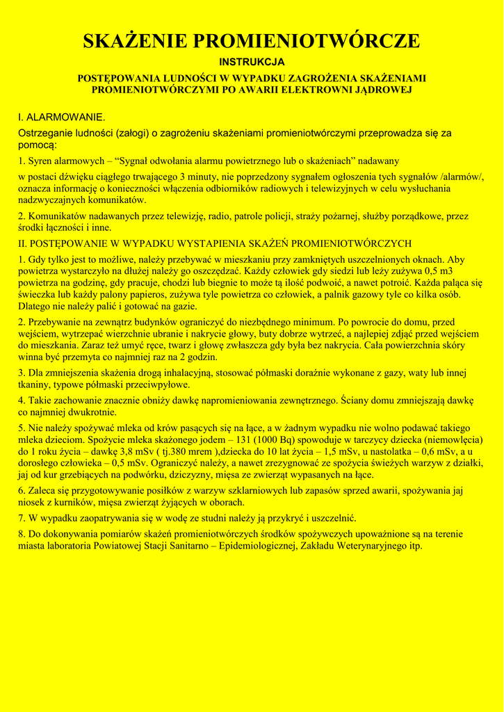 SKAŻENIE PROMIENIOTWÓRCZE INSTRUKCJA POSTĘPOWANIA LUDNOŚCI W WYPADKU ZAGROŻENIA SKAŻENIAMI PROMIENIOTWÓRCZYMI PO AWARII ELEKTROWNI JĄDROWEJ I. ALARMOWANIE. Ostrzeganie ludności (załogi) o zagrożeniu skażeniami promieniotwórczymi przeprowadza się za pomocą: 1. Syren alarmowych – “Sygnał odwołania alarmu powietrznego lub o skażeniach” nadawany w postaci dźwięku ciągłego trwającego 3 minuty, nie poprzedzony sygnałem ogłoszenia tych sygnałów /alarmów/, oznacza informację o konieczności włączenia odbiorników radiowych i telewizyjnych w celu wysłuchania nadzwyczajnych komunikatów. 2. Komunikatów nadawanych przez telewizję, radio, patrole policji, straży pożarnej, służby porządkowe, przez środki łączności i inne. II. POSTĘPOWANIE W WYPADKU WYSTAPIENIA SKAŻEŃ PROMIENIOTWÓRCZYCH 1. Gdy tylko jest to możliwe, należy przebywać w mieszkaniu przy zamkniętych uszczelnionych oknach. Aby powietrza wystarczyło na dłużej należy go oszczędzać. Każdy człowiek gdy siedzi lub leży zużywa 0,5 m3 powietrza na godzinę, gdy pracuje, chodzi lub biegnie to może tą ilość podwoić, a nawet potroić. Każda paląca się świeczka lub każdy palony papieros, zużywa tyle powietrza co człowiek, a palnik gazowy tyle co kilka osób. Dlatego nie należy palić i gotować na gazie. 2. Przebywanie na zewnątrz budynków ograniczyć do niezbędnego minimum. Po powrocie do domu, przed wejściem, wytrzepać wierzchnie ubranie i nakrycie głowy, buty dobrze wytrzeć, a najlepiej zdjąć przed wejściem do mieszkania. Zaraz też umyć ręce, twarz i głowę zwłaszcza gdy była bez nakrycia. Cała powierzchnia skóry winna być przemyta co najmniej raz na 2 godzin. 3. Dla zmniejszenia skażenia drogą inhalacyjną, stosować półmaski doraźnie wykonane z gazy, waty lub innej tkaniny, typowe półmaski przeciwpyłowe. 4. Takie zachowanie znacznie obniży dawkę napromieniowania zewnętrznego. Ściany domu zmniejszają dawkę co najmniej dwukrotnie. 5. Nie należy spożywać mleka od krów pasących się na łące, a w żadnym wypadku nie wolno podawać takiego mleka dzieciom. Spożycie mleka skażonego jodem – 131 (1000 Bq) spowoduje w tarczycy dziecka (niemowlęcia) do 1 roku życia – dawkę 3,8 mSv ( tj.380 mrem ),dziecka do 10 lat życia – 1,5 mSv, u nastolatka – 0,6 mSv, a u dorosłego człowieka – 0,5 mSv. Ograniczyć należy, a nawet zrezygnować ze spożycia świeżych warzyw z działki, jaj od kur grzebiących na podwórku, dziczyzny, mięsa ze zwierząt wypasanych na łące. 6. Zaleca się przygotowywanie posiłków z warzyw szklarniowych lub zapasów sprzed awarii, spożywania jaj niosek z kurników, mięsa zwierząt żyjących w oborach. 7. W wypadku zaopatrywania się w wodę ze studni należy ją przykryć i uszczelnić. 8. Do dokonywania pomiarów skażeń promieniotwórczych środków spożywczych upoważnione są na terenie miasta laboratoria Powiatowej Stacji Sanitarno – Epidemiologicznej, Zakładu Weterynaryjnego itp.