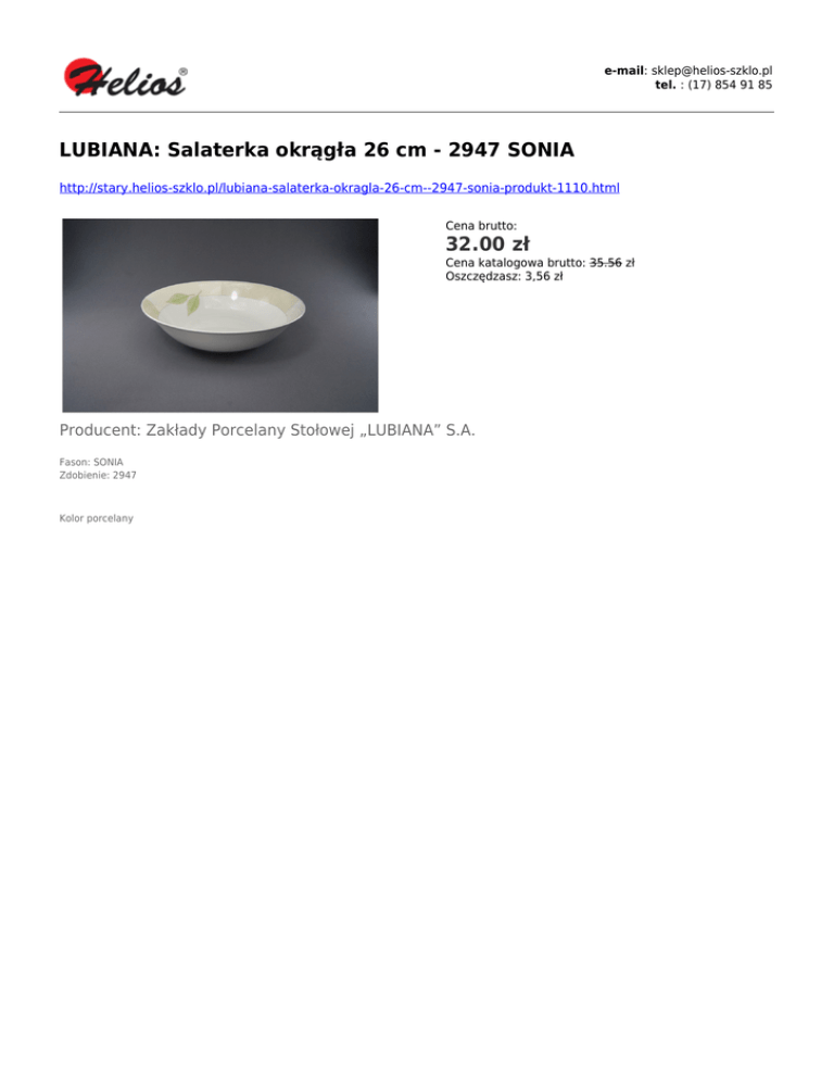 e-mail: [email protected] tel. : (17) 854 91 85 LUBIANA: Salaterka okrągła 26 cm - 2947 SONIA http://stary.helios-szklo.pl/lubiana-salaterka-okragla-26-cm--2947-sonia-produkt-1110.html Cena brutto: 32.00 zł Cena katalogowa brutto: 35.56 zł Oszczędzasz: 3,56 zł Producent: Zakłady Porcelany Stołowej „LUBIANA” S.A. Fason: SONIA Zdobienie: 2947 Kolor porcelany