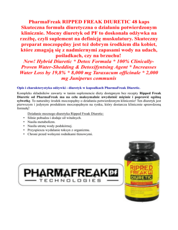 PharmaFreak RIPPED FREAK DIURETIC 48 kaps Skuteczna formuła diuretyczna o działaniu potwierdzonym klinicznie. Mocny diuretyk od PF to doskonała odżywka na rzeźbę, czyli suplement na definicję muskulatury. Skuteczny preparat moczopędny jest też dobrym środkiem dla kobiet, które zmagają się z nadmiernymi zapasami wody na udach, pośladkach, czy na brzuchu! New! Hybrid Diuretic * Detox Formula * 100% ClinicallyProven Water-Shedding & Detoxifyntsing Agent * Increasses Water Loss by 19,8% * 8,000 mg Taraxacum officinale * 2,000 mg Juniperus communis Opis i charakterystyka odżywki - diuretyk w kapsułkach PharmaFreak Diuretic. Kompleks składników zawarty w tanim suplemencie diety dostępnym bez recepty Ripped Freak Diuretic od PharmaFreak ma na celu maksymalnie uwydatnić mięśnie i poprawić ogólną sylwetkę. To naturalny środek moczopędny o działaniu potwierdzonym klinicznie! Ten diuretyk jest pierwszym i jedynym produktem moczopędnym na rynku, który dostarcza klinicznie sprawdzoną formułę! • • • • • Działanie mocnego diuretyka Ripped Freak Diuretic: Silnie pobudza i dodaje sił witalnych. Nasila metabolizm. Nasila utratę wody podskórnej. Przyspiesza wydalanie toksyn z organizmu. Chroni przed wolnymi rodnikami tlenowymi. Sposób działania oraz zastosowanie diuretycznej formuły od Pharma Freak: Ripped Freak Diuretic Sprawdzony suplement diety Ripped Freak Diuretic przyspiesza utratę tłuszczu i wody podskórnej w celu uzyskania najlepszej definicji. Ten skuteczny preparat pozwoli uzyskać Ci mięśnie twarde jak skała! Nowoczesna ekstremalna formuła uwalniająca wodę z tkanek - Ripped Freak Diuretic to sprawdzona odżywka, dzięki której zobaczysz rezultaty! W każdym momencie dźwigasz na sobie około pięciu dodatkowych kilogramów wody, jest to naturalne zjawisko, znane jako woda podskórna. Jeśli jesteś kulturystą, woda podskórna może uniemożliwić ci dojście do szczytowej formy niezbędnej podczas następnych zawodów. W takiej sytuacji właśnie sprawdzi się amerykański diuretyk Ripped Freak Diuretic o działaniu moczopędnym oraz detoksykującym (oczyszczającym organizm z toksyn). Amerykański diuretyk od PharmaFreak znajdzie również zastosowanie jako fat burner: jeśli chcesz szybko zrzucić parę kilogramów! RippedFreak Diuretic pozwala pozbyć się zbędnej wody z organizmu, a w efekcie pozwala na szybkie odchudzanie. Składniki aktywne ziołowego suplementu o działaniu moczopędnym RippedFreak Diuretic: • Taraxacum officinale - mniszek pospolity, • Juniperus communis - jałowiec pospolity, • Magnez. Warto spróbować wszystkich produktów firmy Pharma Freak! Ripped Freak Diuretic został stworzony, by ułatwić pozbycie się nadmiaru nagromadzonej wody podskórnej, poprawy definicji oraz poprawę widoczności unaczynienia. Zobacz jak dawkować suplement oraz sposób użycia formuły diuretycznej od Pharma Freak: Stosuj 4 kapsułki rano i 4 kapsułki po południu. Opcjonalnie: weź dodatkowe 4 kapsułki wieczorem. Pij 500 ml wody do każdej dawki suplementu. Stosuj nie dłużej niż przez 3 kolejne dni. Opis i charakterystyka • 1 porcja = 4 kapsułki diuretyka • Ilość porcji w opakowaniu: 12 • Zawartość opakowania: 48 kapsułek suplementu Składniki aktywne w jednej porcji 4 kaps.: www.kulturystyka.sklep.pl