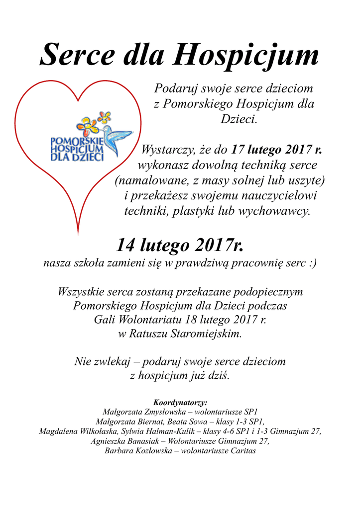 Serce dla Hospicjum Podaruj swoje serce dzieciom z Pomorskiego Hospicjum dla Dzieci. Wystarczy, że do 17 lutego 2017 r. wykonasz dowolną techniką serce (namalowane, z masy solnej lub uszyte) i przekażesz swojemu nauczycielowi techniki, plastyki lub wychowawcy. 14 lutego 2017r. nasza szkoła zamieni się w prawdziwą pracownię serc :) Wszystkie serca zostaną przekazane podopiecznym Pomorskiego Hospicjum dla Dzieci podczas Gali Wolontariatu 18 lutego 2017 r. w Ratuszu Staromiejskim. Nie zwlekaj – podaruj swoje serce dzieciom z hospicjum już dziś. Koordynatorzy: Małgorzata Zmysłowska – wolontariusze SP1 Małgorzata Biernat, Beata Sowa – klasy 1-3 SP1, Magdalena Wilkołaska, Sylwia Halman-Kulik – klasy 4-6 SP1 i 1-3 Gimnazjum 27, Agnieszka Banasiak – Wolontariusze Gimnazjum 27, Barbara Kozłowska – wolontariusze Caritas