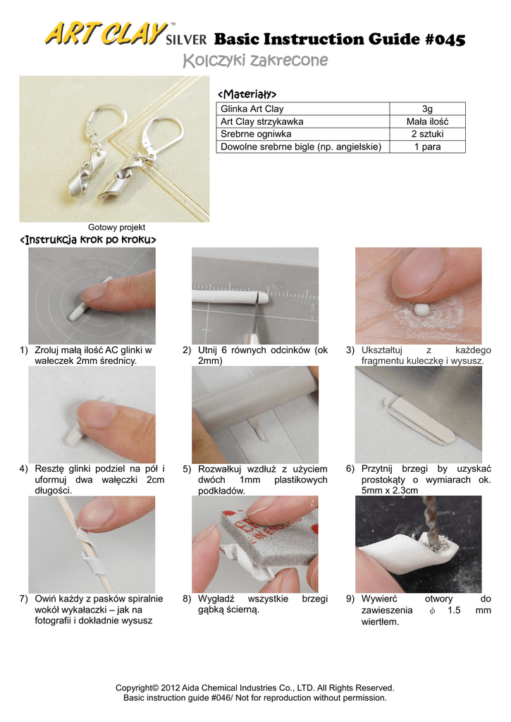 Basic Instruction Guide #045 Kolczyki zakrecone <Materiały>< Glinka Art Clay Art Clay strzykawka Srebrne ogniwka Dowolne srebrne bigle (np. angielskie) 3g Mała ilość 2 sztuki 1 para Gotowy projekt <Instrukcja krok po kroku> 1) Zroluj małą ilość AC glinki w wałeczek 2mm średnicy. 2) Utnij 6 równych odcinków (ok 2mm) 3) Ukształtuj z każdego fragmentu kuleczkę i wysusz. 4) Resztę glinki podziel na pół i uformuj dwa wałęczki 2cm długości. 5) Rozwałkuj wzdłuż z użyciem dwóch 1mm plastikowych podkładów. 6) Przytnij brzegi by uzyskać prostokąty o wymiarach ok. 5mm x 2.3cm 7) Owiń każdy z pasków spiralnie wokół wykałaczki – jak na fotografii i dokładnie wysusz 8) Wygładź wszystkie gąbką ścierną. 9) Wywierć zawieszenia wiertłem. brzegi Copyright© 2012 Aida Chemical Industries Co., LTD. All Rights Reserved. Basic instruction guide #046/ Not for reproduction without permission. otwory φ 1.5 do mm 10) Przymocuj papier ścierny (np #320) do płaskiej powierzchni taśmą dwustronną 11) Tak przygotowanym narzędziem wygładź wysuszone kuleczki 13) Użyj małej ilości materiału ze strzykawki do połączenia. 14) Umieść po 3 kuleczki każdym z elementów. 12) Jeśli kuleczki nie mieszczą się w szczelinach użyj frezu - np φ2mm (jak na zdjęciu). w 15) Jeśli potrzeba użyj zwilżonego pędzelka do wygładzenia. Wysusz i wypalaj w 800C przez 5minut. 16) Wypoleruj metalową szczotką a lustrzany połysk nadaj polernikiem. Z użyciem ogniwek zamocuj elementy na biglach. Copyright© 2012 Aida Chemical Industries Co., LTD. All Rights Reserved. Basic instruction guide #046/ Not for reproduction without permission.