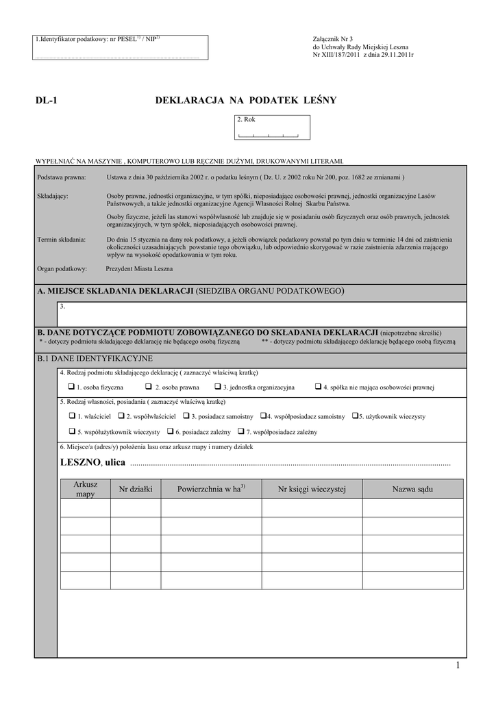 Uchwała Nr 187- Zał nr 3 - DL-1 Deklaracja na podatek leśny
