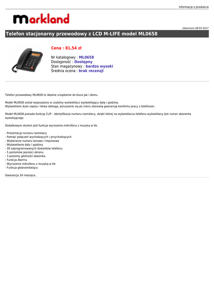 Telefon stacjonarny przewodowy z LCD M-LIFE model