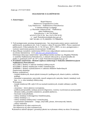 Potrzebowice, dnia 1.07.2010r. Znak spr. 2717/4/37/2010 OGŁOSZENIE O ZAMÓWIENIU 1. Zamawiający: Skarb Państwa Państwowe Gospodarstwo Leśne Lasy Państwowe – Nadleśnictwo Potrzebowice w imieniu którego występuje p. Hieronim Adamczewski – Nadleśniczy adres Nadleśnictwa: Potrzebowice 1, 64-730 Wieleń tel (0 67) 256 25 26, fax ( 0 67) 256 24 92, e – mail: [email protected] NIP 763-001-12-79, REGON P-570064470 2. Tryb postępowania: przetarg nieograniczony - bez stosowania ustawy prawo zamówień publicznych, na podstawie art. 4 ust. 8 ustawy z dnia 29 stycznia 2004 r. Prawo zamówień publicznych (Tekst jednolity Dz. U. Nr 223 poz. 1655 z 2007r. ze zm.), postępowanie o wartości zamówienia poniżej równowartości 14.000 euro. 3. Specyfikacja warunków zamówienia (SWZ) wraz załącznikami zamieszczona jest na stronie internetowej: www.pila.lasy.gov.pl/potrzebowice Informacje dotyczące zamówienia i specyfikacji można uzyskać u p. Bogdana Walichta w siedzibie Nadleśnictwa Potrzebowice, w dniach roboczych tj. od poniedziałku do piątku w godzinach od 8ºº do 14ºº e-mail: [email protected] 4. Przedmiot zamówienia : Remont zaplecza sanitarnego w budynku administracyjnym Nadleśnictwa Potrzebowice 45311200-2 Roboty w zakresie instalacji elektrycznych 45332000-3 Roboty instalacyjne wodne i kanalizacyjne 45400000-1 Roboty wykończeniowe w zakresie obiektów budowlanych Zamówienie obejmuje: Roboty rozbiórkowe: - ścianek działowych, skucie płytek ściennych i podłogowych, skucie tynków, rozbiórka podłogi, - demontaż wyposażenia: umywalek, muszli ustępowych, natrysku, baterii, instalacji wodkan. i c. o. oraz instalacji elektrycznej, Wykonanie: - ścianki działowej GR z płyt G-K na rusztach metalowych, ścianki szklanej z profilu PCW, - ościeżnice + drzwi płytowe wewnętrzne, - podłoża pod posadzki, izolacje przeciwwilgociowe, warstwy wyrównawcze pod posadzki zbrojone siatką, posadzki cementowe, posadzki płytkowe, - licowanie ścian płytkami, - roboty instalacji wodociągowej i kanalizacyjnej,, - roboty instalacji c. o. - roboty instalacji elektrycznej i wentylacyjnej, - wyposażenie sanitariatów – ustępy, umywalki, pisuar, zlewozmywak, baterie, - roboty malarskie. Nie dopuszcza się ofert częściowych. Nie dopuszcza się ofert wariantowych. Wykonawca udzieli rękojmi i gwarancji jakości na wykonane roboty na okres 24 miesięcy. 6. Termin wykonania zamówienia – 50 dni od daty podpisania umowy. 7. Warunki udziału w postępowaniu W przetargu mogą brać udział wykonawcy, którzy spełnią warunki określone w specyfikacji warunków zamówienia. Sposób dokonania oceny spełnienia warunków: na podstawie złożonych oświadczeń i dokumentów przewidzianych w SWZ. 8. Wadium: Zamawiający nie żąda wadium. 9. Kryteria oceny ofert i ich znaczenie: cena wykonania zamówienia = 100% 10. Oferty należy składać do dnia 15.07.2010r. do godz. 9ºº w sekretariacie Nadleśnictwa Potrzebowice. 11. Otwarcie ofert nastąpi w dniu 15.07.2010r. o godz. 9³º pokój nr 16, salka narad w Nadleśnictwie Potrzebowice. 12. Termin związania ofertą – 30 dni od ostatecznego terminu składania ofert. 13. Zamawiający nie przewiduje dokonywania wyboru oferty najkorzystniejszej z zastosowaniem aukcji elektronicznej. 14. Zamawiający zastrzega sobie prawo wyboru ofert, bez prawa protestów i odwołań. 15. Przekazywanie zapytań, zawiadomień, oświadczeń, wniosków, informacji odbywać się może pisemnie, faxem lub e-mailem. Podpisał: Nadleśniczy mgr inż. Hieronim Adamczewski