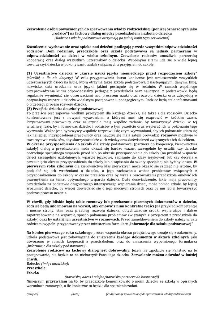 Zezwolenie osób upoważnionych do sprawowania władzy rodzicielskiej (poniżej oznaczonych jako „rodzice“) na fachowy dialog między przedszkolem a szkołą o dziecku (Rodzice i szkoła podstawowa otrzymają po jednej kopii tego zezwolenia) Kształcenie, wychowanie oraz opieka nad dziećmi podlegają przede wszystkim odpowiedzialności rodziców. Dom rodzinny, przedszkole oraz szkoła podstawowa są jednak partnerami w odpowiedzialności za dzieci w wieku szkolnym. Zezwolenie rodziców umożliwia partnerską kooperację oraz dialog wszystkich uczestników o dziecku. Wspólnymi siłami uda się o wiele lepiej towarzyszyć dziecku w pokonywaniu zadań związanych z przyjęciem do szkoły. (1) Uczestnictwo dziecka w „kursie nauki języka niemieckiego przed rozpoczęciem szkoły” (skreślić, o ile nie dotyczy) W celu przygotowania kursu konieczne jest umieszczenie wszystkich uczestniczących dzieci na liście, którą otrzyma także szkoła podstawowa, z następującymi danymi: Imię, nazwisko, data urodzenia oraz języki, jakimi posługuje się w rodzinie. W ramach wspólnego przeprowadzenia kursu odpowiedzialny pedagog z przedszkola oraz nauczyciel z podstawówki będą regularnie wymieniać się obserwacjami nad procesem nauki oraz rozwoju dziecka oraz zdecydują o optymalnym wsparciu dziecka w dalszym postępowaniu pedagogicznym. Rodzice będą stale informowani o przebiegu procesu rozwoju dziecka. (2) Przejście dziecka do szkoły podstawowej To przejście jest zapewne wielkim przeżyciem dla każdego dziecka, ale także i dla rodziców. Dziecko konfrontowane jest z nowymi wyzwaniami, z którymi musi się rozprawić w krótkim czasie. Przystosowani pracownicy oraz nauczyciele mają wspólne zadanie, by towarzyszyć dziecku w tej wrażliwej fazie, by informować dziecko i rodziców o tym przejściu oraz wspierać ich w pokonaniu tego wyzwania. Ważne jest, by wszyscy wspólnie rozprawili się z tym wyzwaniami, aby ich pokonanie udało się jak najlepiej. Przysposobieni pracownicy oraz nauczyciele mają zatem prowadzić rozmowy możliwie w towarzystwie rodziców, aby skorzystać także z ich wiedzy oraz doświadczeń związanych z ich dzieckiem. W okresie przysposobienia do szkoły dla szkoły podstawowej (partnera do kooperacji, kierownictwa szkoły) dialog z przedszkolem może okazać się bardzo ważny, szczególnie by ustalić, czy dziecko potrzebuje specjalnego wsparcia przed lub po okresie przysposobienia do szkoły (na przykład wsparcie dzieci szczególnie uzdolnionych, wparcie językowe, zapisanie do klasy językowej) lub czy decyzja o przesunięciu okresu przysposobienia do szkoły lub o zapisaniu do szkoły specjalnej nie byłaby lepsza. W pierwszym roku szkolnym dla kierownictwa klas pierwszych może okazać się szczególnie istotne, by podzielić się ich wrażeniami o dziecku, o jego zachowaniu wobec problemów związanych z przysposobieniem do szkoły w czasie przejścia oraz by wraz z pracownikami przedszkola omówić ich przemyślenia na temat optymalnego wsparcia dziecka. Duże doświadczenie, jakie mają pracownicy przedszkola na podstawie długoletniego intensywnego wspierania dzieci, może pomóc szkole, by lepiej zrozumieć dziecko, by więcej dowiedzieć się o jego mocnych stronach oraz by mu lepiej towarzyszyć podczas procesu uczenia. W chwili, gdy bliskie będą takie rozmowy lub przekazanie pisemnych dokumentów o dziecku, rodzice będą informowani na wyrost, aby omówić z nimi konkretne treści (na przykład kompetencje i mocne strony, stan oraz przebieg rozwoju dziecka, dotychczasowe środki wspierające i dalsze zapotrzebowanie na wsparcie, sposób pokonania problemów związanych z przejściem z przedszkola do szkoły) oraz by ustalić ich uczestnictwo w rozmowach. Przed zameldowaniem do szkoły należy wraz z rodzicami wypełni przygotowany przez ministerium formularz „Informacje dla szkołu podstawowej“ . Na koniec pierwszego roku szkolnego proces wsparcia okresu przejściowego uznaje się z zakończony. Szkoła podstawowa jest zobowiązana do zniszczenia każdego dokumentu w aktach szkolnych, jaki utworzono w ramach kooperacji z przedszkolem, oraz do zniszczenia wypełnionego formularza „Informacje dla szkoły podstawowej“. Zezwolenie rodziców na fachowy dialog jest dobrowalny. Jeżeli nie zgodzicie się Państwo na to postępowanie, nie będzie to na niekorzyść Pańskiego dziecka. Zezwolenie można odwołać w każdej chwili. Dziecko (imię i nazwisko): Przeszkole: Szkoła: (nazwisko, adres i telefon/nazwisko partnera do kooperacji) Niniejszym przyzwalam na to, by przedszkole komunikowało o moim dziecku ze szkołą w opisanych warunkach ramowych, o ile konieczne to będzie dla spełnienia zadań. (miejsce) (data) (Podpis osoby upoważnionej do sprawowania władzy rodzicielskiej)