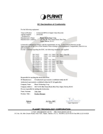 (TŁUMACZENIE DEKLARACJI ZGODNOŚCI) CE Deklaracja zgodności Niniejszym potwierdza się, że następujące urządzenie: *Typ produktu: 8 *Model: kanałowy cyfrowy rejestrator wideo MPEG-4 DVR-860 * Wyprodukowany przez: Nazwa producenta: Adres producenta: Planet Technology Corp. 11F, No 96, Min Chuan Road Hsin Tien, Taipei, Taiwan , R. O.C. jest zgodna z dyrektywami Rady UE odnośnie zunifikowania praw członków w odniesieniu do Dyrektyw i spełnia wymagania obowiązującej Dyrektywy EMC (89/336/EEC). W zakresie zgodności z EMC, uwzględniono następujące normy: EN 55022 EN 55024 EN 61000-3-2 EN 61000-3-3 EN 50130-4 EN 61000-4-2 EN 61000-4-3 EN 61000-4-4 EN 61000-4-5 EN 61000-4-6 EN 61000-4-11 (1998+A1:2000+A2:2003, Class B) (1995 + A1:1998 + A2:2003) (2000) (1995+A1:2001) (1995+A1:1998+1998+A2:2003) (1995+A1:1998+A2:2001) (2002+A1:2002) (1995+A2:2001) (1995+A1:2001) (1996+A1:2001) (1994+A1:2001) Odpowiedzialny za sporządzenie tej deklaracji jest: Autoryzowany przedstawiciel na terenie Unii Europejskiej Producent Nazwa firmy: Adres firmy: Planet Technology Corp. 11F, No.96, Min Chuan Road, Hsin Tien, Taipei, Taiwan, R.O.C Osoba odpowiedzialna za sporządzenie tej deklaracji Imię i nazwisko John Sung Stanowisko / Tytuł: Product Manager Tajwan 12Listopad 2007 Podpis PLANET TECHNOLOGY CORPORATION e-mail: [email protected] http://www.planet.com.tw 11F, No. 96, Min Chuan Road, Hsin Tien, Taipei, Taiwan, R.O.C. Tel:886-2-2219-9518 Fax:886-2-2219-9528