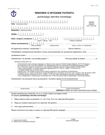 Zał. nr 5b pieczęć PZŻ / OZŻ WNIOSEK O WYDANIE PATENTU jachtowego sternika morskiego |_|_|_|_|_|_|_|_|_|_|_|_|_|_|_|_|_|_|_|_|_|_|_|_|_| Imię (drukowane litery) |_|_|_|_|_|_|_|_|_|_|_|_|_|_|_|_|_|_|_|_|_|_|_|_|_|_|_|_|_|_|_|_| nakleić zdjęcie 3,5 x 4,5 cm Nazwisko (drukowane litery) PESEL: |_|_|_|_|_|_|_|_|_|_|_| Data i miejsce urodzenia: |_|_| - |_|_| - |_|_|_|_| |_|_|_|_|_|_|_|_|_|_|_|_|_|_|_| (dzień – miesiąc – rok) Adres zamieszkania: |_|_| - |_|_|_| (miejsce urodzenia) ..................................... ................................................................. (kod pocztowy) (miejscowość) (ulica, nr domu, nr mieszkania) 1 Nr legitymacji szkolnej / studenckiej / .................................................. Numer telefonu: .............................. Przedkładam zaświadczenie lekarskie o braku przeciwwskazań do uprawiania żeglarstwa z dnia ..................... wystawione przez 2/ ............................................................................................................................................. 1 Oświadczam, że potrafię / nie potrafię pływać /. Wnoszę opłatę za patent: ................... zł. Uprzejmie informujemy, że: - administratorem zbioru danych osobowych, o których mowa wyżej jest Polski Związek Żeglarski, 00-791 Warszawa, ul. Chocimska 14 lok. 216, KRS: 0000081118, Sąd Rejonowy dla m.st. Warszawy XX Wydział Gospodarczy KRS, Pani / Pana dane osobowe są zbierane w celu realizacji delegacji zawartej w rozporządzeniu Ministra Sportu z dnia 9 czerwca 2006 r. w sprawie uprawiania żeglarstwa § 2 i § 7 (Dz.U. z 2006 r. nr 105 poz.712) i nie będą udostępniane do innych celów, posiada Pani / Pan dostęp do treści swoich danych osobowych oraz możliwości ich poprawiania, udostępnienie w.w. danych osobowych nie jest obowiązkowe w rozumieniu art.24 ust.1 pkt.4 ustawy z dnia 29 sierpnia 1997r. o ochronie danych osobowych (tj. Dz.U. z 2002 r. nr 101 poz.926 z późniejszymi zmianami), jednakże brak zgody na ich udostępnienie i przetwarzanie uniemożliwi Pani / Panu otrzymanie stopnia żeglarskiego i stosownego patentu. Oświadczam, że powyższe dane są poprawne i wyrażam zgodę na ich przetwarzanie. BBBBBBBB.BBBBB.. dnia ................................ (miejscowość) podpis wnioskodawcy (UWAGA! Podpis nie może wychodzić poza ramkę!) Zespół weryfikacyjny stwierdza, że w.w. osoba odbyła wymagane staże na stopień jachtowego sternika morskiego: 1. Rejsy pełnomorskie na jachtach o Lc od 12 do 18 m (co najmniej 200 godzin): ............................................ 2. Rejsy po wodach pływowych (co najmniej 100 godzin): ................................................................................. 3. Inne rejsy pełnomorskie: ................................................................................................................................. Razem (minimum trzy rejsy w czasie co najmniej 600 godzin żeglugi).................................................................. ................................................. dnia ..................... 1/ niepotrzebne skreślić 2/ wpisać numer statystyczny lekarza ................................................................................... podpis zespół weryfikacyjny mz