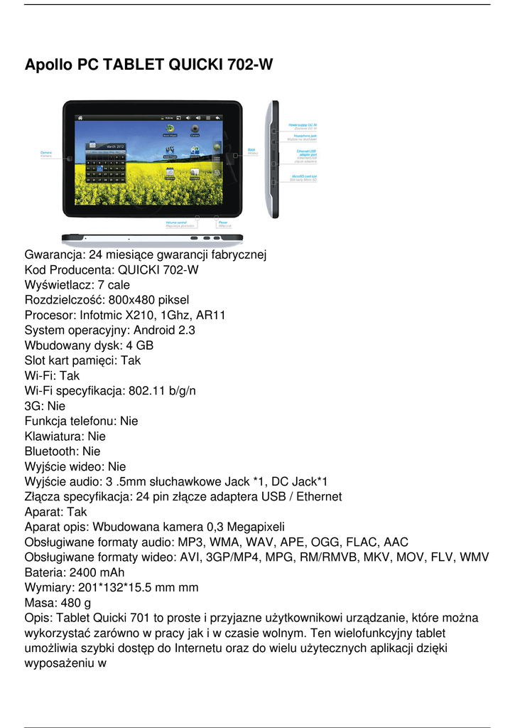 Apollo PC TABLET QUICKI 702-W Gwarancja: 24 miesiące gwarancji fabrycznej Kod Producenta: QUICKI 702-W Wyświetlacz: 7 cale Rozdzielczość: 800x480 piksel Procesor: Infotmic X210, 1Ghz, AR11 System operacyjny: Android 2.3 Wbudowany dysk: 4 GB Slot kart pamięci: Tak Wi-Fi: Tak Wi-Fi specyfikacja: 802.11 b/g/n 3G: Nie Funkcja telefonu: Nie Klawiatura: Nie Bluetooth: Nie Wyjście wideo: Nie Wyjście audio: 3 .5mm słuchawkowe Jack *1, DC Jack*1 Złącza specyfikacja: 24 pin złącze adaptera USB / Ethernet Aparat: Tak Aparat opis: Wbudowana kamera 0,3 Megapixeli Obsługiwane formaty audio: MP3, WMA, WAV, APE, OGG, FLAC, AAC Obsługiwane formaty wideo: AVI, 3GP/MP4, MPG, RM/RMVB, MKV, MOV, FLV, WMV Bateria: 2400 mAh Wymiary: 201*132*15.5 mm mm Masa: 480 g Opis: Tablet Quicki 701 to proste i przyjazne użytkownikowi urządzanie, które można wykorzystać zarówno w pracy jak i w czasie wolnym. Ten wielofunkcyjny tablet umożliwia szybki dostęp do Internetu oraz do wielu użytecznych aplikacji dzięki wyposażeniu w Android Market. 7-calowy dotykowy wyświetlacz LCD pozwala na komfortowe oglądanie filmów czy przeglądanie wybranych aplikacji. Wbudowany aparat umożliwia uchwycenie wszystkich ważnych momentów, a intuicyjne i przejrzyste menu pozwala na sprawną nawigacje. Informacje dodatkowe: Ekran rezystancyjny, Pamięć RAM: 256MB DDR2, Wbudowany głośnik, Wbudowany mikrofon, Obsługiwane Pliki graficzne: JPG, JPEG, BMP and PNG, Menu w języku polskim, Gniazdo karty microSD, max 32GB , Ładowarka sieciowa w komplecie. Wszystkie tablety Apollo objęte są wspólną promocją z Empikiem. Do każdej sztuki dołączony jest kupon rabatowy 25% na jednorazowy zakup e-booków, dodatkowo każdy klient empik.com po zalogowaniu będzie miał dostęp do darmowej bazy e-booków ponad 6000 tytułów. Cena: 235.99 PLN Powered by TCPDF (www.tcpdf.org)