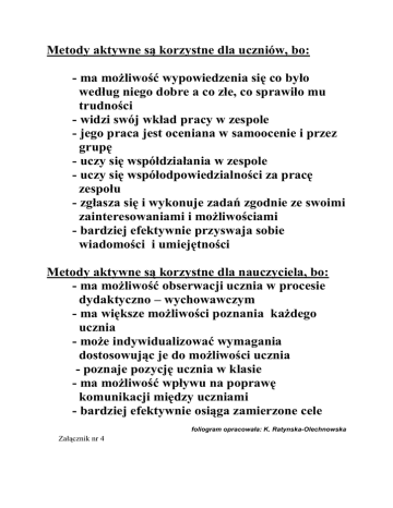 Metody aktywne są korzystne dla uczniów, bo: - ma moŜliwość wypowiedzenia się co było według niego dobre a co złe, co sprawiło mu trudności - widzi swój wkład pracy w zespole - jego praca jest oceniana w samoocenie i przez grupę - uczy się współdziałania w zespole - uczy się współodpowiedzialności za pracę zespołu - zgłasza się i wykonuje zadań zgodnie ze swoimi zainteresowaniami i moŜliwościami - bardziej efektywnie przyswaja sobie wiadomości i umiejętności Metody aktywne są korzystne dla nauczyciela, bo: - ma moŜliwość obserwacji ucznia w procesie dydaktyczno – wychowawczym - ma większe moŜliwości poznania kaŜdego ucznia - moŜe indywidualizować wymagania dostosowując je do moŜliwości ucznia - poznaje pozycję ucznia w klasie - ma moŜliwość wpływu na poprawę komunikacji między uczniami - bardziej efektywnie osiąga zamierzone cele foliogram opracowała: K. Ratynska-Olechnowska Załącznik nr 4