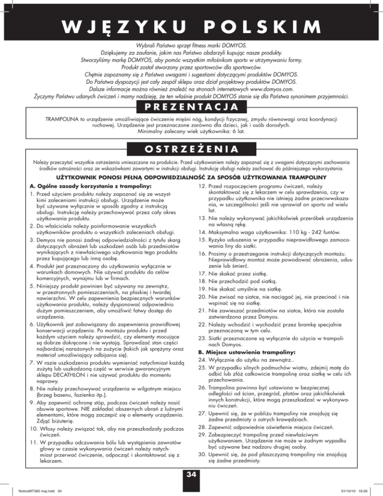 WJĘZYKU POLSKIM Wybrali Państwo sprzęt fitness marki DOMYOS. Dziękujemy za zaufanie, jakim nas Państwo obdarzyli kupując nasze produkty. Stworzyliśmy markę DOMYOS, aby pomóc wszystkim miłośnikom sportu w utrzymywaniu formy. Produkt został stworzony przez sportowców dla sportowców. Chętnie zapoznamy się z Państwa uwagami i sugestiami dotyczącymi produktów DOMYOS. Do Państwa dyspozycji jest cały zespół sklepu oraz dział projektowy produktów DOMYOS. Dalsze informacje można również znaleźć na stronach internetowych www.domyos.com. Życzymy Państwu udanych ćwiczeń i mamy nadzieję, że ten właśnie produkt DOMYOS stanie się dla Państwa synonimem przyjemności. P R E Z E N TA C J A TRAMPOLINA to urządzenie umożliwiające ćwiczenie mięśni nóg, kondycji fizycznej, zmysłu równowagi oraz koordynacji ruchowej. Urządzenie jest przeznaczone zarówno dla dzieci, jak i osób dorosłych. Minimalny zalecany wiek użytkownika: 6 lat. OSTRZEŻENIA Należy przeczytać wszystkie ostrzeżenia umieszczone na produkcie. Przed użytkowaniem należy zapoznać się z uwagami dotyczącymi zachowania środków ostrożności oraz ze wskazówkami zawartymi w instrukcji obsługi. Instrukcję obsługi należy zachować do późniejszego wykorzystania. UŻYTKOWNIK PONOSI PEŁNĄ ODPOWIEDZIALNOŚĆ ZA SPOSÓB UŻYTKOWANIA TRAMPOLINY 12. Przed rozpoczęciem programu ćwiczeń, należy skontaktować się z lekarzem w celu sprawdzenia, czy w przypadku użytkownika nie istnieją żadne przeciwwskazania, w szczególności jeśli nie uprawiał on sportu od wielu lat. A. Ogólne zasady korzystania z trampoliny: 1. Przed użyciem produktu należy zapoznać się ze wszystkimi zaleceniami instrukcji obsługi. Urządzenie może być używane wyłącznie w sposób zgodny z instrukcją obsługi. Instrukcję należy przechowywać przez cały okres użytkowania produktu. 13. Nie należy wykonywać jakichkolwiek przeróbek urządzenia na własną rękę. 2. Do właściciela należy poinformowanie wszystkich użytkowników produktu o wszystkich zaleceniach obsługi. 14. Maksymalna waga użytkownika: 110 kg - 242 funtów. 15. Ryzyko uduszenia w przypadku nieprawidłowego zamocowania liny do siatki. 3. Demyos nie ponosi żadnej odpowiedzialności z tytułu skarg dotyczących obrażeń lub uszkodzeń osób lub przedmiotów wynikających z niewłaściwego użytkowania tego produktu przez kupującego lub inną osobę. 16. Prosimy o przestrzeganie instrukcji dotyczących montażu. Nieprawidłowy montaż może powodować obrażenia, uduszenie lub śmierć. 4. Produkt jest przeznaczony do użytkowania wyłącznie w warunkach domowych. Nie używać produktu do celów komercyjnych, wynajmu lub w firmach. 17. Nie skakać przez siatkę. 18. Nie przechodzić pod siatką. 5. Niniejszy produkt powinien być używany na zewnątrz, w przestronnych pomieszczeniach, na płaskiej i twardej nawierzchni. W celu zapewnienia bezpiecznych warunków użytkowania produktu, należy dysponować odpowiednio dużym pomieszczeniem, aby umożliwić łatwy dostęp do urządzenia. 19. Nie skakać umyślnie na siatkę. 20. Nie zwisać na siatce, nie naciągać jej, nie przecinać i nie wspinać się na siatkę. 21. Nie zawieszać przedmiotów na siatce, która nie została zatwierdzona przez Domyos. 6. Użytkownik jest zobowiązany do zapewnienia prawidłowej konserwacji urządzenia. Po montażu produktu i przed każdym użyciem należy sprawdzić, czy elementy mocujące są dobrze dokręcone i nie wystają. Sprawdzać stan części najbardziej narażonych na zużycie (takich jak sprężyny oraz materiał umożliwiający odbijania się). 22. Należy wchodzić i wychodzić przez bramkę specjalnie przeznaczoną w tym celu. 23. Siatki przeznaczone są wyłącznie do użycia w trampolinach Domyos. B. Miejsce ustawienia trampoliny: 24. Wyłącznie do użytku na zewnątrz.. 7. W razie uszkodzenia produktu wymieniać natychmiast każdą zużytą lub uszkodzoną część w serwisie gwarancyjnym sklepu DECATHLON i nie używać produktu do momentu naprawy. 25. W przypadku silnych podmuchów wiatru, zdejmij matę do odbić lub złóż całkowicie trampolinę oraz siatkę w celu ich przechowania. 26. Trampolina powinna być ustawiona w bezpiecznej odległości od ścian, przegród, płotów oraz jakichkolwiek innych konstrukcji, które mogą przeszkadzać w wykonywaniu ćwiczeń. 27. Upewnić się, że w pobliżu trampoliny nie znajdują się żadne przedmioty o ostrych krawędziach. 28. Zapewnić odpowiednie oświetlenie miejsca ćwiczeń. 29. Zabezpieczyć trampolinę przed niewłaściwym użytkowaniem. Urządzenie nie może w żadnym wypadku być używane bez nadzoru drugiej osoby. 30. Upewnić się, że pod płaszczyzną trampoliny nie znajdują się żadne przedmioty. 8. Nie należy przechowywać urządzenia w wilgotnym miejscu (brzeg basenu, łazienka itp.). 9. Aby zapewnić ochronę stóp, podczas ćwiczeń należy nosić obuwie sportowe. NIE zakładać obszernych ubrań z luźnymi elementami, które mogą zaczepić się o elementy urządzenia. Zdjąć biżuterię. 10. Włosy należy związać tak, aby nie przeszkadzały podczas ćwiczeń. 11. W przypadku odczuwania bólu lub wystąpienia zawrotów głowy w czasie wykonywania ćwiczeń należy natychmiast przerwać ćwiczenie, odpocząć i skontaktować się z lekarzem. 34 NoticeMT365 maj.indd 34 01/10/10 16:26 WJĘZYKU POLSKIM 31. Należy upewnić się, czy nikt nie znajduje się pod matą do odbić. 43. Nie należy ćwiczyć, jeśli użytkownik czuje się zmęczony. 44. Nie pozostawiać trampoliny bez nadzoru osoby dorosłej, znającej zasady bezpiecznego korzystania z urządzenia. C. Korzystanie z trampoliny: 32. Nie należy wykonywać figur akrobatycznych. Lądowanie na głowie lub karku jest bardzo niebezpieczne i może spowodować odniesienie bardzo poważnych, a nawet śmiertelnych obrażeń. 45. W bezpośrednim otoczeniu trampoliny nie powinny znajdować się żadne przeszkod