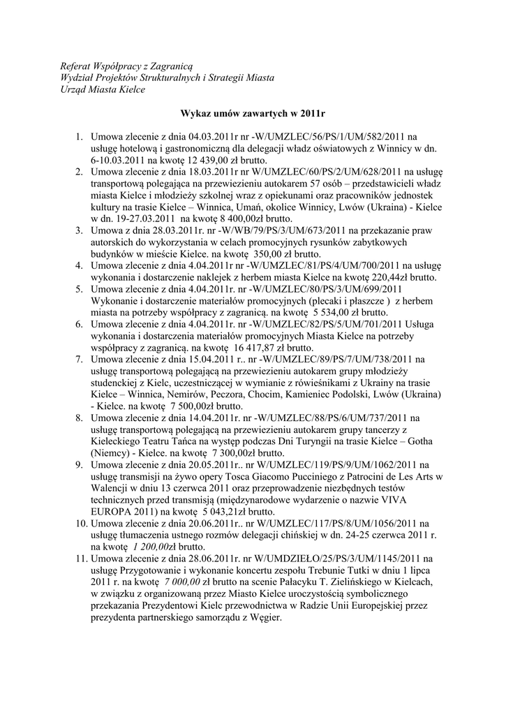 Referat Współpracy z Zagranicą Wydział Projektów Strukturalnych i Strategii Miasta Urząd Miasta Kielce Wykaz umów zawartych w 2011r 1. Umowa zlecenie z dnia 04.03.2011r nr -W/UMZLEC/56/PS/1/UM/582/2011 na usługę hotelową i gastronomiczną dla delegacji władz oświatowych z Winnicy w dn. 6-10.03.2011 na kwotę 12 439,00 zł brutto. 2. Umowa zlecenie z dnia 18.03.2011r nr W/UMZLEC/60/PS/2/UM/628/2011 na usługę transportową polegająca na przewiezieniu autokarem 57 osób – przedstawicieli władz miasta Kielce i młodzieży szkolnej wraz z opiekunami oraz pracowników jednostek kultury na trasie Kielce – Winnica, Umań, okolice Winnicy, Lwów (Ukraina) - Kielce w dn. 19-27.03.2011 na kwotę 8 400,00zł brutto. 3. Umowa z dnia 28.03.2011r. nr -W/WB/79/PS/3/UM/673/2011 na przekazanie praw autorskich do wykorzystania w celach promocyjnych rysunków zabytkowych budynków w mieście Kielce. na kwotę 350,00 zł brutto. 4. Umowa zlecenie z dnia 4.04.2011r nr -W/UMZLEC/81/PS/4/UM/700/2011 na usługę wykonania i dostarczenie naklejek z herbem miasta Kielce na kwotę 220,44zł brutto. 5. Umowa zlecenie z dnia 4.04.2011r. nr -W/UMZLEC/80/PS/3/UM/699/2011 Wykonanie i dostarczenie materiałów promocyjnych (plecaki i płaszcze ) z herbem miasta na potrzeby współpracy z zagranicą. na kwotę 5 534,00 zł brutto. 6. Umowa zlecenie z dnia 4.04.2011r. nr -W/UMZLEC/82/PS/5/UM/701/2011 Usługa wykonania i dostarczenia materiałów promocyjnych Miasta Kielce na potrzeby współpracy z zagranicą. na kwotę 16 417,87 zł brutto. 7. Umowa zlecenie z dnia 15.04.2011 r.. nr -W/UMZLEC/89/PS/7/UM/738/2011 na usługę transportową polegającą na przewiezieniu autokarem grupy młodzieży studenckiej z Kielc, uczestniczącej w wymianie z rówieśnikami z Ukrainy na trasie Kielce – Winnica, Nemirów, Peczora, Chocim, Kamieniec Podolski, Lwów (Ukraina) - Kielce. na kwotę 7 500,00zł brutto. 8. Umowa zlecenie z dnia 14.04.2011r. nr -W/UMZLEC/88/PS/6/UM/737/2011 na usługę transportową polegającą na przewiezieniu autokarem grupy tancerzy z Kieleckiego Teatru Tańca na występ podczas Dni Turyngii na trasie Kielce – Gotha (Niemcy) - Kielce. na kwotę 7 300,00zł brutto. 9. Umowa zlecenie z dnia 20.05.2011r.. nr W/UMZLEC/119/PS/9/UM/1062/2011 na usługę transmisji na żywo opery Tosca Giacomo Pucciniego z Patrocini de Les Arts w Walencji w dniu 13 czerwca 2011 oraz przeprowadzenie niezbędnych testów technicznych przed transmisją (międzynarodowe wydarzenie o nazwie VIVA EUROPA 2011) na kwotę 5 043,21zł brutto. 10. Umowa zlecenie z dnia 20.06.2011r.. nr W/UMZLEC/117/PS/8/UM/1056/2011 na usługę tłumaczenia ustnego rozmów delegacji chińskiej w dn. 24-25 czerwca 2011 r. na kwotę 1 200,00zł brutto. 11. Umowa zlecenie z dnia 28.06.2011r. nr W/UMDZIEŁO/25/PS/3/UM/1145/2011 na usługę Przygotowanie i wykonanie koncertu zespołu Trebunie Tutki w dniu 1 lipca 2011 r. na kwotę 7 000,00 zł brutto na scenie Pałacyku T. Zielińskiego w Kielcach, w związku z organizowaną przez Miasto Kielce uroczystością symbolicznego przekazania Prezydentowi Kielc przewodnictwa w Radzie Unii Europejskiej przez prezydenta partnerskiego samorządu z Węgier. 12. Umowa zlecenie z dnia 11.08.2011r. nr W/UMDZ/91/PS/10/UM/1650/2011 na opracowanie programu konferencji "Polska Prezydencja w Radzie Unii Europejskiej: Kielce i miasta partnerskie" na kwotę 3 000,00 zł brutto 13. Umowa o dzieło z dnia 5.09.2011r. nr W/UMDZIEŁO/32/PS/5/UM/1574/2011 na poprowadzenie obchodów pod pomnikiem Homo Homini na kwotę 1 500,00zł brutto 14. Umowa o dzieło z dnia 2.09.2011r. nr W/WB/125/PS/8/UM/1649/2011 na oprawę muzyczną bankietu podczas konferencji "Polska Prezydencja w Unii Europejskiej: Kielce i miasta partnerskie" na kwotę 1 500,00zł brutto 15. Umowa o dzieło z dnia 22.09.2011r. nr W/UMDZ/92/PS/11/UM/1651/2011 na usługę przewodnicką po Kielcach dla przedstawicieli miast partnerskich na kwotę 250,00zł brutto 16. Umowa o dzieło z dnia 15.09.2011r. nr W/WB/126/PS/9/UM/1665/2011 na usługę hotelową i gastronomiczna dla uczestników konferencji "Polska Prezydencja w Radzie Unii Europejskiej: Kielce i miasta partnerskie" na kwotę 17 679,00zł brutto 17. Umowa o dzieło z dnia 21.09.2011 nr W/UMZLEC/380/PS/10/UM/1712/2011 na usługę transportowa dla przedstawicieli miast partnerskich oraz przedstawicieli miasta Kielce na kwotę 2 800,00zł brutto 18. Umowa o dzieło z dnia 2.09.2011r. nr W/WB/131/PS/12/UM/1864/2011 na usługę organizacji bankietu podczas konferencji "Polska Prezydencja w Unii Europejskiej: Kielce i miasta partnerskie" na kwotę 9 307,50zł brutto 19. Umowa o dzieło z dnia 10.10.2011 r. nr W/UMZLEC/488/PS/11/UM/1853/2011 na usługę tłumaczenia podczas szkoleń dla urzędników z Winnicy na kwotę 500,00zł brutto
