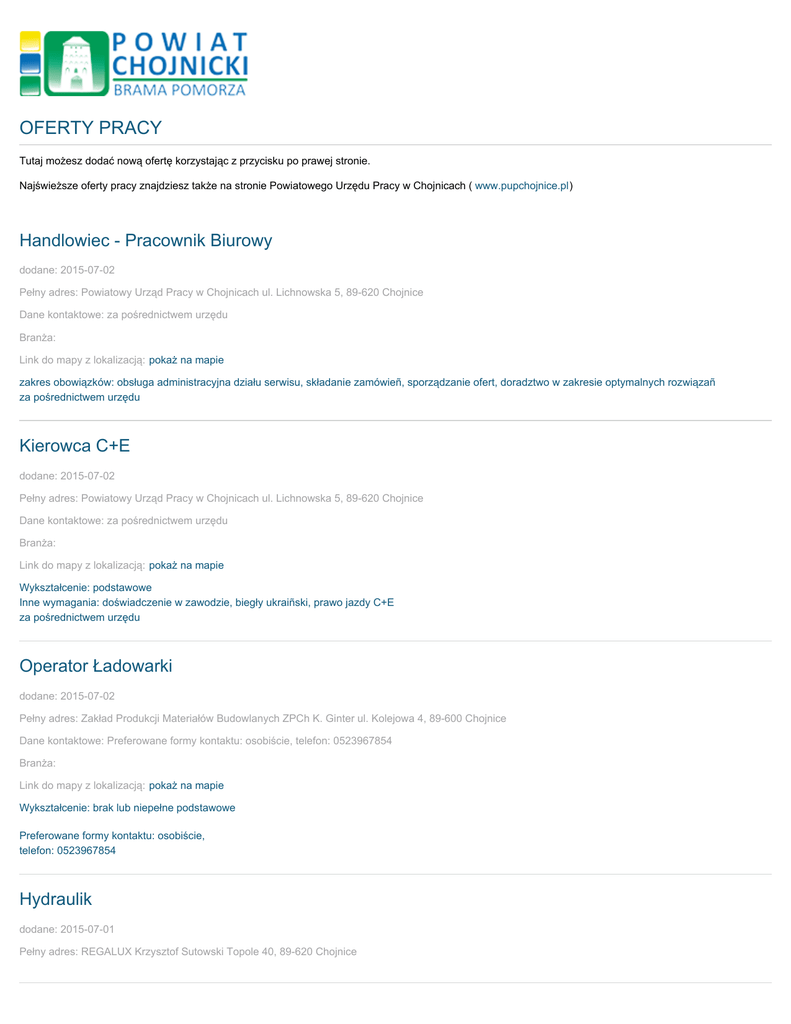OFERTY PRACY Tutaj możesz dodać nową ofertę korzystając z przycisku po prawej stronie. Najświeższe oferty pracy znajdziesz także na stronie Powiatowego Urzędu Pracy w Chojnicach ( www.pupchojnice.pl) Handlowiec - Pracownik Biurowy dodane: 2015-07-02 Pełny adres: Powiatowy Urząd Pracy w Chojnicach ul. Lichnowska 5, 89-620 Chojnice Dane kontaktowe: za pośrednictwem urzędu Branża: Link do mapy z lokalizacją: pokaż na mapie zakres obowiązków: obsługa administracyjna działu serwisu, składanie zamówieñ, sporządzanie ofert, doradztwo w zakresie optymalnych rozwiązañ za pośrednictwem urzędu Kierowca C+E dodane: 2015-07-02 Pełny adres: Powiatowy Urząd Pracy w Chojnicach ul. Lichnowska 5, 89-620 Chojnice Dane kontaktowe: za pośrednictwem urzędu Branża: Link do mapy z lokalizacją: pokaż na mapie Wykształcenie: podstawowe Inne wymagania: doświadczenie w zawodzie, biegły ukraiñski, prawo jazdy C+E za pośrednictwem urzędu Operator Ładowarki dodane: 2015-07-02 Pełny adres: Zakład Produkcji Materiałów Budowlanych ZPCh K. Ginter ul. Kolejowa 4, 89-600 Chojnice Dane kontaktowe: Preferowane formy kontaktu: osobiście, telefon: 0523967854 Branża: Link do mapy z lokalizacją: pokaż na mapie Wykształcenie: brak lub niepełne podstawowe Preferowane formy kontaktu: osobiście, telefon: 0523967854 Hydraulik dodane: 2015-07-01 Pełny adres: REGALUX Krzysztof Sutowski Topole 40, 89-620 Chojnice Dane kontaktowe: Preferowane formy kontaktu: telefon: 52 39 502 46 e-mail: [email protected] Branża: Link do mapy z lokalizacją: pokaż na mapie Staż pracy ogółem: lata: 0, miesiące: 5 Inne wymagania: Wykształcenie zawodowe lub średnie techniczne, doświadczenie w pracy przy hydraulice siłowej, prawo jazdy kat B, mile widziene uprawnienia na wózki widłowe. Preferowane formy kontaktu: telefon: 52 39 502 46 e-mail: [email protected] Mechanik dodane: 2015-07-01 Pełny adres: Zakład Produkcji Materiałów Budowlanych ZPCh K. Ginter ul. Kolejowa 4, 89-600 Chojnice Dane kontaktowe: Osobiście z cv w godz 8-8:30. Branża: Link do mapy z lokalizacją: pokaż na mapie Wykształcenie: podstawowe Staż pracy ogółem: lata: 0, miesiące: 5 Inne wymagania: Doświadczenie zawodowe. Osobiście z cv w godz 8-8:30. Inżynier lub technik budownictwa dodane: 2015-07-01 Pełny adres: Zakład Produkcji Materiałów Budowlanych ZPCh K. Ginter ul. Kolejowa 4, 89-600 Chojnice Dane kontaktowe: Preferowane formy kontaktu: osobiście Branża: Link do mapy z lokalizacją: pokaż na mapie Wykształcenie: średnie ogólnokształcące Wykształcenie: wyższe (w tym licencjat) Inne wymagania: doświadczenie zawodowe Preferowane formy kontaktu: osobiście Sprzątaczka dodane: 2015-07-01 Pełny adres: Powiatowy Urząd Pracy w Chojnicach ul. Lichnowska 5, 89-620 Chojnice Dane kontaktowe: za pośrednictwem urzędu Branża: Link do mapy z lokalizacją: pokaż na mapie Wykształcenie: średnie ogólnokształcące za pośrednictwem urzędu Blacharz - Dekarz dodane: 2015-06-30 Pełny adres: MIL-DACH RYSZARD MILCAREK ul. 31 Stycznia 36/2, 89-600 Chojnice Dane kontaktowe: Preferowane formy kontaktu: osobiście, telefon: 792 229 095 Branża: Link do mapy z lokalizacją: pokaż na mapie Wykształcenie: podstawowe Inne wymagania: doświadczenie zawodowe Preferowane formy kontaktu: osobiście, telefon: 792 229 095 Sprzedawca dodane: 2015-06-30 Pełny adres: Sklep Spożywczo Przemysłowy "U ANI" Góra Anna ul. Marszałka Józefa Piłsudskiego 33, 89-600 Chojnice Dane kontaktowe: Preferowane formy kontaktu: osobiście Branża: Link do mapy z lokalizacją: pokaż na mapie Wykształcenie: zasadnicze zawodowe, handlowe Staż pracy ogółem: lata: 0, miesiące: 5 Inne wymagania: Wykształcenie zawodowe, doświadczenie zawodowe. Preferowane formy kontaktu: osobiście Magazynier dodane: 2015-06-30 Pełny adres: PPH "BAGIETKA" Sp. z o.o. ul. Grunowo 80, 89-604 Chojnice Dane kontaktowe: Preferowane formy kontaktu: osobiście, telefon 52 3977274 Branża: Link do mapy z lokalizacją: pokaż na mapie Wykształcenie: zasadnicze zawodowe Umiejętności i uprawnienia: obsługa wózków widłowych Doświadczenie zawodowe mile widziane min. 1 rok, umiejętność sprawnego liczenia. Preferowane formy kontaktu: osobiście, telefon 52 3977274 Kasjer handlowy dodane: 2015-06-30 Pełny adres: Powiatowy Urząd Pracy w Chojnicach ul. Lichnowska 5, 89-620 Chojnice Dane kontaktowe: za pośrednictwem urzędu Branża: Link do mapy z lokalizacją: pokaż na mapie Wykształcenie: zawodowe, handlowe Wykształcenie min. zawodowe handlowe lub inne za pośrednictwem urzędu Ślusarz dodane: 2015-06-30 Pełny adres: "CMT" CHOJNICE Sp. z o.o. ul. Zakładowa 6, 89-600 Chojnice Dane kontaktowe: Preferowane formy kontaktu: osobiście Branża: Link do mapy z lokalizacją: pokaż na mapie Wykształcenie: zasadnicze zawodowe Umiejętności i uprawnienia: czytanie rysunków technicznych obsługa suwnic w kategorii I S - hakowych ogólnego przeznaczenia; sterowanych z kabiny oraz suwnic hakowych ogólnego przeznaczenia sterowanych z poziomu roboczego, w tym bezprzewodowo, oraz cięgników Preferowane formy kontaktu: osobiście Specjalista ds. eksportu dodane: 2015-06-30 Pełny adres: SEKO S.A. ul. Zakładowa 3, 89-620 Chojnice Dane kontaktowe: Preferowane formy kontaktu: telefon 668098980 e-mail [email protected] Branża: Link do mapy z lokalizacją: pokaż na mapie Wykształcenie: wyższe (w tym licencjat) Znajomość języków: niemiecki, w mowie - biegły, w piśmie - biegły angielski, w mowie - słaby, w piśmie - słaby Preferowane formy kontaktu: telefon 668098980 e-mail [email protected] Referent ds. zakupu dodane: 2015-06-30 Pełny adres: SEKO S.A. ul. Zakładowa 3, 89-620 Chojnice Dane kontaktowe: Preferowane formy kontaktu: telefon: 668098980 e-mail: [email protected] Branża: Link do mapy z lokalizacją: pokaż na mapie Wykształcenie: średnie ogólnokształcące Preferowane formy kontaktu: telefon: 668098980 e-mail: [email protected] Kier