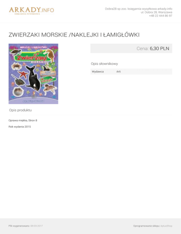 Dobra28 sp zoo. księgarnia wysyłkowa arkady.info ul. Dobra 28, Warszawa +48 22 444 86 97 ZWIERZAKI MORSKIE /NAKLEJKI I ŁAMIGŁÓWKI Cena: 6,30 PLN Opis słownikowy Wydawca Arti Opis produktu Oprawa miękka, Stron 8 Rok wydania 2015 Plik wygenerowano: 08-03-2017 Powered by TCPDF (www.tcpdf.org) Oprogramowanie sklepu: AptusShop