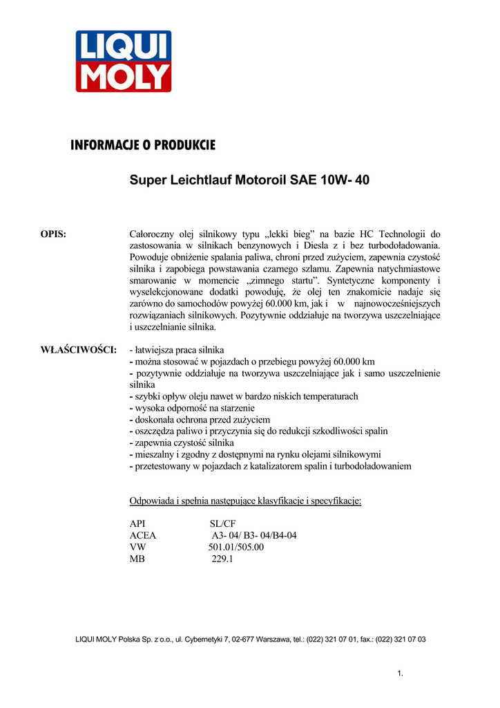 INFORMACJE O PRODUKCIE Super Leichtlauf Motoroil SAE 10W- 40 OPIS: Całoroczny olej silnikowy typu „lekki bieg” na bazie HC Technologii do zastosowania w silnikach benzynowych i Diesla z i bez turbodoładowania. Powoduje obniżenie spalania paliwa, chroni przed zużyciem, zapewnia czystość silnika i zapobiega powstawania czarnego szlamu. Zapewnia natychmiastowe smarowanie w momencie „zimnego startu”. Syntetyczne komponenty i wyselekcjonowane dodatki powoduję, że olej ten znakomicie nadaje się zarówno do samochodów powyżej 60.000 km, jak i w najnowocześniejszych rozwiązaniach silnikowych. Pozytywnie oddziałuje na tworzywa uszczelniające i uszczelnianie silnika. WŁAŚCIWOŚCI: - łatwiejsza praca silnika - można stosować w pojazdach o przebiegu powyżej 60.000 km - pozytywnie oddziałuje na tworzywa uszczelniające jak i samo uszczelnienie silnika - szybki opływ oleju nawet w bardzo niskich temperaturach - wysoka odporność na starzenie - doskonała ochrona przed zużyciem - oszczędza paliwo i przyczynia się do redukcji szkodliwości spalin - zapewnia czystość silnika - mieszalny i zgodny z dostępnymi na rynku olejami silnikowymi - przetestowany w pojazdach z katalizatorem spalin i turbodoładowaniem Odpowiada i spełnia następujące klasyfikacje i specyfikacje: API ACEA VW MB SL/CF A3- 04/ B3- 04/B4-04 501.01/505.00 229.1 LIQUI MOLY Polska Sp. z o.o., ul. Cybernetyki 7, 02-677 Warszawa, tel.: (022) 321 07 01, fax.: (022) 321 07 03 1. DANE TECHNICZNE Klasa lepkości ASTM- liczba barwy Gęstość w 150C Lepkość w 400C Lepkość w 1000C Wskaźnik lepkości Temperatura zapłonu Temperatura płynięcia : 10W- 40 : 2,5 : 0,880 g/cm3 : 91,10 mm2/s : 13,70 mm2/s : 152 : 2280C : -330C DIN 51578 DIN 51562 DIN 51562 DIN 51562 DIN ISO 2909 DIN ISO 2592 DIN ISO 3016 ZASTOSOWANIE: Doskonale nadaje się zarówno do samochodów o przebiegu powyżej 60.000 km jak również do nowoczesnych silników benzynowych i Diesla również z turbodoładowaniem SPOSÓB UŻYCIA: Wymiana oleju zgodnie z zaleceniami producenta samochodu POJEMNOŚCI OPAKOWANIA Super Leichtlauf SAE 10W- 40 1l 4l 5l 20l 60l 205l Art. Nr. 2624 Art. Nr. 2625 Art. Nr. 1301 Art. Nr. 1304 Art. Nr. 1302 Art. Nr. 1303 Nasze informacje opierają się na starannych badaniach i są jak najbardziej prawidłowe, jednak mogą one jedynie doradzać bez ponoszenia odpowiedzialności. LIQUI MOLY Polska Sp. z o.o., ul. Cybernetyki 7, 02-677 Warszawa, tel.: (022) 321 07 01, fax.: (022) 321 07 03 2.