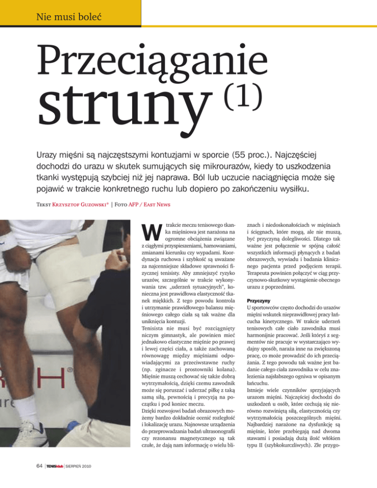 Nie musi boleç Przeciàganie struny (1) Urazy mi´Êni sà najcz´stszymi kontuzjami w sporcie (55 proc.). Najcz´Êciej dochodzi do urazu w skutek sumujàcych si´ mikrourazów, kiedy to uszkodzenia tkanki wyst´pujà szybciej ni˝ jej naprawa. Ból lub uczucie naciàgni´cia mo˝e si´ pojawiç w trakcie konkretnego ruchu lub dopiero po zakoƒczeniu wysiłku. Tekst Krzysztof Guzowski* | Foto AFP / East News trakcie meczu tenisowego tkanka mi´Êniowa jest nara˝ona na ogromne obcià˝enia zwiàzane z ciàgłymi przyspieszeniami, hamowaniami, zmianami kierunku czy wypadami. Koordynacja ruchowa i szybkoÊç sà uwa˝ane za najcenniejsze składowe sprawnoÊci fizycznej tenisisty. Aby zmniejszyç ryzyko urazów, szczególnie w trakcie wykonywania tzw. „uderzeƒ sytuacyjnych”, konieczna jest prawidłowa elastycznoÊç tkanek mi´kkich. Z tego powodu kontrola i utrzymanie prawidłowego balansu mi´Êniowego całego ciała sà tak wa˝ne dla unikni´cia kontuzji. Tenisista nie musi byç rozciàgni´ty niczym gimnastyk, ale powinien mieç jednakowo elastyczne mi´Ênie po prawej i lewej cz´Êci ciała, a tak˝e zachowanà równowag´ mi´dzy mi´Êniami odpowiadajàcymi za przeciwstawne ruchy (np. zginacze i prostowniki kolana). Mi´Ênie muszà cechowaç si´ tak˝e dobrà wytrzymałoÊcià, dzi´ki czemu zawodnik mo˝e si´ poruszaç i uderzaç piłk´ z takà samà siłà, pewnoÊcià i precyzjà na poczàtku i pod koniec meczu. Dzi´ki rozwojowi badaƒ obrazowych mo˝emy bardzo dokładnie oceniç rozległoÊç i lokalizacj´ urazu. Najnowsze urzàdzenia do przeprowadzania badaƒ ultrasonografii czy rezonansu magnetycznego sà tak czułe, ˝e dajà nam informacj´ o wielu bli- W 64 |TENISklub|SIERPIE¡ 2010 znach i niedoskonałoÊciach w mi´Êniach i Êci´gnach, które mogà, ale nie muszà, byç przyczynà dolegliwoÊci. Dlatego tak wa˝ne jest połàczenie w spójnà całoÊç wszystkich informacji płynàcych z badaƒ obrazowych, wywiadu i badania klinicznego pacjenta przed podj´ciem terapii. Terapeuta powinien połàczyç w ciàg przyczynowo-skutkowy wystàpienie obecnego urazu z poprzednimi. Przyczyny U sportowców cz´sto dochodzi do urazów mi´Êni wskutek nieprawidłowej pracy łaƒcucha kinetycznego. W trakcie uderzeƒ tenisowych całe ciało zawodnika musi harmonijnie pracowaç. JeÊli któryÊ z segmentów nie pracuje w wystarczajàco wydajny sposób, nara˝a inne na zwi´kszonà prac´, co mo˝e prowadziç do ich przecià˝ania. Z tego powodu tak wa˝ne jest badanie całego ciała zawodnika w celu znalezienia najsłabszego ogniwa w opisanym łaƒcuchu. Istnieje wiele czynników sprzyjajàcych urazom mi´Êni. Najcz´Êciej dochodzi do uszkodzeƒ u osób, które cechujà si´ nierówno rozwini´tà siłà, elastycznoÊcià czy wytrzymałoÊcià poszczególnych mi´Êni. Najbardziej nara˝one na dysfunkcj´ sà mi´Ênie, które przebiegajà nad dwoma stawami i posiadajà du˝à iloÊç włókien typu II (szybkokurczliwych). Złe przygo- towanie do wysiłku, osłabienie i sztywnoÊç mi´Êni po treningu ekscentrycznym (czyli takim, kiedy dochodzi do oddalania si´ przyczepów mi´Ênia w trakcie jego skurczu), zmiana techniki, okres skoku pokwitaniowego, przetrenowanie sà kolejnymi czynnikami, które zwi´kszajà prawdopodobieƒstwo wystàpienia urazu. Do uszkodzeƒ mi´Êni mo˝e dochodziç wskutek przecià˝eƒ metabolicznych (zapotrzebowanie na energi´ przewy˝sza jej produkcj´) lub mechanicznych (przyło˝ona zbyt du˝a siła). Podział urazów 1. Opóêniona bolesnoÊç mi´Êni – nazywana niepoprawnie „zakwasami”. Faktem jest, ˝e w mi´Êniach wytwarza si´ kwas mlekowy, lecz „zakwas”, czyli nadprodukcja kwasu mlekowego w obr´bie pracujàcych mi´Êni, zostaje usuni´ty w ciàgu kilku godzin po wysiłku, wi´c nie mo˝e odpowiadaç za dolegliwoÊci wyst´pujàce dob´ lub kilka dni póêniej. Przyczynà tych dolegliwoÊci sà mikrouszkodzenia. Po bardzo obcià˝ajàcym treningu mo˝e dojÊç do rozpadu cz´Êci włókienek mi´Êniowych, uszkodzeniu tkanki łàcznej i powstania stanu zapalnego, stàd ból i sztywnoÊç mi´Êni. Zalecane sà niesteroidowe leki przeciwzapalne, zwi´kszenie dawki witaminy C, stosowanie chłodzenia (poprawia mikrokrà˝enie i działa przeciwbólowo) i wczesny powrót do pełnej aktywnoÊci. 2. Nadwer´˝enia – najcz´Êciej uszkodzenia przejÊcia mi´Êniowo-Êci´gnistego pojawiajàce si´ w trakcie pracy ekscentrycznej. Post´powanie medyczne zale˝y od stopnia uszkodzenia: – stopieƒ I: nadwer´˝enie niewielkie (naciàgni´cie) – uszkodzenie małej liczby (mniej ni˝ 5 proc.) włókien mi´Êniowych, mały obrz´k i dyskomfort z minimalnym lub brakiem deficytu siły i funkcji; – stopieƒ II: nadwer´˝enie umiarkowane (naderwanie) – uszkodzenie wi´kszej liczby włókien mi´Êniowych, Êredni obrz´k i dyskomfort z umiarkowanym deficytem siły i funkcji; – stopieƒ III: nadwer´˝enie ci´˝kie (zerwanie) – bardzo du˝e uszkodzenie tkanki mi´Êniowej rozprzestrzeniajàce si´ na cały przekrój poprzeczny mi´Ênia z całkowità utratà siły i funkcji. 3. Stłuczenia – du˝a siła z zewnàtrz musi zadziałaç na tkank´ kompresujàco lub rozbijajàco. Bardzo wa˝ne jest działanie przeciwko rozprzestrzenianiu si´ krwiaka; przez kilka pierwszych dni nale˝y unikaç Ç 65 |TENISklub|SIERPIE¡ 2010 Nie musi boleç Ç stosowania ciepła, masa˝u i ultradêwi´ków. Od razu po urazie krioterapia, elewacja koƒczyny, kompresja banda˝em elastycznym i unieruchomienie mi´Ênia w pozycji rozciàgajàcej przez pierwsza dob´ po urazie. Nast´pnie wprowadzane jest delikatne rozciàganie, elektroterapia i kule do chodzenia w razie potrzeby. Czasami trzeba robiç punkcj´ lub lokalnà napraw´. Mogà wystàpiç groêne powikłania (np. kostniejàce zapalenie mi´Ênia). Po powrocie do sportu nale˝y stosowaç nakładk´ ochronnà na miejsce uszkodzenia. Profilaktyka Tak jak przy profilaktyce wszystkich inny