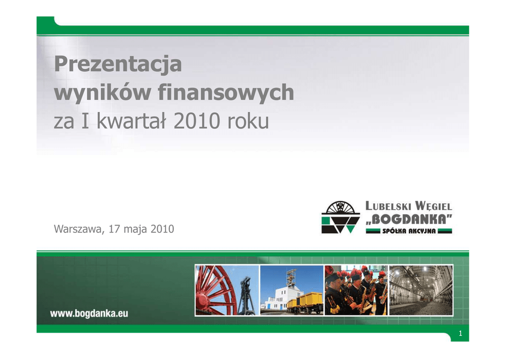 Prezentacja wyników finansowych za I kwartał 2010 roku Warszawa, 17 maja 2010 1 ZastrzeŜenia prawne Niniejsze opracowanie zostało sporządzone wyłącznie w celach informacyjnych. Nie stanowi reklamy ani oferty nabycia papierów wartościowych. Zostały w nim wykorzystane źródła informacji, które LW BOGDANKA S.A. uznaje za wiarygodne i dokładne, jednak nie ma gwarancji, Ŝe są one wyczerpujące i w pełni odzwierciedlają stan faktyczny. Opracowanie moŜe zawierać stwierdzenia dotyczące przyszłości, które stanowią ryzyko inwestycyjne lub źródło niepewności i mogą istotnie róŜnić się od faktycznych rezultatów. LW BOGDANKA S.A. nie ponosi odpowiedzialności za efekty decyzji, które zostały podjęte na podstawie niniejszego opracowania. Odpowiedzialność spoczywa wyłącznie na korzystającym z opracowania. Opracowanie podlega ochronie wynikającej z ustawy o prawie autorskim i prawach pokrewnych. Powielanie, publikowanie lub jego rozpowszechnianie wymaga pisemnej zgody LW BOGDANKA S.A. 2 Osoby prezentujące Mirosław Taras Prezes Zarządu 3 Krystyna Borkowska Z-ca Prezesa Zarządu ds. Ekonomiczno Finansowych Zbigniew Stopa Z-ca Prezesa Zarządu ds. Technicznych Agenda NAJWAśNIEJSZE INFORMACJE O LW BOGDANKA Rynek węgla kamiennego LW Bogdanka po 1Q 2010 Strategia rozwoju i cele inwestycyjne Załączniki 4 LW BOGDANKA Jedna z najnowocześniejszych i największych kopalń węgla kamiennego w Polsce, Producent węgla energetycznego wykorzystywanego do wytwarzania energii elektrycznej, Zasoby operatywne: 251,3 mln ton węgla (obecnie posiadana koncesja zapewnia Ŝywotność kopalni do 2034 roku), Korzystne połoŜenie geograficzne (Zagłębie Lubelskie) w stosunku do głównych odbiorców (renta lokalizacyjna) oraz korzystne warunki naturalne (niskie koszty rekultywacji, regularna budowa geologiczna złoŜa oraz brak zagroŜeń tąpaniami i niski stopień zagroŜenia wybuchem metanu); Stosowanie najnowocześniejszych technologii i światowej klasy parku maszynowego w procesie wydobycia węgla kamiennego - niska awaryjność, brak niezaplanowanych przestojów i efektywność wydobycia; Doświadczony Zarząd od wielu lat związany z branŜą górnictwa węgla kamiennego; Efektywność wydobycia węgla znacznie wyŜsza od średniej w branŜy w Polsce: - wydajność ogólna za 1Q 2010: 249,86 % średniej w branŜy; - wydajność dołowa za 1Q 2010: 284,66 % średniej w branŜy. 5 Struktura akcjonariatu Struktura akcjonariatu LW Bogdanka na dzień 17 maja 2010 r. 9,88% 13,01% 9,76% 5,10% 14,74% 47,51% AVIVA OFE BZ WBK Skarb Państwa Amplico PTE 6 ING OFE OFE PZU "Złota Jesień" Pozostali akcjonariusze Agenda NajwaŜniejsze informacje o LW Bogdanka RYNEK WĘGLA KAMIENNEGO LW Bogdanka po 1Q 2010 Strategia rozwoju i cele inwestycyjne Załączniki 7 Sytuacja na rynku węgla w Polsce w 1Q2010 8 Obecnie Spółka obserwuje poprawę warunków handlu węglem oraz zmniejszenie presji na obniŜkę cen węgla jaka miała miejsce w 2009 roku Pomimo obserwowanego wzrostu cen światowych węgla, wzrost cen węgla w Polsce ograniczany jest przez wysoką podaŜ węgla przez konkurencję Spółki, związaną z wysokim poziomem zapasów z lat ubiegłych. Skutkiem tego moŜe być zmniejszenie importu węgla do Polski Sytuacja śląskich spółek: Wydobycie węgla kamiennego w kopalniach śląskich w 1Q 2010 roku wyniosło 18,3 mln ton i było niŜsze od uzyskanego w identycznym okresie 2009 roku o 1,9%. Wydobycie węgla energetycznego zmniejszyło się o 1,9%, a węgla koksowego wzrosło o 46,6%. Stan zapasów węgla kamiennego w kopalniach na koniec marca 2010 r. wyniósł 5,6 mln ton (co stanowiło wzrost w stosunku do końca marca 2009 r. o 2,26 mln ton). SprzedaŜ węgla w 1Q 2010 roku wyniosła 17,039 mln ton, co w porównaniu do 16,618 mln ton w analogicznym okresie 2009 roku oznacza wzrost o 2,5%. Jednostkowy koszt sprzedaŜy spadł o 3% i wyniósł 278,52 zł/t. Import vs. Export 14 12,1 Import węgla Eksport węgla 12 10,2 10 10 8,7 8,1 8 6 5,9 4 2,4 2,8 2 0 2007 2008 2009 1Q 2010 Źródło: Ministerstwo Gospodarki, GUS (bez kopalni ZG „SILTECH” oraz LW „BOGDANKA” S.A.) Dane dotyczące importu w I kw. 2010 – szacunki Spółki, na podstawie importu w okresie styczeń-luty 2010 Łączny koszt importu jednej tony węgla z portów ARA Cena ARA + Załadunek (port) + Fracht + Rozładunek (port) + Transport (kolej) Koszt importu z rynku rosyjskiego zaleŜny od polityki i infrastruktury transportowej Federacji Rosyjskiej 9 Agenda NajwaŜniejsze informacje o LW Bogdanka Rynek węgla kamiennego LW BOGDANKA PO 1Q 2010 Strategia rozwoju i cele inwestycyjne Załączniki 10 NajwaŜniejsze wydarzenia w LW Bogdanka w 1Q 2010 W marcu 2010 r. polskie fundusze emerytalne nabyły od Skarbu Państwa pakiet 46,7% akcji Lubelski Węgiel „Bogdanka” za ponad 1 mld zł. Tym samym LW Bogdanka stała się spółka prywatną. W I kwartale 2010 r. Grupa Kapitałowa LW Bogdanka zrealizowała inwestycje rzeczowe o łącznej wartości ponad 180 mln zł. Pod koniec marca 2010 roku zakończyła się pierwsza faza próbnego rozruchu nowego kompleksu strugowego, przeznaczonego do eksploatacji niskich pokładów węgla. Z końcem kwietnia uruchomiony kompleks strugowy osiągnął wydajność 8 tys. ton urobku na dobę, co dało wzrost uzysku węgla handlowego o ok. 7%. Testy wydajnościowe kompleksu planowane są na koniec maja. 11 NajwaŜniejsze wydarzenia w LW Bogdanka w 1Q 2010 Wyszczególnienie (tys. zł) Przychody ze sprzedaŜy 1Q 2009 1Q2010 Zmiana (%) 244 506 294 096 20,28% Zysk brutto 83 587 95 672 14,46% EBITDA 91 600 95 261 4,00% EBIT 59 129 62 164 5,13% Zysk netto 47 413 52 770 11,53% Wyszczególnienie Zysk na akcję (zł)* 1Q2009 1Q2010 2,06 zł 1,55 zł * podstawowy zysk na jedną akcję, wyliczony jako iloraz zysku przypadającego na akcjonariuszy Spółki oraz średniej waŜonej liczby akcji zwykłych w ciągu roku, dane skonsolidowane 12 Wskaźniki rentowności Rentowność EBITDA i EBIT