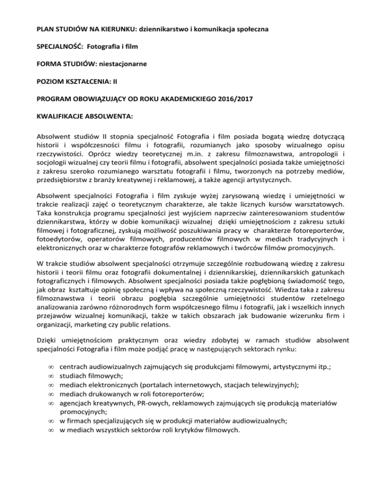 PLAN STUDIÓW NA KIERUNKU: dziennikarstwo i komunikacja społeczna SPECJALNOŚĆ: Fotografia i film FORMA STUDIÓW: niestacjonarne POZIOM KSZTAŁCENIA: II PROGRAM OBOWIĄZUJĄCY OD ROKU AKADEMICKIEGO 2016/2017 KWALIFIKACJE ABSOLWENTA: Absolwent studiów II stopnia specjalność Fotografia i film posiada bogatą wiedzę dotyczącą historii i współczesności filmu i fotografii, rozumianych jako sposoby wizualnego opisu rzeczywistości. Oprócz wiedzy teoretycznej m.in. z zakresu filmoznawstwa, antropologii i socjologii wizualnej czy teorii filmu i fotografii, absolwent specjalności posiada także umiejętności z zakresu szeroko rozumianego warsztatu fotografii i filmu, tworzonych na potrzeby mediów, przedsiębiorstw z branży kreatywnej i reklamowej, a także agencji artystycznych. Absolwent specjalności Fotografia i film zyskuje wyżej zarysowaną wiedzę i umiejętności w trakcie realizacji zajęć o teoretycznym charakterze, ale także licznych kursów warsztatowych. Taka konstrukcja programu specjalności jest wyjściem naprzeciw zainteresowaniom studentów dziennikarstwa, którzy w dobie komunikacji wizualnej dzięki umiejętnościom z zakresu sztuki filmowej i fotograficznej, zyskują możliwość poszukiwania pracy w charakterze fotoreporterów, fotoedytorów, operatorów filmowych, producentów filmowych w mediach tradycyjnych i elektronicznych oraz w charakterze fotografów reklamowych i twórców filmów promocyjnych. W trakcie studiów absolwent specjalności otrzymuje szczególnie rozbudowaną wiedzę z zakresu historii i teorii filmu oraz fotografii dokumentalnej i dziennikarskiej, dziennikarskich gatunkach fotograficznych i filmowych. Absolwent specjalności posiada także pogłębioną świadomość tego, jak obraz kształtuje opinię społeczną i wpływa na społeczną rzeczywistość. Wiedza taka z zakresu filmoznawstwa i teorii obrazu pogłębia szczególnie umiejętności studentów rzetelnego analizowania zarówno różnorodnych form współczesnego filmu i fotografii, jak i wszelkich innych przejawów wizualnej komunikacji, także w takich obszarach jak budowanie wizerunku firm i organizacji, marketing czy public relations. Dzięki umiejętnościom praktycznym oraz wiedzy zdobytej w ramach studiów absolwent specjalności Fotografia i film może podjąć pracę w następujących sektorach rynku: • • • • • centrach audiowizualnych zajmujących się produkcjami filmowymi, artystycznymi itp.; studiach filmowych; mediach elektronicznych (portalach internetowych, stacjach telewizyjnych); mediach drukowanych w roli fotoreporterów; agencjach kreatywnych, PR-owych, reklamowych zajmujących się produkcją materiałów promocyjnych; • w firmach specjalizujących się w produkcji materiałów audiowizualnych; • w mediach wszystkich sektorów roli krytyków filmowych. PRZEDMIOTY OBOWIĄZKOWE Nr Nazwa przedmiotu Liczba godzin ECTS 1. Kultura współczesna 18 5 2. Wstęp do medioznawstwa 18 4 3. Pragmatyka języka 18 4 4. Filozofia współczesna 18 4 5. Media lokalne 18 4 6. Komunikowanie międzynarodowe i międzykulturowe 18 5 7. Metody badań medioznawczych 18 4 8. Prawne aspekty funkcjonowania mediów 9 3 9. Wstęp do filmoznawstwa 18 4 10. Warsztat fotografii 18 4 11. Socjologia wizualna 18 4 12. Techniki pracy operatora 18 3 13. Dyskursy mediów 18 3 14. Sztuka obrazu filmowego 18 3 15. 18 3 16. Grafika komputerowa w pracy z fotografią Fotografia użytkowa 18 4 17. Nowe media 18 6 18. Seminarium magisterskie 54 28 19. Fotografia reportażowa i dokumentalna Język obcy 18 6 40 4 21. Warsztat dziennikarstwa sportowego 18 1 22. Przedsiębiorczość 15 1 20. Uwagi PRZEDMIOTY DO WYBORU: Nr Nazwa przedmiotu Liczba godzin ECTS 1. Warsztat krytyka filmowego 18 2 2. Przemysł filmowy w Polsce i na świecie 18 2 3. Animacja multimedialna 18 2 4. Język reklamy telewizyjnej 18 2 5. Polityka kulturalna i pozyskiwanie funduszy 18 2 Uwagi 6. Warsztat reklamy 18 2 7. Warsztat kreatywności 18 2 8. Mistrzowie kina 18 2 9. Powstawanie dzieła filmowego 18 2 10. Produkcja filmowa 18 2 11. Formy i gatunki scenariuszowe 18 2 12. Postprodukcja 18 2 13. Poetyka kina dokumentalnego 18 2 14. o Technika i technologia w fotografii 18 2 15. Zarządzanie barwą 18 2 16. Przestrzeń studyjna i praca w studio 18 2 17. Organizacja pracy na planie filmowym 18 2 18. Cyfrowa obróbka obrazów – warsztat 18 2 WARUNKI UKOŃCZENIA STUDIÓW I UZYSKANIA TYTUŁU DANEGO KIERUNKU/SPECJALNOŚCI/SPECJALIZACJI Pozytywna ocena z pracy dyplomowej oraz pozytywna ocena z egzaminu magisterskiego. Praca może mieć charakter projektu poprzedzonego wprowadzeniem teoretycznym. INNE WYMAGANIA Egzamin z języka obcego na poziomie biegłości B2+ Europejskiego Opisu Kształcenia Językowego Rady Europy PLAN STUDIÓW NA KIERUNKU: dziennikarstwo i komunikacja społeczna SPECJALNOŚĆ: Fotografia i film POZIOM: II ROK I I semestr Lp. Nazwa przedmiotu 1. 2. 3. 4. 5. 6. 7. O/F* Kultura współczesna Prawne aspekty funkcjonowania mediów Pragmatyka języka Filozofia współczesna Media lokalne Komunikowanie międzynarodowe i międzykulturowe Metody badań medioznawczych O O Forma zajęć** Wykład Wykład 18 9 5 4 E E O O O O ćwiczenia Ćwiczenia ćwiczenia ćwiczenia 18 18 18 18 4 4 4 5 Z/o Z/o Z/o Z/o O ćwiczenia 18 4 Z/o Razem 2 3 4 5 6 7 8 9 Razem ECTS 117 II semestr Lp. Nazwa przedmiotu 1 Liczba godzin Wstęp do medioznawstwa Wstęp do filmoznawstwa Warsztat fotografii Socjologia wizualna Techniki pracy operatora Przedmiot opcyjny I Seminarium magisterskie Warsztat dziennikarstwa sportowego Język obcy O/F* Forma zajęć** Forma zaliczenia 30 --------- O ćwiczenia Liczba godzin 18 ECTS 4 Forma zaliczenia Z/o O Ćwiczenia 18 4 Z/o O O O Ćwiczenia Ćwiczenia Warsztat 18 18 18 4 4 3 Z/o Z/o Z/o F O Ćwiczenia Seminarium 18 18 2 8 Z/o Z/o O Ćwiczenia 18 1 Z/o O Ćwiczenia 20 164 0 30 Z --------- II ROK III semestr Lp. Nazwa przedmiotu 1 2 3 4 5 6 Dyskursy mediów Seminarium magisterskie Sztuka obrazu film