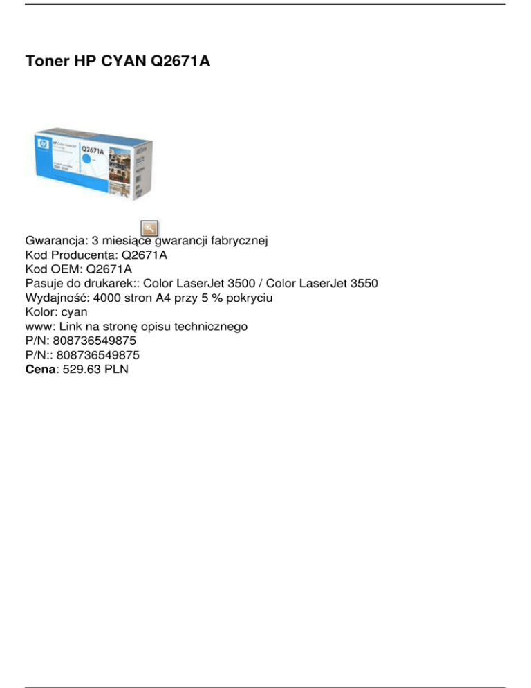 Toner HP CYAN Q2671A Gwarancja: 3 miesiące gwarancji fabrycznej Kod Producenta: Q2671A Kod OEM: Q2671A Pasuje do drukarek:: Color LaserJet 3500 / Color LaserJet 3550 Wydajność: 4000 stron A4 przy 5 % pokryciu Kolor: cyan www: Link na stronę opisu technicznego P/N: 808736549875 P/N:: 808736549875 Cena: 529.63 PLN Powered by TCPDF (www.tcpdf.org)