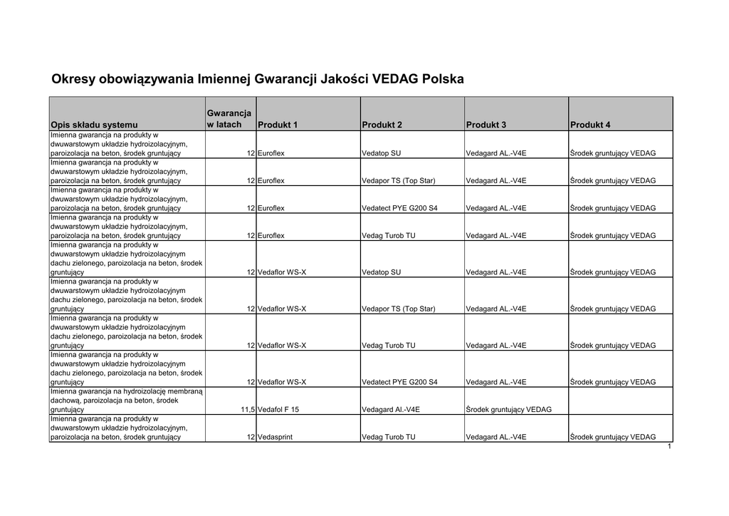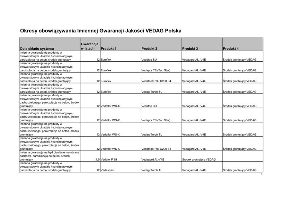 Okresy obowiązywania Imiennej Gwarancji Jakości VEDAG Polska Opis składu systemu Imienna gwarancja na produkty w dwuwarstowym układzie hydroizolacyjnym, paroizolacja na beton, środek gruntujący Imienna gwarancja na produkty w dwuwarstowym układzie hydroizolacyjnym, paroizolacja na beton, środek gruntujący Imienna gwarancja na produkty w dwuwarstowym układzie hydroizolacyjnym, paroizolacja na beton, środek gruntujący Imienna gwarancja na produkty w dwuwarstowym układzie hydroizolacyjnym, paroizolacja na beton, środek gruntujący Imienna gwarancja na produkty w dwuwarstowym układzie hydroizolacyjnym dachu zielonego, paroizolacja na beton, środek gruntujący Imienna gwarancja na produkty w dwuwarstowym układzie hydroizolacyjnym dachu zielonego, paroizolacja na beton, środek gruntujący Imienna gwarancja na produkty w dwuwarstowym układzie hydroizolacyjnym dachu zielonego, paroizolacja na beton, środek gruntujący Imienna gwarancja na produkty w dwuwarstowym układzie hydroizolacyjnym dachu zielonego, paroizolacja na beton, środek gruntujący Imienna gwarancja na hydroizolację membraną dachową, paroizolacja na beton, środek gruntujący Imienna gwarancja na produkty w dwuwarstowym układzie hydroizolacyjnym, paroizolacja na beton, środek gruntujący Gwarancja w latach Produkt 1 Produkt 2 Produkt 3 Produkt 4 12 Euroflex Vedatop SU Vedagard AL.-V4E Środek gruntujący VEDAG 12 Euroflex Vedapor TS (Top Star) Vedagard AL.-V4E Środek gruntujący VEDAG 12 Euroflex Vedatect PYE G200 S4 Vedagard AL.-V4E Środek gruntujący VEDAG 12 Euroflex Vedag Turob TU Vedagard AL.-V4E Środek gruntujący VEDAG 12 Vedaflor WS-X Vedatop SU Vedagard AL.-V4E Środek gruntujący VEDAG 12 Vedaflor WS-X Vedapor TS (Top Star) Vedagard AL.-V4E Środek gruntujący VEDAG 12 Vedaflor WS-X Vedag Turob TU Vedagard AL.-V4E Środek gruntujący VEDAG 12 Vedaflor WS-X Vedatect PYE G200 S4 Vedagard AL.-V4E Środek gruntujący VEDAG Vedagard Al.-V4E Środek gruntujący VEDAG Vedag Turob TU Vedagard AL.-V4E 11,5 Vedafol F 15 12 Vedasprint Środek gruntujący VEDAG 1 Imienna gwarancja na produkty w dwuwarstowym układzie hydroizolacyjnym, paroizolacja na beton, środek gruntujący Imienna gwarancja na produkty w dwuwarstowym układzie hydroizolacyjnym, paroizolacja na beton, środek gruntujący Imienna gwarancja na produkty w dwuwarstowym układzie hydroizolacyjnym, paroizolacja na beton, środek gruntujący Imienna gwarancja na produkty w dwuwarstowym układzie hydroizolacyjnym, warstwa wierzchnia Broof(t3), paroizolacja na beton, środek gruntujący Imienna gwarancja na produkty w dwuwarstowym układzie hydroizolacyjnym, warstwa wierzchnia Broof(t3), paroizolacja na beton, środek gruntujący Imienna gwarancja na hydroizolację membraną dachową, paroizolacja na beton, środek gruntujący Imienna gwarancja na hydroizolację membraną dachową, paroizolacja na beton, środek gruntujący Imienna gwarancja na produkty w dwuwarstowym układzie hydroizolacyjnym, paroizolacja na beton, środek gruntujący Imienna gwarancja na produkty w dwuwarstowym układzie hydroizolacyjnym, paroizolacja na beton, środek gruntujący Imienna gwarancja na produkty w dwuwarstowym układzie hydroizolacyjnym, paroizolacja na beton, środek gruntujący Imienna gwarancja na produkty w dwuwarstowym układzie hydroizolacyjnym, paroizolacja na beton, środek gruntujący Imienna gwarancja na produkty w 12 Vedasprint Vedatop SU Vedagard AL.-V4E Środek gruntujący VEDAG 12 Vedasprint Vedapor TS (Top Star) Vedagard AL.-V4E Środek gruntujący VEDAG 12 Vedasprint Vedatect PYE G200 S4 Vedagard AL.-V4E Środek gruntujący VEDAG 12 Vedatop S5 (t3) Vedatect PYE G200 S4 Vedagard AL.-V4E Środek gruntujący VEDAG 12 Vedatop S5 (t3) Vedatop TM Vedagard AL.-V4E Środek gruntujący VEDAG 11,5 Vedaplan MF Color Vedagard Al.-V4E Środek gruntujący VEDAG 11,5 Vedaplan MF czarny Vedagard Al.-V4E Środek gruntujący VEDAG 12 Vedaflex SP Vedatect PYE G200 S4 Vedagard AL.-V4E Środek gruntujący VEDAG 12 Vedaflex SP Vedatop SU Vedagard AL.-V4E Środek gruntujący VEDAG 12 Vedaflex SP Vedag Turob TU Vedagard AL.-V4E Środek gruntujący VEDAG 12 Vedaflex SP Vedapor TS (Top Star) Vedagard AL.-V4E Środek gruntujący VEDAG 12 Euroflex Vedatop SU Vedagard ES-Plus Środek gruntujący VEDAG dwuwarstowym układzie hydroizolacyjnym, paroizolacja na beton z termicznie aktywowaną warstwą wierzchnią, środek gruntujący 2 Imienna gwarancja na produkty w dwuwarstowym układzie hydroizolacyjnym, paroizolacja na beton z termicznie aktywowaną warstwą wierzchnią, środek gruntujący Imienna gwarancja na produkty w 12 Euroflex Vedag Turob TU Vedagard ES-Plus Środek gruntujący VEDAG 12 Euroflex Vedapor TS (Top Star) Vedagard ES-Plus Środek gruntujący VEDAG 12 Vedaflor WS-X Vedatop SU Vedagard ES-Plus Środek gruntujący VEDAG 12 Vedaflor WS-X Vedapor TS (Top Star) Vedagard ES-Plus Środek gruntujący VEDAG 12 Vedaflor WS-X Vedag Turob TU Vedagard ES-Plus Środek gruntujący VEDAG 12 Vedasprint Vedag Turob TU Vedagard ES-Plus Środek gruntujący VEDAG 12 Vedasprint Vedatop SU Vedagard ES-Plus Środek gruntujący VEDAG 12 Vedasprint Vedapor TS (Top Star) Vedagard ES-Plus Środek gruntujący VEDAG dwuwarstowym układzie hydroizolacyjnym, paroizolacja na beton z termicznie aktywowaną warstwą wierzchnią, środek gruntujący Imienna gwarancja na produkty w dwuwarstowym układzie hydroizolacyjnym dachu zielonego, paroizolacja na beton z termicznie aktywowaną warstwą wierzchnią, środek gruntujący Imienna gwarancja na produkty w dwuwarstowym układzie hydroizolacyjnym dachu zielonego, paroizolacja na beton z termicznie aktywowaną warstwą wierzchnią, środek gruntujący Imienna gwarancja na produkty w dwuwarstowym układzie hydroizolacyjnym dachu zielonego, paroizolacja na beton z termicznie aktywowaną warstwą wierzchnią, środek gruntujący Imienna gwarancja na produkty w dwuwarstowym układzie hydroizolacyjnym, paroizolacja na beton z termicznie aktywowan