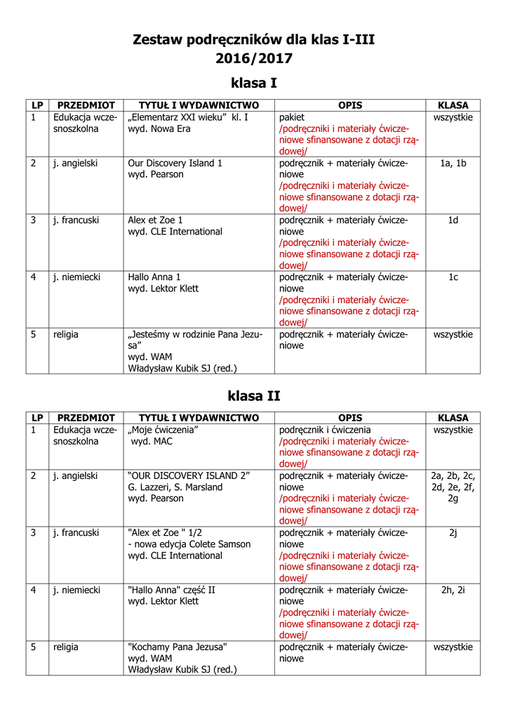 Zestaw podręczników dla klas I-III 2016/2017 klasa I LP 1 PRZEDMIOT Edukacja wczesnoszkolna TYTUŁ I WYDAWNICTWO „Elementarz XXI wieku” kl. I wyd. Nowa Era 2 j. angielski Our Discovery Island 1 wyd. Pearson 3 j. francuski Alex et Zoe 1 wyd. CLE International 4 j. niemiecki Hallo Anna 1 wyd. Lektor Klett 5 religia „Jesteśmy w rodzinie Pana Jezusa” wyd. WAM Władysław Kubik SJ (red.) OPIS pakiet /podręczniki i materiały ćwiczeniowe sfinansowane z dotacji rządowej/ podręcznik + materiały ćwiczeniowe /podręczniki i materiały ćwiczeniowe sfinansowane z dotacji rządowej/ podręcznik + materiały ćwiczeniowe /podręczniki i materiały ćwiczeniowe sfinansowane z dotacji rządowej/ podręcznik + materiały ćwiczeniowe /podręczniki i materiały ćwiczeniowe sfinansowane z dotacji rządowej/ podręcznik + materiały ćwiczeniowe KLASA wszystkie 1a, 1b 1d 1c wszystkie klasa II LP 1 PRZEDMIOT Edukacja wczesnoszkolna TYTUŁ I WYDAWNICTWO „Moje ćwiczenia” wyd. MAC 2 j. angielski “OUR DISCOVERY ISLAND 2” G. Lazzeri, S. Marsland wyd. Pearson 3 j. francuski "Alex et Zoe " 1/2 - nowa edycja Colete Samson wyd. CLE International 4 j. niemiecki "Hallo Anna" część II wyd. Lektor Klett 5 religia "Kochamy Pana Jezusa" wyd. WAM Władysław Kubik SJ (red.) OPIS podręcznik i ćwiczenia /podręczniki i materiały ćwiczeniowe sfinansowane z dotacji rządowej/ podręcznik + materiały ćwiczeniowe /podręczniki i materiały ćwiczeniowe sfinansowane z dotacji rządowej/ podręcznik + materiały ćwiczeniowe /podręczniki i materiały ćwiczeniowe sfinansowane z dotacji rządowej/ podręcznik + materiały ćwiczeniowe /podręczniki i materiały ćwiczeniowe sfinansowane z dotacji rządowej/ podręcznik + materiały ćwiczeniowe KLASA wszystkie 2a, 2b, 2c, 2d, 2e, 2f, 2g 2j 2h, 2i wszystkie klasa III LP PRZEDMIOT TYTUŁ I WYDAWNICTWO OPIS KLASA 1 Edukacja wczesnoszkolna "Elementarz XXI wieku" dla klasy III – wersja pomostowa wyd. Nowa Era wszystkie 2 j. angielski “OUR DISCOVERY ISLAND 3” G. Lazzeri, S. Marsland wyd. Pearson 3 j. francuski „Alex et Zoe 2” – nowa edycja Colete Samson wyd. CLE International 4 j. niemiecki "Hallo Anna" część III wyd. Lektor Klett 5 religia „Przyjmujemy Pana Jezusa” wyd. WAM Władysław Kubik SJ (red.) podręcznik i ćwiczenia /podręczniki i materiały ćwiczeniowe sfinansowane z dotacji rządowej/ podręcznik + materiały ćwiczeniowe /podręczniki i materiały ćwiczeniowe sfinansowane z dotacji rządowej/ podręcznik + materiały ćwiczeniowe /podręczniki i materiały ćwiczeniowe sfinansowane z dotacji rządowej/ podręcznik + materiały ćwiczeniowe /podręczniki i materiały ćwiczeniowe sfinansowane z dotacji rządowej/ podręcznik + materiały ćwiczeniowe 3a, 3b, 3c, 3d 3e, 3f 3g, 3h wszystkie