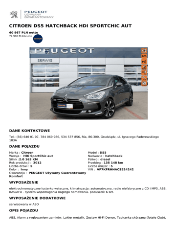 CITROEN DS5 HATCHBACK HDI SPORTCHIC AUT 60 967 PLN netto 74 990 PLN brutto DANE KONTAKTOWE Tel.: (56) 640 01 07, 784 069 986, 534 537 856, Ria, 86-300, Grudziądz, ul. Ignacego Paderewskiego 183A DANE POJAZDU Marka : Citroen Wersja : HDi SportChic aut Silnik :2.0 163 KM Rok produkcji : 2012 Liczba drzwi : 5 Kolor : inny Gwarancja : PEUGEOT Używany Gwarantowany Komfort Model : DS5 Nadwozie : hatchback Paliwo : diesel Przebieg : 135 148 km Liczba miejsc : 5 VIN : VF7KFRHHACS524242 WYPOSAŻENIE elektrochromatyczne lusterko wsteczne, klimatyzacja: automatyczna, radio niefabryczne z CD i MP3, ABS, BAS/AFU - system wspomagania nagłego hamowania, poduszek: 6 szt. WYPOSAŻENIE DODATKOWE serwisowany w ASO OPIS POJAZDU ABS, Alarm z ryglowaniem zamków, Lakier metalik, Zestaw Hi-Fi Denon, Tapicerka skórzana (fotele Club), Światła do jazdy dziennej diodowe (LED), Zestaw Bluetooth, Tempomat z ogranicznikiem prędkości, BAS system wspomagania hamowania, Światła przeciwmgielne z funkcją statycznego doświetlania zakrętów, Tapicerka skórzana Claudia (fotele Sport Lounge), Wspomaganie ruszania pod górę, System wyświetlania informacji w polu widzenia drogi (VTH), Reflektory bi-ksenonowe, kierunkowe ze spryskiwaczami, System bezkluczykowego otwierania i uruchamiania pojazdu (ADML), Szyby tylne dodatkowo przyciemniane, Radio CD z MP3, Podłokietnik tylny z otworem na narty, Podłokietnik przedni, Nawigacja kolorowa eMy Way, Lusterka boczne składane elektrycznie, Lusterka boczne sterowane elektrycznie i ogrzewane, Komputer pokładowy, Lakier Uni, Lusterko wsteczne elektrochromatyczne (przyciemniające się automatycznie), Klimatyzacja automatyczna - 2 strefowa, Kierownica i dźwignia zmiany biegów pokryte skórą, Klamki zewnętrzne chromowane, Kamera cofania (AVR), Inteligentny System Kontroli Trakcji, Fotele przednie ogrzewane, Felgi aluminiowe 18 z ogumieniem, Fotele przednie regulowane elektrycznie, Elektryczne podnoszenie szyb, przód i tył, ESP, Elektryczny hamulec postojowy, Airbag 6 sztuk: czołowe i boczne poduszki powietrzne dla kierowcy i pasażera, kurtyny powietrzne, EBD - elektroniczny rozdział sił hamowania, Automatyczne światła i wycieraczki, Dach Cockpit - panoramiczny, trzyczęściowy z niezależnymi roletami sterowanymi elektrycznie, Czujniki parkowania - przód, Citroen eTouch (połączenie alarmowe, połączenie z assistance drogowym) Pierwszy właściciel, Bezwypadkowy, Kupiony w ASO w Polsce, Pojazd regularnie serwisowany, Możliwość rezerwacji Samochód sprzedawany w programie PEUGEOT Używany Gwarantowany KOMFORT: Gwarancja Umowna 6 Miesięcy Certyfikat Jakości Pojazdu Dekra Opieka Peugeot Assitance Specjalna Oferta Ubezpieczeniowa Specjalna Oferta Finansowania Zakupu Dowiedz się więcej na : http://www.UzywanyGwarantowany.pl QR CODE DLA OGŁOSZENIA W SERWISIE UZYWANYGWARANTOWANY.PL Powered by TCPDF (www.tcpdf.org)