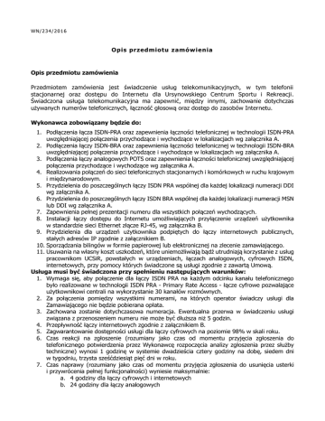 WN/234/2016 Opis przedmiotu zamówienia Opis przedmiotu zamówienia Przedmiotem zamówienia jest świadczenie usług telekomunikacyjnych, w tym telefonii stacjonarnej oraz dostępu do Internetu dla Ursynowskiego Centrum Sportu i Rekreacji. Świadczona usługa telekomunikacyjna ma zapewnić, między innymi, zachowanie dotychczas używanych numerów telefonicznych, łączność głosową oraz dostęp do zasobów Internetu. Wykonawca zobowiązany będzie do: 1. Podłączenia łącza ISDN-PRA oraz zapewnienia łączności telefonicznej w technologii ISDN-PRA uwzględniającej połączenia przychodzące i wychodzące w lokalizacjach wg załącznika A. 2. Podłączenia łączy ISDN-BRA oraz zapewnienia łączności telefonicznej w technologii ISDN-BRA uwzględniającej połączenia przychodzące i wychodzące w lokalizacjach wg załącznika A. 3. Podłączenia łączy analogowych POTS oraz zapewnienia łączności telefonicznej uwzględniającej połączenia przychodzące i wychodzące wg załącznika A. 4. Realizowania połączeń do sieci telefonicznych stacjonarnych i komórkowych w ruchu krajowym i międzynarodowym. 5. Przydzielenia do poszczególnych łączy ISDN PRA wspólnej dla każdej lokalizacji numeracji DDI wg załącznika A. 6. Przydzielenia do poszczególnych łączy ISDN BRA wspólnej dla każdej lokalizacji numeracji MSN lub DDI wg załącznika A. 7. Zapewnienia pełnej prezentacji numeru dla wszystkich połączeń wychodzących. 8. Instalacji łączy dostępu do Internetu umożliwiających przyłączenie urządzeń użytkownika w standardzie sieci Ethernet złącze RJ-45, wg załącznika B. 9. Przydzielenia dla urządzeń użytkownika podpiętych do łączy internetowych publicznych, stałych adresów IP zgodnie z załącznikiem B. 10. Sporządzania bilingów w formie papierowej lub elektronicznej na zlecenie zamawiającego. 11. Usuwania na własny koszt uszkodzeń, które uniemożliwiają bądź utrudniają korzystanie z usług pracownikom UCSiR, powstałych w urządzeniach, łączach analogowych, cyfrowych ISDN, internetowych, przy pomocy których świadczone są usługi zgodnie z zawartą Umową. Usługa musi być świadczona przy spełnieniu następujących warunków: 1. Wymaga się, aby połączenie dla łączy ISDN PRA na każdym odcinku kanału telefonicznego było realizowane w technologii ISDN PRA - Primary Rate Access - łącze cyfrowe pozwalające użytkownikowi centrali na wykorzystanie 30 kanałów rozmównych. 2. Za połączenia pomiędzy wszystkimi numerami, na których operator świadczy usługi dla Zamawiającego nie będzie pobierana opłata. 3. Zachowana zostanie dotychczasowa numeracja. Ewentualna przerwa w świadczeniu usługi związana z przenoszeniem numeru nie może być dłuższa niż 5 godzin. 4. Przepływność łączy internetowych zgodnie z załącznikiem B. 5. Zagwarantowanie dostępności usługi dla łączy cyfrowych na poziomie 98% w skali roku. 6. Czas reakcji na zgłoszenie (rozumiany jako czas od momentu przyjęcia zgłoszenia do telefonicznego potwierdzenia przez Wykonawcę rozpoczęcia analizy zgłoszenia przez służby techniczne) wynosi 1 godzinę w systemie dwadzieścia cztery godziny na dobę, siedem dni w tygodniu, trzysta sześćdziesiąt pięć dni w roku. 7. Czas naprawy (rozumiany jako czas od momentu przyjęcia zgłoszenia do usunięcia usterki i przywrócenia pełnej funkcjonalności) wyniesie maksymalnie: a. 4 godziny dla łączy cyfrowych i internetowych b. 24 godziny dla łączy analogowych 8. Zamawiający nie dopuszcza możliwości świadczenia usług za pomocą radiolinii. Wykonawca określi koszty usług przy uwzględnieniu następujących wymagań Zamawiającego: 1. Abonament (miesięczny) ma obejmować wszystkie koszty Wykonawcy związane ze świadczeniem danej usługi poza kosztami określonymi w ofercie, w szczególności koszt instalacji i uruchomienia łączy, koszt połączeń pomiędzy lokalizacjami obsługiwanymi przez Wykonawcę w ramach umowy, koszt dostarczenia i dostępu do bilingu, a w przypadku usługi dostępu do Internetu i transmisji danych także koszt przesyłania danych. 2. Taryfikowanie czasu rozmów z dokładnością do jednej sekundy. 3. Bezkosztowa blokada połączeń o podwyższonej opłacie, w tym numery 0-700…, 0-400…, 0300….. 4. Usługa transmisji danych / dostępu do Internetu nie może posiadać żadnych ograniczeń w ilości przesłanych danych. 5. Zamawiający przewiduje potrzebę podniesienia parametrów łącza na czas imprez, tj. około 10 razy w ciągu roku kalendarzowego. Maksymalna żądana przepustowość łącza wynosi 100 Mbps, a czas trwania może wynieść do 7 dni. Wykonawca musi być gotowy do włączenia zwiększonej przepustowości w ciągu 48 godzin od zgłoszenia 6. W cenie abonamentu zawarty ma być koszt zwiększenia przepustowości łącza internetowego powyżej 10 Mbps w okresie 70 dni (10 imprez po 7 dni każda) dla lokalizacji Arena Ursynów. 7. W przypadku konieczności zwiększenia przepustowości w wymiarze większym niż 70 dni w roku opłata będzie pobierana. Musi być zróżnicowana w zależności od faktycznie zapotrzebowanej przepustowości. Zamawiający dopuści ofertę o innej liczbie i rodzaju łączy niż wskazane w niniejszej specyfikacji pod warunkiem, iż: 1. zaproponowane rozwiązanie będzie oferowało usługi o nie gorszych parametrach, w szczególności o nie gorszej jakości rozmów telefonicznych; 2. Zamawiający nie będzie musiał rozbudowywać posiadanej infrastruktury telekomunikacyjnej bądź nie poniesie w związku z taką rozbudową żadnych kosztów; 3. liczba jednocześnie realizowanych połączeń zewnętrznych dla każdej lokalizacji nie będzie mniejsza niż obecnie możliwa do uzyskania; 4. zachowany zostanie sposób dodzwaniania się do poszczególnych lokalizacji i abonentów z wykorzystaniem dotychczas użytkowanej numeracji, przy czym dopuszczalna jest zmiana numeru prezentacji abonentów z innych lokalizacji na numery przy