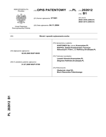 RZECZPOSPOLITA POLSKA (12) OPIS PATENTOWY (19) (21) Numer zgłoszenia: 371001 Urząd Patentowy Rzeczypospolitej Polskiej PL 202612 (13) B1 (11) (51) Int.Cl. B65D 30/08 (2006.01) B65D 30/14 (2006.01) (22) Data zgłoszenia: 04.11.2004 Worek i sposób wytwarzania worka (54) (73) Uprawniony z patentu: (43) Zgłoszenie ogłoszono: KARTONEX Sp. z o.o.,Krasnystaw,PL RAFPOL Zakład Przetwórstwa Tworzyw Sztucznych i Folii L. Z. Rafińscy,Grudziądz,PL 02.05.2005 BUP 09/05 (72) Twórca(y) wynalazku: (45) O udzieleniu patentu ogłoszono: Leszek Górecki,Krasnystaw,PL Zbigniew Rafiński,Grudziądz,PL 31.07.2009 WUP 07/09 (74) Pełnomocnik: PL 202612 B1 Hładyniuk Józef W., Biuro Rzecznika Patentowego 2 PL 202 612 B1 Opis wynalazku Przedmiotem wynalazku jest worek i sposób wytwarzania worka zawierającego nieprzepuszczalną wkładkę. Z polskiego opisu patentowego nr 144288, z opisu stanu techniki, znany jest elastyczny worek, który składa się z zewnętrznego pojemnika, wewnątrz którego osadzona jest wkładka. Wkładka wykonana jest z nieprzepuszczalnego materiału arkuszowego, na przykład z tworzywa sztucznego i jest zamocowana wewnątrz pojemnika za pomocą kleju. Wkładka ta ma postać odrębnego worka i jest wkładana do pojemnika po jego uformowaniu. Z kolei z polskiego opisu zgłoszeniowego nr P-343463 znany jest worek dla produktów, które muszą być zabezpieczone przed dostępem wilgoci. Pojemnik wykonany jest z papieru zaś wkładka z tworzywa sztucznego. Worek taki, w wersji drugiej, składa się z pojemnika wykonanego z odcinka taśmy, którego wzdłużne boki połączone są ze sobą na zakładkę i zamkniętego od dołu poprzez kształtowe złącze. Znany sposób wytwarzania worków w sposób ciągły z taśmy odwijanej z bębna polega na tym, że boki taśmy są zawijane na siebie zaś w miejsce zakładki nanoszony jest klej, po czym całość jest dociskana a następnie tak powstałą rurę tnie się na odcinki, po czym wzdłuż jednej krawędzi cięcia wykonuje się szew. W przypadku wytwarzania worków o większej pojemności, jednocześnie z zawijaniem boków taśmy kształtuje się fałdy skierowane do wnętrza worka. Z kolei w przypadku wytwarzania worków przeznaczonych dla większych ładowności worek formuje się z kilku jednocześnie prowadzonych taśm, przy czym na każdą z nich odrębnie nanosi się klej dla uzyskania w końcowym efekcie wielowarstwowego worka. Dla zapewnienia równomiernego prowadzenia taśmy jest ona wstępnie napięta. Napięcie jest realizowane za pomocą obciążnika stale spoczywającego na obracającej się beli z materiałem. Bela osadzona jest z kolei na osi, której końce ułożyskowane są we wspornikach jednostki odwijającej. Łożyska stanowią otwarte od góry panewki ślizgowe. W znanych przypadkach dotyczących równomiernego prowadzenia taśm papieru a dotyczących składania gazet z wielu warstw, każda warstwa posiada znaczniki, które są w trakcie składania odczytywane przez urządzenia rejestrujące a w przypadku wystąpienia różnic układ kontrolny powoduje zwolnienie lub przyspieszenie odwijania taśmy z danej beli. Rozwiązanie to jest znane z polskiego opisu zgłoszeniowego nr P-357824. Istota worka składającego się z pojemnika oraz trwale zamocowanej w nim wkładki, przy czym pojemnik wykonany jest z odcinka taśmy, której boki zachodzą na siebie i połączone są za pomocą kleju zaś wzdłuż pierwszej, poprzecznej krawędzi biegnie szew, polega na tym, że wkładka ma postać spłaszczonego odcinka rury, przy czym pierwsza poprzeczna krawędź wkładki pokrywa się z pierwszą poprzeczną krawędzią pojemnika zaś druga poprzeczna krawędź wkładki pokrywa się z drugą poprzeczną krawędzią pojemnika. Pojemnik korzystnie posiada wzdłuż każdego boku fałdę skierowaną do wnętrza pojemnika. Wkładka korzystnie posiada wzdłuż każdego boku fałdkę skierowaną do wnętrza wkładki. Wkładka korzystnie zamocowana jest pomiędzy pierwszą ścianą pojemnika a jego fałdami. Pierwsza ścianka wkładki korzystnie zamocowana jest na całej szerokości do pierwszej ściany pojemnika (1) natomiast druga ścianka zamocowana jest do drugiej ściany korzystnie na odcinku mniejszym niż odległość pomiędzy końcami fałd. Wkładka zamocowana jest korzystnie za pośrednictwem szeregu równoległych, poprzecznych złącz klejowych. Pojemnik korzystnie wykonany jest z kilku warstw materiału trwale połączonych ze sobą, przy czym ilość warstw wynosi korzystnie od 2 do 4. Pojemnik korzystnie wykonany jest z papieru zaś wkładka korzystnie wykonana jest z folii z tworzywa sztucznego. Istota sposobu ciągłego wytwarzania worków ze wstępnie napiętej taśmy materiału rozwijanej z beli, w którym na taśmę nanosi się klej po czym krawędzie taśmy zawija się ku sobie na zakładkę a następnie całość dociska się a dalej tnie się w poprzek na odcinki przy czym każdy odcinek przeszywa się wzdłuż jednej krawędzi cięcia, znamienny tym, że równolegle do taśmy materiału prowadzi się wstępnie napiętą i uprzednio spłaszczoną rurę, zaś na taśmę materiału nanosi się dodatkowe porcje kleju, przy czym napięcie taśmy materiału jest większe od napięcia spłaszczonej rury. W trakcie zawijania krawędzi ku sobie korzystnie jednocześnie kształtuje się fałdy. PL 202 612 B1 3 Taśma korzystnie składa się z kilku warstw, które łączy się ze sobą bezpośrednio przed zawijaniem jej krawędzi. Napięcie spłaszczonej rury korzystnie reguluje się poprzez zmniejszenie oporów toczenia beli z nawiniętą spłaszczoną rurą. Zmniejszenie oporów korzystnie przeprowadza się poprzez podparcie każdego końca osi, na której nałożona jest bela ze spłaszczoną rurą na zewnętrznych pierścieniach dwóch łożysk tocznych zamocowanych do wspornika jednostki odwijającej. Dzięki temu wynalazkowi udało się wyeliminować z procesu wytwarzania worków kłopotliwą i odrębną operację