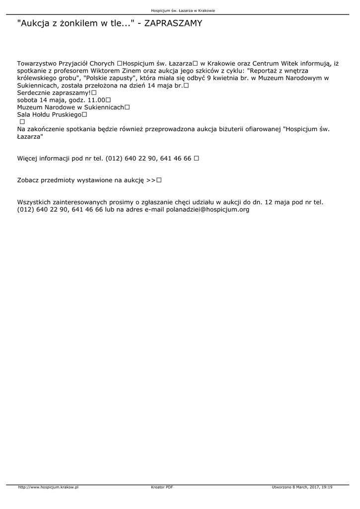 Hospicjum św. Łazarza w Krakowie "Aukcja z żonkilem w tle..." - ZAPRASZAMY Towarzystwo Przyjaciół Chorych Hospicjum św. Łazarza w Krakowie oraz Centrum Witek informują, iż spotkanie z profesorem Wiktorem Zinem oraz aukcja jego szkiców z cyklu: "Reportaż z wnętrza królewskiego grobu", "Polskie zapusty", która miała się odbyć 9 kwietnia br. w Muzeum Narodowym w Sukiennicach, została przełożona na dzień 14 maja br. Serdecznie zapraszamy! sobota 14 maja, godz. 11.00 Muzeum Narodowe w Sukiennicach Sala Hołdu Pruskiego Na zakończenie spotkania będzie również przeprowadzona aukcja biżuterii ofiarowanej "Hospicjum św. Łazarza" Więcej informacji pod nr tel. (012) 640 22 90, 641 46 66 Zobacz przedmioty wystawione na aukcję >> Wszystkich zainteresowanych prosimy o zgłaszanie chęci udziału w aukcji do dn. 12 maja pod nr tel. (012) 640 22 90, 641 46 66 lub na adres e-mail [email protected] http://www.hospicjum.krakow.pl Kreator PDF Utworzono 8 March, 2017, 19:19
