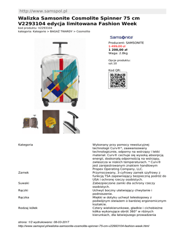 http://www.samspol.pl Walizka Samsonite Cosmolite Spinner 75 cm V2293104 edycja limitowana Fashion Week kod produktu: V2293104 kategoria: Kategorie > BAGAŻ TWARDY > Cosmolite Producent: SAMSONITE 1 499,00 zł 1 200,00 zł Waga: 2.8kg Opcje produktu: szt.10 Kod QR: Kategoria Zamek Suwaki Rączki Rączka Rodzaj kółek Wykonany przy pomocy rewolucyjnej technologii Curv®*, zaawansowany technologicznie, odporny na wstrząsy i lekki materiał. Curv® cechuje się wysoką absorpcją energii, doskonałą odpornością na wstrząsy, zwłaszcza w niskich temperaturach. * Curv® jest zarejestrowanym znakiem handlowym Propex Operating Company, LLC. Przymocowany, 3-cyfrowy zamek szyfrowy z funkcją TSA zapewniający bezpieczną podróż do USA i ochronę rzeczy osobistych. Zabezpieczone zamki dla ochrony rzeczy osobistych. Uchwyt boczny ułatwiający chwytanie i podnoszenie. Miękki w dotyku uchwyt teleskopowy z podwójnym stelażem o bardziej ergonomicznym kształcie. Cztery wielokierunkowe, gładkie i cichobieżne kółka wykonujące obrót 360° w różnych kierunkach, dla łatwiejszego prowadzenia strona: 1/2 wydrukowano: 08-03-2017 http://www.samspol.pl/walizka-samsonite-cosmolite-spinner-75-cm-v22993104-fashion-week.html Kółka Bagaż podręczny Adresówka walizki. 4 kółka Bagaż podręczny dostosowany do zaleceń IATA może zostać zabrany na pokład samolotu. Zalecamy sprawdzenie wymogów poszczególnych linii lotniczych przed podróżą Zdejmowana przywieszka bagażowa na uchwycie walizki. Prosty przycisk otwierania/zamykania plakietki identyfikacyjnej zapewnia prywatność danych. strona: 2/2 wydrukowano: 08-03-2017 http://www.samspol.pl/walizka-samsonite-cosmolite-spinner-75-cm-v22993104-fashion-week.html