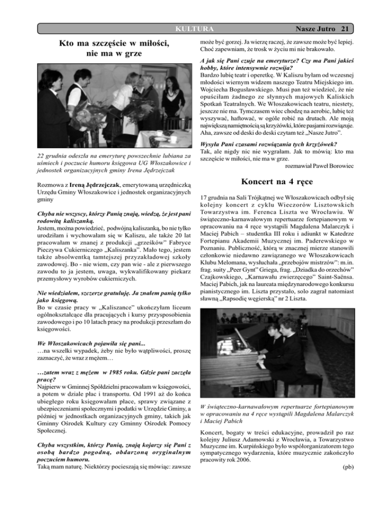 KULTURA Kto ma szczêcie w mi³oci, nie ma w grze 22 grudnia odesz³a na emeryturê powszechnie lubiana za umiech i poczucie humoru ksiêgowa UG W³oszakowice i jednostek organizacyjnych gminy Irena Jêdrzejczak Rozmowa z Iren¹ Jêdrzejczak, emerytowan¹ urzêdniczk¹ Urzêdu Gminy W³oszakowice i jednostek organizacyjnych gminy Chyba nie wszyscy, którzy Pani¹ znaj¹, wiedz¹, ¿e jest pani rodowit¹ kaliszank¹. Jestem, mo¿na powiedzieæ, podwójn¹ kaliszank¹, bo nie tylko urodzi³am i wychowa³am siê w Kaliszu, ale tak¿e 20 lat pracowa³am w znanej z produkcji grzeków Fabryce Pieczywa Cukierniczego Kaliszanka. Ma³o tego, jestem tak¿e absolwentk¹ tamtejszej przyzak³adowej szko³y zawodowej. Bo - nie wiem, czy pan wie - ale z pierwszego zawodu to ja jestem, uwaga, wykwalifikowany piekarz przemys³owy wyrobów cukierniczych. Nie wiedzia³em, szczerze gratulujê. Ja zna³em pani¹ tylko jako ksiêgow¹. Bo w czasie pracy w Kaliszance ukoñczy³am liceum ogólnokszta³c¹ce dla pracuj¹cych i kursy przysposobienia zawodowego i po 10 latach pracy na produkcji przesz³am do ksiêgowoci. Nasze Jutro 21 mo¿e byæ gorzej. Ja wierzê raczej, ¿e zawsze mo¿e byæ lepiej. Choæ zapewniam, ¿e trosk w ¿yciu mi nie brakowa³o. A jak siê Pani czuje na emeryturze? Czy ma Pani jakie hobby, które intensywnie rozwija? Bardzo lubiê teatr i operetkê. W Kaliszu by³am od wczesnej m³odoci wiernym widzem naszego Teatru Miejskiego im. Wojciecha Bogus³awskiego. Musi pan te¿ wiedzieæ, ¿e nie opuci³am ¿adnego ze s³ynnych majowych Kaliskich Spotkañ Teatralnych. We W³oszakowicach teatru, niestety, jeszcze nie ma. Tymczasem wiec chodzê na aerobic, lubiê te¿ wyszywaæ, haftowaæ, w ogóle robiæ na drutach. Ale moj¹ najwiêksz¹ namiêtnoci¹ s¹ krzy¿ówki, które pasjami rozwi¹zuje. Aha, zawsze od deski do deski czytam te¿ Nasze Jutro. Wysy³a Pani czasami rozwi¹zania tych krzy¿ówek? Tak, ale nigdy nic nie wygra³am. Jak to mówi¹: kto ma szczêcie w mi³oci, nie ma w grze. rozmawia³ Pawe³ Borowiec Koncert na 4 rêce 17 grudnia na Sali Trójk¹tnej we W³oszakowicach odby³ siê kolejny koncert z cyklu Wieczorów Lisztowskich Towarzystwa im. Ferenca Liszta we Wroc³awiu. W wi¹teczno-karnawa³owym repertuarze fortepianowym w opracowaniu na 4 rêce wyst¹pili Magdalena Malarczyk i Maciej Pabich studentka III roku i adiunkt w Katedrze Fortepianu Akademii Muzycznej im. Paderewskiego w Poznaniu. Publicznoæ, któr¹ w znacznej mierze stanowili cz³onkowie niedawno zawi¹zanego we W³oszakowicach Klubu Melomana, wys³ucha³a przebojów mistrzów: m.in. frag. suity Peer Gynt Griega, frag. Dziadka do orzechów Czajkowskiego, Karnawa³u zwierzêcego Saint-Saënsa. Maciej Pabich, jak na laureata miêdzynarodowego konkursu pianistycznego im. Liszta przysta³o, solo zagra³ natomiast s³awn¹ Rapsodiê wêgiersk¹ nr 2 Liszta. We W³oszakowicach pojawi³a siê pani... na wszelki wypadek, ¿eby nie by³o w¹tpliwoci, proszê zaznaczyæ, ¿e wraz z mê¿em zatem wraz z mê¿em w 1985 roku. Gdzie pani zaczê³a pracê? Najpierw w Gminnej Spó³dzielni pracowa³am w ksiêgowoci, a potem w dziale p³ac i transportu. Od 1991 a¿ do koñca ubieg³ego roku ksiêgowa³am p³ace, sprawy zwi¹zane z ubezpieczeniami spo³ecznymi i podatki w Urzêdzie Gminy, a póniej w jednostkach organizacyjnych gminy, takich jak Gminny Orodek Kultury czy Gminny Orodek Pomocy Spo³ecznej. Chyba wszystkim, którzy Pani¹, znaj¹ kojarzy siê Pani z osob¹ bardzo pogodn¹, obdarzon¹ oryginalnym poczuciem humoru. Tak¹ mam naturê. Niektórzy pocieszaj¹ siê mówi¹c: zawsze W wi¹teczno-karnawa³owym repertuarze fortepianowym w opracowaniu na 4 rêce wyst¹pili Magdalena Malarczyk i Maciej Pabich Koncert, bogaty w treci edukacyjne, prowadzi³ po raz kolejny Juliusz Adamowski z Wroc³awia, a Towarzystwo Muzyczne im. Kurpiñskiego by³o wspó³organizatorem tego sympatycznego wydarzenia, które muzycznie zakoñczy³o pracowity rok 2006. (pb)