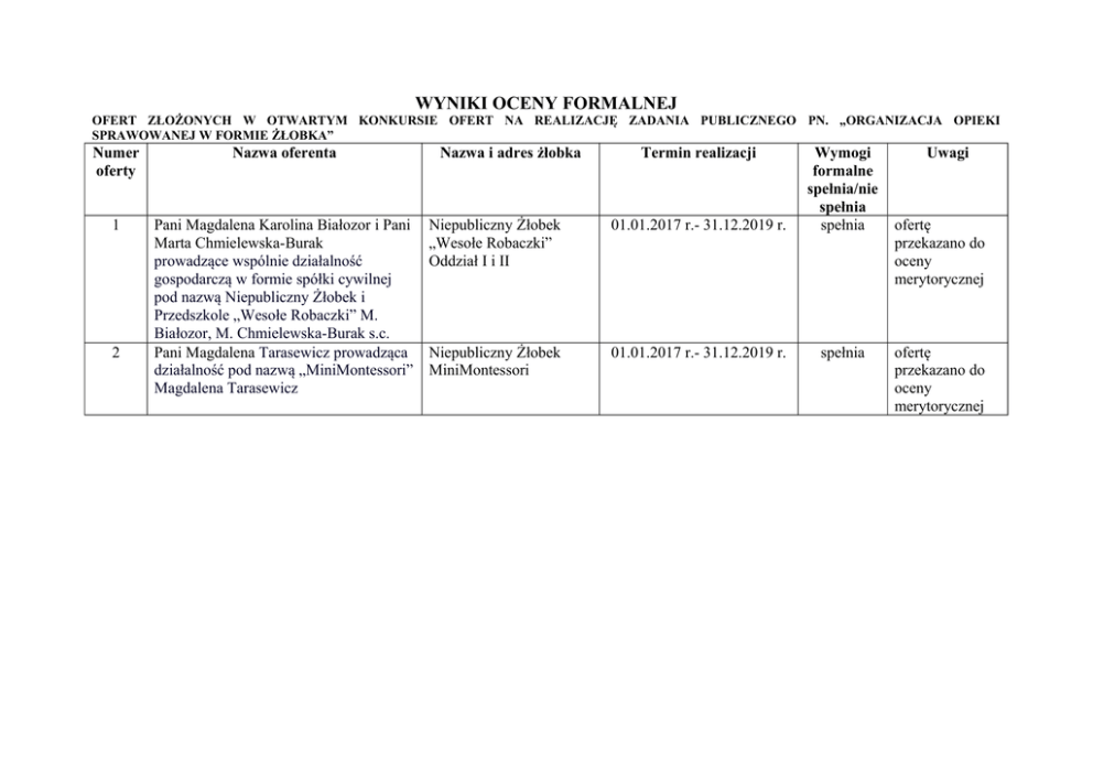 WYNIKI OCENY FORMALNEJ OFERT ZŁOŻONYCH W OTWARTYM KONKURSIE OFERT NA REALIZACJĘ ZADANIA PUBLICZNEGO PN. „ORGANIZACJA OPIEKI SPRAWOWANEJ W FORMIE ŻŁOBKA” Numer oferty Nazwa oferenta 1 Pani Magdalena Karolina Białozor i Pani Marta Chmielewska-Burak prowadzące wspólnie działalność gospodarczą w formie spółki cywilnej pod nazwą Niepubliczny Żłobek i Przedszkole „Wesołe Robaczki” M. Białozor, M. Chmielewska-Burak s.c. Pani Magdalena Tarasewicz prowadząca działalność pod nazwą „MiniMontessori” Magdalena Tarasewicz 2 Nazwa i adres żłobka Termin realizacji Niepubliczny Żłobek „Wesołe Robaczki” Oddział I i II 01.01.2017 r.- 31.12.2019 r. Wymogi formalne spełnia/nie spełnia spełnia Niepubliczny Żłobek MiniMontessori 01.01.2017 r.- 31.12.2019 r. spełnia Uwagi ofertę przekazano do oceny merytorycznej ofertę przekazano do oceny merytorycznej