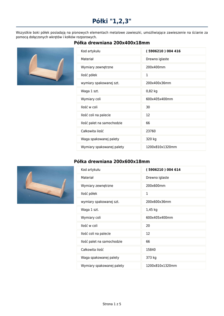 Półki "1,2,3" Wszystkie boki półek posiadają na pionowych elementach metalowe zawieszki, umożliwiające zawieszenie na ścianie za pomocą dołączonych wkrętów i kołków rozporowych. Półka drewniana 200x400x18mm Kod artykułu ( 5906210 ) 004 416 Materiał Drewno iglaste Wymiary zewnętrzne 200x400mm Ilość półek 1 wymiary spakowanej szt. 200x400x36mm Waga 1 szt. 0,82 kg Wymiary coli 600x405x400mm Ilość w coli 30 Ilość coli na palecie 12 Ilość palet na samochodzie 66 Całkowita ilość 23760 Waga spakowanej palety 320 kg Wymiary spakowanej palety 1200x810x1320mm Półka drewniana 200x600x18mm Kod artykułu ( 5906210 ) 004 614 Materiał Drewno iglaste Wymiary zewnętrzne 200x600mm Ilość półek 1 wymiary spakowanej szt. 200x600x36mm Waga 1 szt. 1,45 kg Wymiary coli 600x405x400mm Ilość w coli 20 Ilość coli na palecie 12 Ilość palet na samochodzie 66 Całkowita ilość 15840 Waga spakowanej palety 373 kg Wymiary spakowanej palety 1200x810x1320mm Strona 1 z 5 Półka drewniana 200x800x18mm Kod artykułu ( 5906210 ) 004 812 Materiał Drewno iglaste Wymiary zewnętrzne 200x800cm Ilość półek 1 wymiary spakowanej szt. 200x600x36mm Waga 1 szt. 1,60 kg Wymiary coli 800x405x300mm Ilość w coli 20 Ilość coli na palecie 9 Ilość palet na samochodzie 66 Całkowita ilość 11880 Waga spakowanej palety 313 kg Wymiary spakowanej palety 1200x810x1050mm Półka drewniana 200x400x18mm Kod artykułu ( 5906210 ) 004 423 Materiał Drewno iglaste Wymiary zewnętrzne 200x400mm Ilość półek 2 wymiary spakowanej szt. 200x400x72mm Waga 1 szt. 2,40 kg Wymiary coli 600x405x400mm Ilość w coli 10 Ilość coli na palecie 12 Ilość palet na samochodzie 66 Całkowita ilość 7920 Waga spakowanej palety 313 kg Wymiary spakowanej palety 1200x810x1320mm Strona 2 z 5 Półka drewniana 200x600x18mm Kod artykułu ( 5906210 ) 004 621 Materiał Drewno iglaste Wymiary zewnętrzne 200x600mm Ilość półek 2 wymiary spakowanej szt. 200x600x72mm Waga 1 szt. 2,95 kg Wymiary coli 600x405x400mm Ilość w coli 10 Ilość coli na palecie 12 Ilość palet na samochodzie 66 Całkowita ilość 7920 Waga spakowanej palety 379 kg Wymiary spakowanej palety 1200x810x1320mm Półka drewniana 200x800x18mm Kod artykułu ( 5906210 ) 004 829 Materiał Drewno iglaste Wymiary zewnętrzne 200x800mm Ilość półek 2 wymiary spakowanej szt. 200x800x72mm Waga 1 szt. 3,50 kg Wymiary coli 800x405x400mm Ilość w coli 10 Ilość coli na palecie 9 Ilość palet na samochodzie 66 Całkowita ilość 5940 Waga spakowanej palety 340 kg Wymiary spakowanej palety 1200x810x1320mm Strona 3 z 5 Półka drewniana 200x400x18mm Kod artykułu ( 5906210 ) 004 430 Materiał Drewno iglaste Wymiary zewnętrzne 200x400mm Ilość półek 3 wymiary spakowanej szt. 200x400x72mm Waga 1 szt. 4,57 kg Wymiary coli 800x405x400mm Ilość w coli 10 Ilość coli na palecie 9 Ilość palet na samochodzie 66 Całkowita ilość 5940 Waga spakowanej palety 436 kg Wymiary spakowanej palety 1200x810x1320mm Półka drewniana 200x600x18mm Kod artykułu ( 5906210 ) 004 638 Materiał Drewno iglaste Wymiary zewnętrzne 60x20cm Ilość półek 3 wymiary spakowanej szt. 200x600x90mm Waga 1 szt. 4,70 kg Wymiary coli 800x405x400mm Ilość w coli 8 Ilość coli na palecie 9 Ilość palet na samochodzie 66 Całkowita ilość 4752 Waga spakowanej palety 363 kg Wymiary spakowanej palety 1200x810x1320mm Strona 4 z 5 Półka drewniana 200x800x18mm Kod artykułu ( 5906210 ) 004 836 Materiał Drewno iglaste Wymiary zewnętrzne 200x800mm Ilość półek 3 wymiary spakowanej szt. 200x800x90mm Waga 1 szt. 5,50 kg Wymiary coli 800x405x400mm Ilość w coli 8 Ilość coli na palecie 9 Ilość palet na samochodzie 66 Całkowita ilość 4752 Waga spakowanej palety 421 kg Wymiary spakowanej palety 1200x810x1320mm Strona 5 z 5