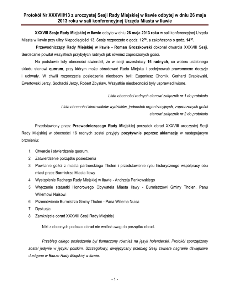Protokół Nr XXXVIII/13 z uroczystej Sesji Rady Miejskiej w Iławie odbytej w dniu 26 maja 2013 roku w sali konferencyjnej Urzędu Miasta w Iławie XXXVIII Sesję Rady Miejskiej w Iławie odbyto w dniu 26 maja 2013 roku w sali konferencyjnej Urzędu Miasta w Iławie przy ulicy Niepodległości 13. Sesję rozpoczęto o godz. 1230, a zakończono o godz. 1455. Przewodniczący Rady Miejskiej w Iławie - Roman Groszkowski dokonał otwarcia XXXVIII Sesji. Serdecznie powitał wszystkich przybyłych radnych jak również zaproszonych gości. Na podstawie listy obecności stwierdził, że w sesji uczestniczy 16 radnych, co wobec ustalonego składu stanowi quorum, przy którym może obradować Rada Miejska i podejmować prawomocne decyzje i uchwały. W chwili rozpoczęcia posiedzenia nieobecny byli: Eugeniusz Chomik, Gerhard Drapiewski, Ewertowski Jerzy, Sochacki Jerzy, Robert Zbysław. Wszystkie nieobecności były usprawiedliwione. Lista obecności radnych stanowi załącznik nr 1 do protokołu Lista obecności kierowników wydziałów, jednostek organizacyjnych, zaproszonych gości stanowi załącznik nr 2 do protokołu Przedstawiony przez Przewodniczącego Rady Miejskiej porządek obrad XXXVIII uroczystej Sesji Rady Miejskiej w obecności 16 radnych został przyjęty pozytywnie poprzez aklamację w następującym brzmieniu: 1. Otwarcie i stwierdzenie quorum. 2. Zatwierdzenie porządku posiedzenia 3. Powitanie gości z miasta partnerskiego Tholen i przedstawienie rysu historycznego współpracy obu miast przez Burmistrza Miasta Iławy 4. Wystąpienie Radnego Rady Miejskiej w Iławie - Andrzeja Pankowskiego 5. Wręczenie statuetki Honorowego Obywatela Miasta Iławy - Burmistrzowi Gminy Tholen, Panu Willemowi Nuisowi 6. Przemówienie Burmistrza Gminy Tholen - Pana Willema Nuisa 7. Dyskusja 8. Zamknięcie obrad XXXVIII Sesji Rady Miejskiej Nikt z obecnych podczas obrad nie wniósł uwag do porządku obrad. Przebieg całego posiedzenia był tłumaczony również na język holenderski. Protokół sporządzony został jedynie w języku polskim. Szczegółowy, dwujęzyczny przebieg Sesji zawiera nagranie dźwiękowe dostępne w Biurze Rady Miejskiej w Iławie. -1- Protokół Nr XXXVIII/13 z uroczystej Sesji Rady Miejskiej w Iławie odbytej w dniu 26 maja 2013 roku w sali konferencyjnej Urzędu Miasta w Iławie Ad.1 Otwarcie i stwierdzenie quorum Przewodniczący Rady Miejskiej - Roman Groszkowski o godzinie 1230 otworzył uroczystą XXXVIII Sesję Rady Miejskiej w Iławie i przewodniczył jej obradom. Na podstawie listy obecności stwierdził, że w Sesji uczestniczy 16 radnych, co stanowi quorum dla podejmowania prawomocnych decyzji i wniosków. Ad.2. Ustalenie porządku posiedzenia Przewodniczący Rady Miejskiej - Roman Groszkowski po przyjęciu porządku w powyższym brzmieniu - przystąpił do jego realizacji. Przewodniczący Rady Miejskiej w Iławie - Roman Groszkowski poinformował, że dzisiejsza sesja ma charakter retrospektywny i podsumowujący. „Spoglądając na dzieje partnerstwa Iławy i Tholen postaramy się jednocześnie dokonać ich oceny. Wszystkie narody w swojej historii mają okresy świetności i słabości. Polaków i Holendrów łączy to, że okresy świetności wypadły jednocześnie. Od połowy XVI w. przez następne stulecie flota holenderska należała do najpotężniejszych na Świecie, w tym samym czasie Polska odgrywała rolę mocarstwa w Europie. Nasi goście z Tholen mieli możliwość w piątek zwiedzić Gdańsk, który jest symbolem potęgi gospodarczej Polski w tym okresie potęgi, której podstawą był eksport zboża, którego odbiorcą byli głównie kupcy z Holandii. Rzeczpospolita w tym czasie nie posiadała właściwe floty wojennej, która chroniłaby taką żywotną gałąź gospodarki, nie miała bo nie musiała, bezpieczeństwo handlu gdańskiego zapewniała flota strategicznego partnera – Holandię, która wtedy była morską potęgą. Jestem głęboko przekonany, że tak jak wtedy współpraca gospodarcza leżała u podstaw mocarstwowości Polski i Zjednoczonych Prowincji, tak i dzisiaj partnerstwo Tholen i Iławy przyczyni się do rozwoju obydwu miast”. Przewodniczący Rady Miejskiej w Iławie powyższym przemówieniem, zapowiedział wystąpienie Burmistrza Miasta Iławy – Włodzimierza Ptasznika, który przedstawił dzieje współpracy Iławy i Tholen. Ad.3. Powitanie gości z miasta partnerskiego Tholen i przedstawienie rysu historycznego współpracy obu miast przez Burmistrza Miasta Iławy W przedmiotowym punkcie głos zabrał Burmistrz Miasta Iławy – Włodzimierz Ptasznik. Serdecznie powitał wszystkich gości, Przewodniczącego Rady, Burmistrza, Radnych Gminy Tholen, Radnych Rady Miejskiej w Iławie. Powiedział, że „19 lat temu, a dokładnie 6 lipca 1994 roku w Tholen została podpisana umowa o przyjaźni i współpracy pomiędzy samorządami gmin - Iławy w Polsce oraz Tholen w Holandii. Swoje podpisy -2- Protokół Nr XXXVIII/13 z uroczystej Sesji Rady Miejskiej w Iławie odbytej w dniu 26 maja 2013 roku w sali konferencyjnej Urzędu Miasta w Iławie na umowach złożyli ówcześni burmistrzowie - ze strony Tholen, Henk van der Munnik oraz ze strony Zarządu Miasta Iławy, Adam Żyliński. Określono wówczas, że współpraca opierać się będzie na trzech dziedzinach: na rozwoju ochrony zdrowia, opieki nad ludźmi starszymi i niepełnosprawnymi, na wymianie programów w dziedzinie sportu, kultury, oświaty i rekreacji, oraz na wymianie wiedzy i doświadczeń w innych dziedzinach zwłaszcza związanych z funkcjonowaniem demokracji lokalnej. Dodał, że zgodnie z podpisanym pierwszym porozumieniem umowa o współpracy została ponownie podpisana na kolejne 10 lat w 2004 roku gdy burmistrzami miast byli w Tholen - Willem Nuis, a w Iławie Jarosław Maśkiewicz. Obie umowy jako instrument stałej współpracy, szczególnie między mieszkańcami zainteresowanych gmin, miały służyć i przyczyniać się do lepszego zrozumienia się 