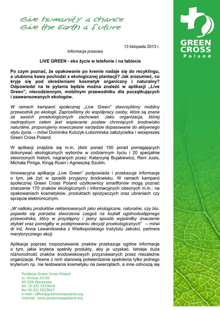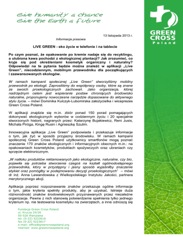 13 listopada 2013 r. Informacja prasowa LIVE GREEN - eko życie w telefonie i na tablecie Po czym poznać, że opakowanie po kremie nadaje się do recyklingu, a ulubiona kawa pochodzi z ekologicznej plantacji? Jak zrozumieć, co kryje się pod określeniami kosmetyk organiczny i naturalny? Odpowiedzi na te pytania będzie można znaleźć w aplikacji „Live Green”, niecodziennym, mobilnym przewodniku dla początkujących i zaawansowanych ekologów. W ramach kampanii społecznej „Live Green” stworzyliśmy mobilny przewodnik po ekologii. Zaprosiliśmy do współpracy osoby, które są znane ze swoich proekologicznych zachowań. Jako organizacja, której nadrzędnym celem jest wspieranie postaw chroniących środowisko naturalne, proponujemy nowoczesne narzędzie dopasowane do aktywnego stylu życia. – mówi Dominika Kulczyk-Lubomirska założycielka i wiceprezes Green Cross Poland. W aplikacji znajdzie się m.in. zbiór ponad 150 porad pomagających dokonywać ekologicznych wyborów w codziennym życiu i 20 specjalnie stworzonych historii, nagranych przez: Katarzynę Bujakiewicz, Reni Jusis, Michała Piróga, Kingę Rusin i Agnieszkę Szulim. Innowacyjna aplikacja „Live Green” podpowiada i przekazuje informacje o tym, jak żyć w sposób przyjazny środowisku. W ramach kampanii społecznej Green Cross Poland użytkownicy smartfonów mogą poznać znaczenie 170 znaków ekologicznych i informacyjnych obecnych m.in.: na opakowaniach kosmetyków, produktach spożywczych oraz ubraniach czy sprzęcie elektronicznym. „W natłoku produktów reklamowanych jako ekologiczne, naturalne, czy bio, pojawiła się potrzeba stworzenia czegoś na kształt ogólnodostępnego przewodnika, który w przystępny i jasny sposób wyjaśniłby znaczenie etykiet oraz pomógłby w podejmowaniu decyzji proekologicznych” – mówi dr inż. Anna Lewandowska z Wielkopolskiego Instytutu Jakości, partnera merytorycznego akcji. Aplikacja poprzez rozpoznawanie znaków przekazuje ogólne informacje o tym, jakie kryteria spełniły produkty, aby je uzyskać. Istnieje duża różnorodność znaków środowiskowych przyznawanych przez niezależne organizacje. Pewne z nich stanowią potwierdzenie spełnienia tylko jednego kryterium np. nie testowania kosmetyku na zwierzętach, a inne odnoszą się Fundacja Green Cross Poland ul. Krucza 24/26 00-526 Warszawa tel. (0-22) 5223616 fax (0-22) 5223617 e-mail: [email protected] internet: www.greencrosspoland.org do wielu różnych wymagań dotyczących pochodzenia surowców, procesów produkcyjnych czy samego opakowania. W aplikacji nie zabrakło również oznaczeń związanych z żywością ekologiczną, potwierdzających, że dany produkt został wytworzony zgodnie z zasadami rolnictwa ekologicznego. Znaki można odczytać po pobraniu i uruchomieniu aplikacji, a następnie skierowaniu telefonu lub tabletu na wybrane oznaczenie i naciśnięcie przycisku „skanuj znak”. Dane oznaczenie można również wyszukać poprzez zakładkę „galeria znaków” w aplikacji. Innym elementem zawartym w aplikacji jest zbiór 20 opowiadań o tematyce ekologicznej. Historie powstały specjalnie na potrzeby kampanii Green Cross Poland. W ich nagraniu wzięły udział polskie gwiazdy, którym bliska jest ekologia. Aplikacja „Live Green” zawiera także zestaw porad ekologicznych, które podpowiadają, jak dbać mądrze o środowisko, na co zwracać uwagę kupując kosmetyki, jak ekologiczne jeździć samochodem, dlaczego skręcać kaloryfery i zamykać okna przed wyjściem z mieszkania. Partnerami merytorycznymi kampanii są Wielkopolski Instytut Jakości we współpracy z Uniwersytetem Ekonomicznym w Poznaniu. Green Cross Poland (GCPL) jest polskim oddziałem międzynarodowej organizacji Zielonego Krzyża (Green Cross International), trzeciej, co do wielkości pozarządowej organizacji ekologicznej non-profit na świecie. Swoją działalność w Polsce rozpoczęła w lutym 2010 roku, realizując od tego czasu liczne projekty, których celem jest wypracowywanie nowych rozwiązań na rzecz ochrony środowiska i zrównoważonego rozwoju. Green Cross Poland jest platformą dialogu pomiędzy biznesem, administracją, organizacjami pozarządowymi oraz ośrodkami naukowymi. Warsztaty strategiczne, debaty wysokiego szczebla, współpraca z polskimi i zagranicznymi partnerami to tylko niektóre z działań podejmowanych przez GCPL w zakresie trzech głównych kierunków aktywności: zielonej gospodarki, gospodarki wodnej oraz zielonych miast i gmin. Organizacja aktywnie uczestniczy w społecznych konsultacjach aktów prawnych i międzynarodowych strategii. Green Cross International został założony przez Michaiła Gorbaczowa w 1993 roku. Od czterech lat przewodniczącym Rady Dyrektorów jest Jan Kulczyk. Polski oddział Green Cross założyła w lutym 2010 r. Dominika Kulczyk-Lubomirska. Kontakt: Donata Kałużna Dyrektor operacyjny, COO tel. kom. 505 422 734 [email protected] www.greencrosspoland.org Fundacja Green Cross Poland ul. Krucza 24/26 00-526 Warszawa tel. (0-22) 5223616 fax (0-22) 5223617 e-mail: [email protected] internet: www.greencrosspoland.org Michalina Dolińska Senior Consultant tel. kom. 694 475 302 [email protected] Fundacja Green Cross Poland ul. Krucza 24/26 00-526 Warszawa tel. (0-22) 5223616 fax (0-22) 5223617 e-mail: [email protected] internet: www.greencrosspoland.org