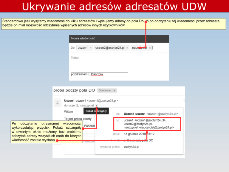 Ukrywanie adresów adresatów UDW Standardowo jeśli wysyłamy wiadomość do kilku adresatów i wpisujemy adresy do pola Do, to po odczytaniu tej wiadomości przez adresata będzie on miał możliwość odczytania wpisanych adresów innych użytkowników. Po odczytaniu otrzymanej wiadomości wykorzystując przycisk Pokaż szczegóły w otwartym oknie możemy bez problemu odczytać adresy wszystkich osób do których wiadomość została wysłana Ukrywanie adresatów UDW Aby uniemożliwić odczytanie adresów osób do których wiadomość została wysłana nie wpisujmy ich w pole DO lecz wybierzmy pole oznaczone UDW (ukryte do wiadomości) Po odczytaniu otrzymanej wiadomości wykorzystując przycisk Pokaż szczegóły w otwartym oknie nie będziemy widzieli adresów innych użytkowników lecz tylko swój. Automatyczny podpis pod wiadomością Według netykiety, każda wiadomość powinna być podpisana. Aby nie wpisywać treści pozdrowień w każdej wiadomości możemy zdefiniować tekst, który będzie pojawiał się jako podpis w każdej nowo tworzonej wiadomości. Aby to skonfigurować wybieramy ikonę i z menu opcję Ustawienia. W otwartym oknie w zakładce Ogólne znajdujemy opcje Podpis Po zaznaczeniu pola wyboru, w edytorze możemy zredagować dołączaną treść. Domyślnie podpis jest umieszczany pod treścią wiadomości, na którą odpowiadamy, dlatego warto zaznaczyć pole, aby nasz podpis był umieszczany nad treścią wiadomości, na którą odpowiadamy. Wiadomość o nieobecności Nie zawsze korzystając z poczty jesteśmy w stanie korespondencję odebrać i na nią odpowiedzieć. Stworzono więc mechanizm dzięki któremu pod naszą nieobecność na otrzymaną wiadomość zostanie wysłana automatyczna odpowiedź. Konfiguracji dokonujemy wybierając ikonę i opcje Ustawienia. W otwartym oknie w zakładce Ogólne znajdujemy opcje Wiadomość o nieobecności i zaznaczamy pole wyboru. Edytujemy okres nieobecności ustawiając daty. W otwartym edytorze redagujemy wiadomość, która zostanie automatycznie odesłana wpisując temat i treść wiadomości. Po zredagowaniu wiadomości zapisujemy ją wciskając przycisk Zapisz zmiany. Jeśli zapiszemy ustawienia w górnej części okna poczty pojawi się komunikat, który będzie widniał do momentu wybrania polecenia Zakończ teraz pozwalającego na wyłączenie ustawionej opcji. Filtrowanie wiadomości Blokowanie adresów Nie zawsze chcemy, aby wszystkie wiadomości zostały umieszczane w skrzynce odbiorczej. Wiadomości, które są przez nas uznawane jako spam możemy zablokować. Aby zablokować wiadomość, po jej odczytaniu klikamy na ikonę. W otwartym oknie wybieramy polecenie Zablokuj…. Jeśli chcemy potwierdzić zablokowanie adresu wybieramy przycisk Zablokuj Komunikat o wykonaniu blokady pojawi się w oknie z wiadomością. Aby sprawdzić poprawność wykonanych czynności musimy wybrać w opcjach ustawień zakładkę Dolnej części okna znajdziemy informacje o zablokowanym adresie. Kliknięcie na opcję Odblokuj spowoduje wyłączenie blokady adresu. Ustawienia filtrowania Poniżej wygląd okna po ustawieniu filtr i zablokowaniu adresu Informacja o konfiguracji filtra. Po otrzymaniu wiadomości gdzie w temacie (subject) będzie występował ciąg znaków 6a1 wiadomość to zostanie przeniesiona do kosza (Usuń) Lista zablokowanych adresów, z których wiadomości będą umieszczane w etykiecie Spam Co musimy umieć? 1 Jak działa opcja UDW 2 Korzystanie z opcji UDW podczas wysyłania wiadomości 3 Redagowanie podpisu dołączanego automatycznie do wiadomości 4 Redagowanie automatycznie wysyłanej odpowiedzi o nieobecności 5 Tworzenie filtrów wiadomości 6 Blokowanie wybranych adresów