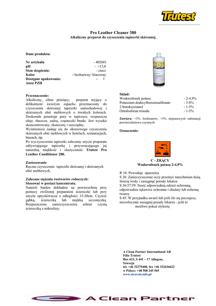 Pro Leather Cleaner 380 Alkaliczny preparat do czyszczenia tapicerki skórzanej. Dane produktu: Nr artykułu pH Stan skupienia: Kolor Dostępne opakowania: Atest PZH - 402601 - >13,0 - ciecz - bezbarwny/ klarowny - 1 Przeznaczenie: Alkaliczny, silnie pieniący, preparat myjący o delikatnym/ świeżym zapachu przeznaczony do czyszczenia skórzanej tapicerki samochodowej i skórzanych obić meblowych o trwałych kolorach. Doskonale penetruje pory w tapicerce, rozpuszcza oleje, tłuszcze, sadzę, cząsteczki brudu. Jest wysoko skoncentrowany, skuteczny i oszczędny. Wyśmienicie nadaję się do okresowego czyszczenia skórzanych obić meblowych w hotelach, restauracjach, biurach, itp. Po wyczyszczeniu tapicerki zalecamy użycie preparatu odżywiającego tapicerkę i przywracającego jej naturalną miękkość i elastyczność Trutest Pro Leather Conditioner 280. Zastosowanie Ręczne czyszczenie tapicerki skórzanej i skórzanych obić meblowych. Zalecane stężenia roztworów roboczych: Stosować w postaci koncentratu. Nanieść bardzo dokładnie na powierzchnię przy pomocy zwilżonej preparatem ściereczki lub przy użyciu opryskiwacza z odległości 15-20cm. Czyścić gąbką, ściereczką lub miękką szczoteczką. Rozpuszczone zanieczyszczenia zebrać czystą ściereczką z mikrofazy. Skład: Wodorotlenek potasu Potassium dodecylbenzensulfonate 2-butoksyetanol Ortofosforan trisodu - 2-4,9% - 3-8% - 1-5% - 1-5% Zawiera: <5% fosforanów, <5% niejonowych substancji powierzchniowo czynnych Oznaczenie: C - ŻRĄCY Wodorotlenek potasu 2-4,9% R 34: Powoduje oparzenia S 26: Zanieczyszczone oczy przemyć natychmiast dużą ilością wody i zasięgnąć porady lekarza S 36/37/39: Nosić odpowiednią odzież ochronną, odpowiednie rękawice ochronne i okulary lub ochronę twarzy S 45: W przypadku awarii lub jeśli źle się poczujesz, niezwłocznie zasięgnij porady lekarza - jeśli to możliwe pokaż etykietę A Clean Partner International AB Filia Trutest Box 623, S 441 – 17 Alingsas, Szwecja tel. +46 32279400, fax +46 322636622 w Polsce: +48 508 245 565 www.strovels.info.pl