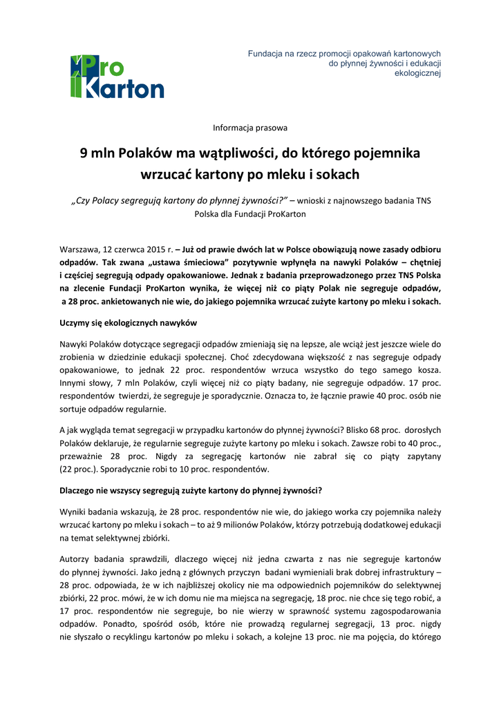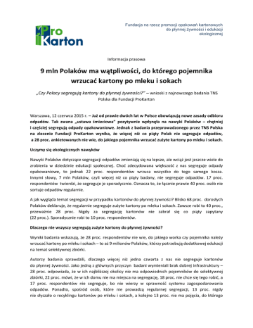 Fundacja na rzecz promocji opakowań kartonowych do płynnej żywności i edukacji ekologicznej Informacja prasowa 9 mln Polaków ma wątpliwości, do którego pojemnika wrzucać kartony po mleku i sokach „Czy Polacy segregują kartony do płynnej żywności?” – wnioski z najnowszego badania TNS Polska dla Fundacji ProKarton Warszawa, 12 czerwca 2015 r. – Już od prawie dwóch lat w Polsce obowiązują nowe zasady odbioru odpadów. Tak zwana „ustawa śmieciowa” pozytywnie wpłynęła na nawyki Polaków – chętniej i częściej segregują odpady opakowaniowe. Jednak z badania przeprowadzonego przez TNS Polska na zlecenie Fundacji ProKarton wynika, że więcej niż co piąty Polak nie segreguje odpadów, a 28 proc. ankietowanych nie wie, do jakiego pojemnika wrzucać zużyte kartony po mleku i sokach. Uczymy się ekologicznych nawyków Nawyki Polaków dotyczące segregacji odpadów zmieniają się na lepsze, ale wciąż jest jeszcze wiele do zrobienia w dziedzinie edukacji społecznej. Choć zdecydowana większość z nas segreguje odpady opakowaniowe, to jednak 22 proc. respondentów wrzuca wszystko do tego samego kosza. Innymi słowy, 7 mln Polaków, czyli więcej niż co piąty badany, nie segreguje odpadów. 17 proc. respondentów twierdzi, że segreguje je sporadycznie. Oznacza to, że łącznie prawie 40 proc. osób nie sortuje odpadów regularnie. A jak wygląda temat segregacji w przypadku kartonów do płynnej żywności? Blisko 68 proc. dorosłych Polaków deklaruje, że regularnie segreguje zużyte kartony po mleku i sokach. Zawsze robi to 40 proc., przeważnie 28 proc. Nigdy za segregację kartonów nie zabrał się co piąty zapytany (22 proc.). Sporadycznie robi to 10 proc. respondentów. Dlaczego nie wszyscy segregują zużyte kartony do płynnej żywności? Wyniki badania wskazują, że 28 proc. respondentów nie wie, do jakiego worka czy pojemnika należy wrzucać kartony po mleku i sokach – to aż 9 milionów Polaków, którzy potrzebują dodatkowej edukacji na temat selektywnej zbiórki. Autorzy badania sprawdzili, dlaczego więcej niż jedna czwarta z nas nie segreguje kartonów do płynnej żywności. Jako jedną z głównych przyczyn badani wymieniali brak dobrej infrastruktury – 28 proc. odpowiada, że w ich najbliższej okolicy nie ma odpowiednich pojemników do selektywnej zbiórki, 22 proc. mówi, że w ich domu nie ma miejsca na segregację, 18 proc. nie chce się tego robić, a 17 proc. respondentów nie segreguje, bo nie wierzy w sprawność systemu zagospodarowania odpadów. Ponadto, spośród osób, które nie prowadzą regularnej segregacji, 13 proc. nigdy nie słyszało o recyklingu kartonów po mleku i sokach, a kolejne 13 proc. nie ma pojęcia, do którego Fundacja na rzecz promocji opakowań kartonowych do płynnej żywności i edukacji ekologicznej pojemnika wrzucać takie kartony. To pokazuje, że z jednej strony większość Polaków widzi potrzebę stworzenia lepiej zorganizowanej infrastruktury, zaś z drugiej niezbędna jest właściwa i systematyczna edukacja ekologiczna. Co zachęca Polaków do segregacji? Tym, co mogłoby przekonać badanych do segregacji kartonów po mleku i sokach, jest przede wszystkim zapewnienie łatwego dostępu do pojemników do selektywnej zbiórki (33 proc.), posiadanie odpowiednich pojemników w domu (23 proc.), pewność, że system zarządzania odpadami działa rzetelnie (22 proc.) oraz instrukcja, która w prosty sposób wyjaśniałaby zasady segregacji (14 proc.). Blisko jedna piąta osób, które nie segregują kartonów do płynnej żywności (18 proc.), deklaruje, że nic nie skłoniłoby ich do zmiany przyzwyczajeń i rozpoczęcia segregacji kartonów. Kto ma edukować? Badacze zapytali, kto zdaniem respondentów powinien odpowiadać za edukację dotyczącą właściwej segregacji kartonów. Dla 23 proc. Polaków to zadanie należy do władz samorządowych (miasta, gminy, województwa). Według 15 proc. edukacja na ten temat powinna przebiegać przede wszystkim w szkole, zaś 13 proc. respondentów odpowiedziało, że odpowiedzialność za nią ponoszą media. Wyniki badania podsumowuje Jan Jasiński, prezes Fundacji ProKarton – Choć coraz więcej Polaków regularnie segreguje kartony po mleku i sokach. Z uzyskanych odpowiedzi wynika, że największym wyzwaniem pozostaje nadal dostęp do pojemników na selektywną zbiórkę odpadów opakowaniowych, których często brakuje w najbliższej okolicy. Bardzo potrzebna jest też szersza edukacja społeczna na temat problematyki zagospodarowania odpadów. Polacy chcą otrzymywać proste i czytelne instrukcje, które wyjaśnią im, gdzie wrzucać poszczególne frakcje odpadów opakowaniowych. *** O twórcach badania: Fundacja ProKarton została założona w lipcu 2011 r. przez producentów materiału opakowaniowego do mleka i soków w Polsce. Jej celem jest popularyzacja kartonów do płynnej żywności, jako opakowań nowoczesnych i zaawansowanych pod względem ekologicznym, a także działanie na rzecz edukacji ekologicznej. Więcej informacji o działaniach fundacji na stronie: www.prokarton.org Metoda badawcza: Badanie przeprowadzone przez TNS Polska na zlecenie Fundacji ProKarton, wykonano w dniach 8-13 maja 2015 br. W badaniu wzięła udział reprezentatywna grupa dorosłych Polaków – 1006 osób powyżej 15 roku życia. Odpowiedzi uzyskiwano za pomocą wywiadów bezpośrednich, wspomaganych komputerowo (CAPI).